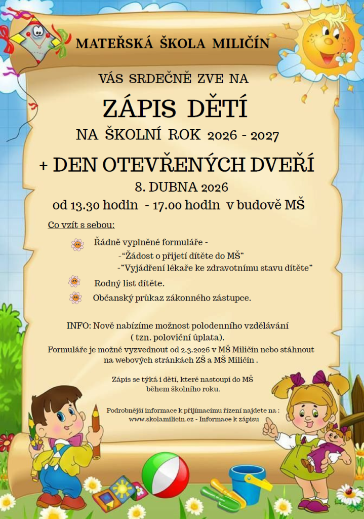Zápis do MŠ na školní rok 2026-2027-8. dubna 2026 od 13.30 do 17:00 hodin