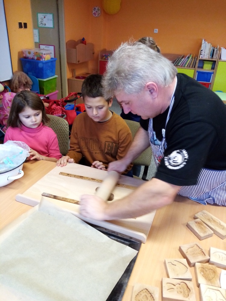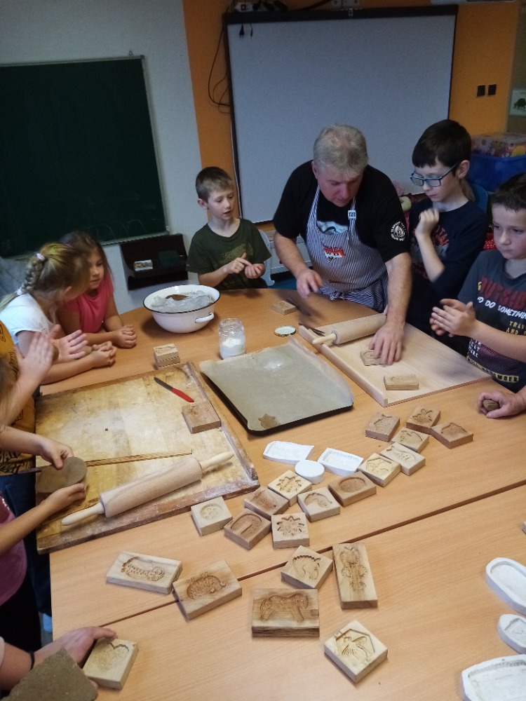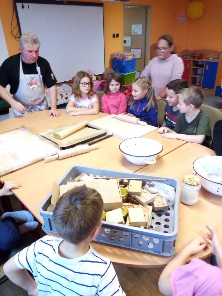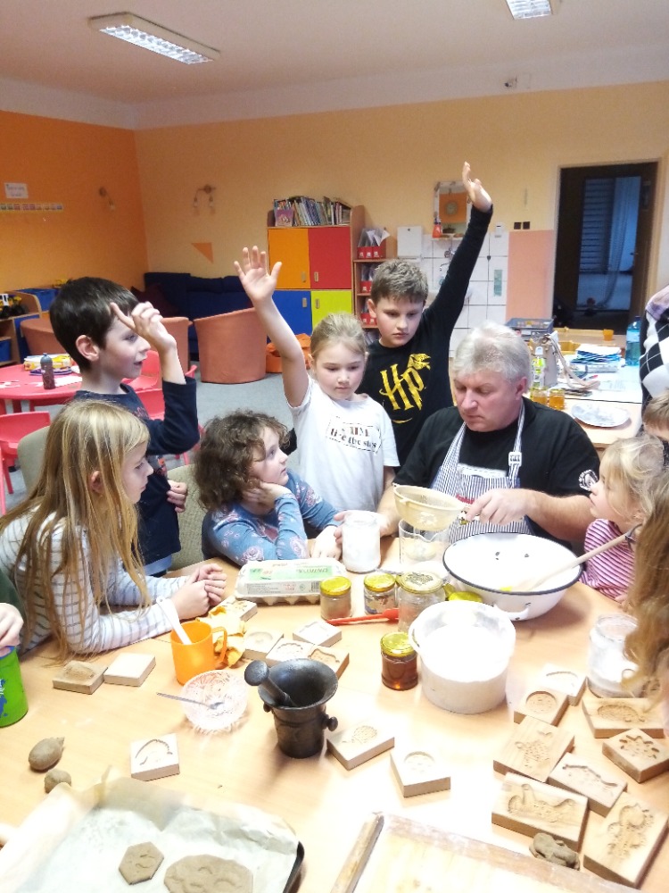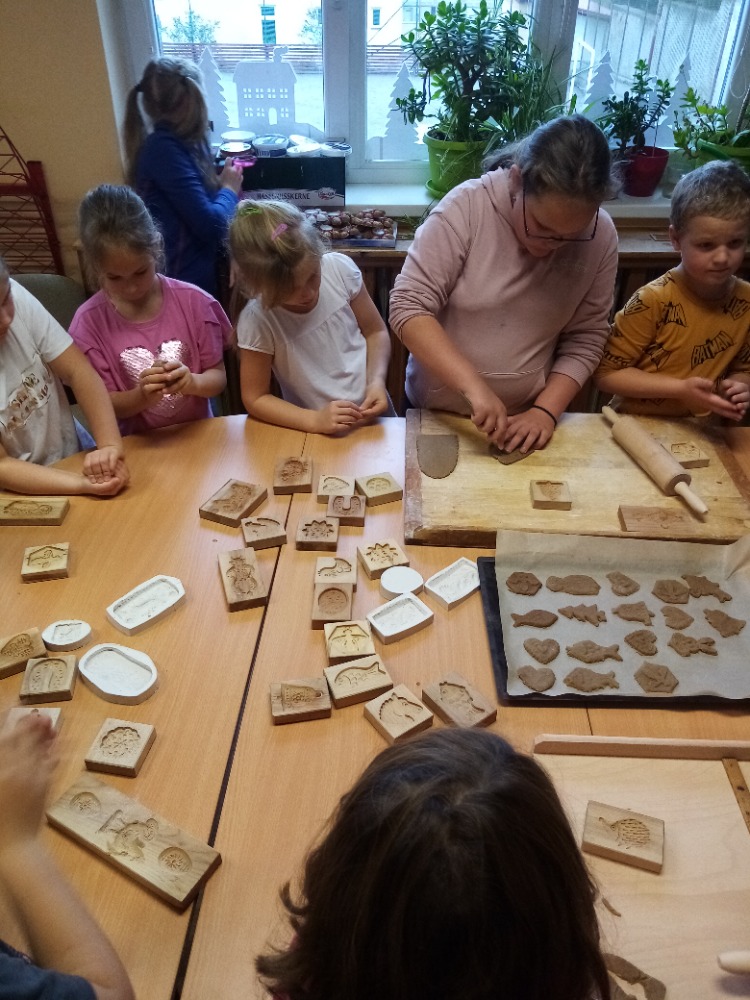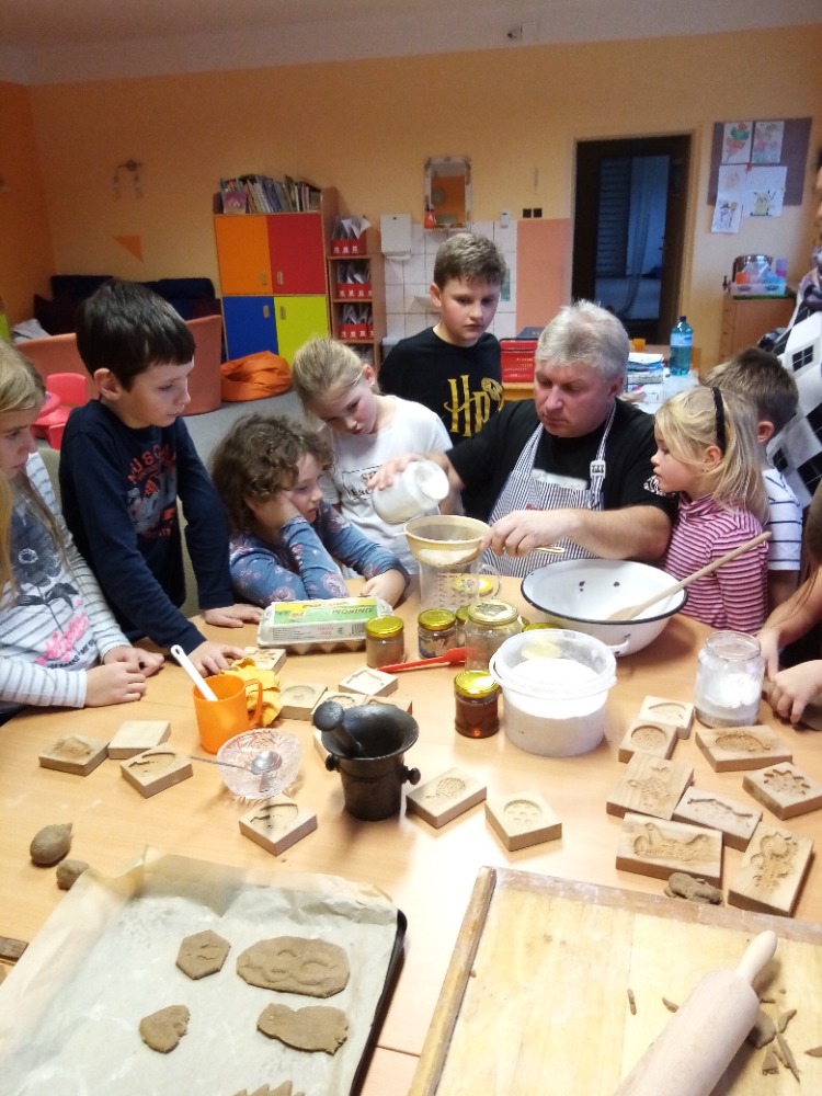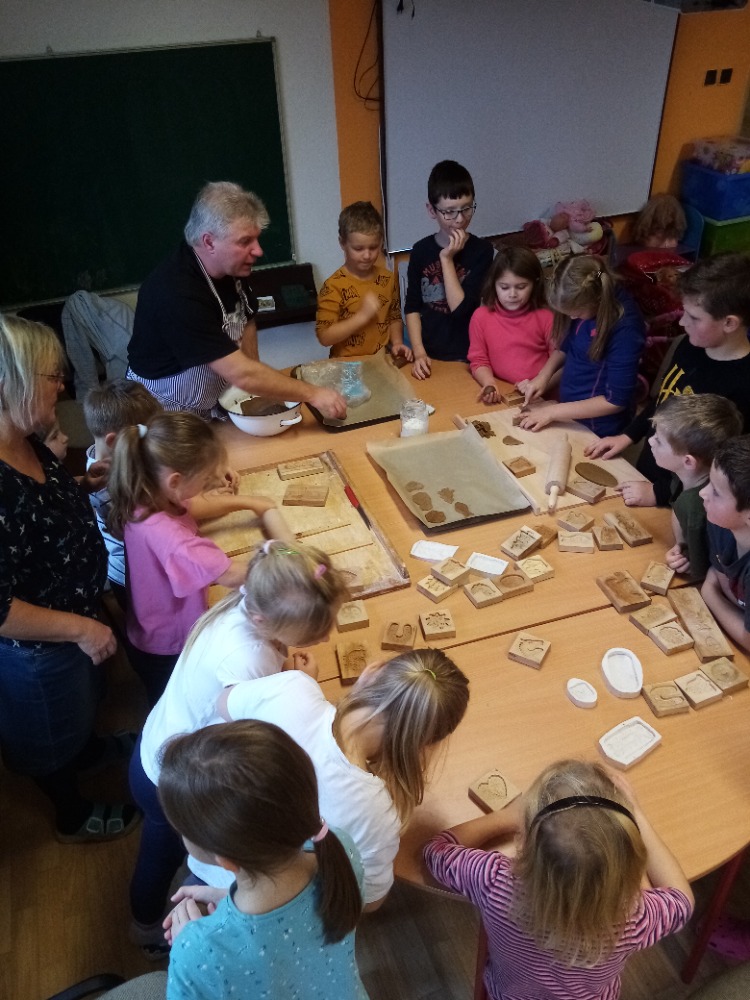 V pondělí 28.11.2022 se konalo ve Školní družině pečení perníčků do dřevěných forem s panem M. Dvořákem ze Semtínka. Na začátku pečení pan Dvořák dětem vysvětlil a ukázal, jak správně formy používat. Každý dostal kousek těsta, které si uválel a následně si mohl vybrat dvě různé formičky např. prasátko, čerta, včelu, hvězdu, zvoneček, podkovu atd. Když děti vyndaly z forem hotový perníček, položily ho na pekáč a netrpělivě čekaly, jak se jim v troubě upeče. Každému se jeho perníček povedl a děti si ho mohly rovnou sníst nebo odnést domů. Nakonec dětem pan Dvořák ukázal, jak vyrobit koření do těsta. Tímto ještě jednou děkujeme panu Dvořákovi za odborný výklad a navození vánoční atmosféry. Dětem se celé pečení líbilo a budeme se těšit na příští.