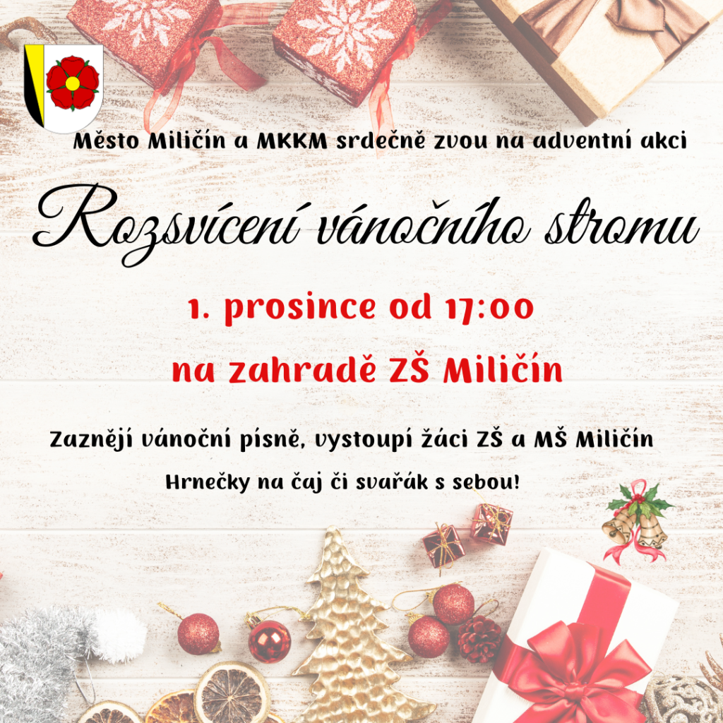 Akce se koná 1. prosince od 17:00 na zahradě ZŠ Miličín. Připraveno je vystoupení žáků ZŠ a MŠ Miličín, kteří zazpívají vánoční písně. Nezapomeňte si vzít hrnečky na čaj nebo svařák!