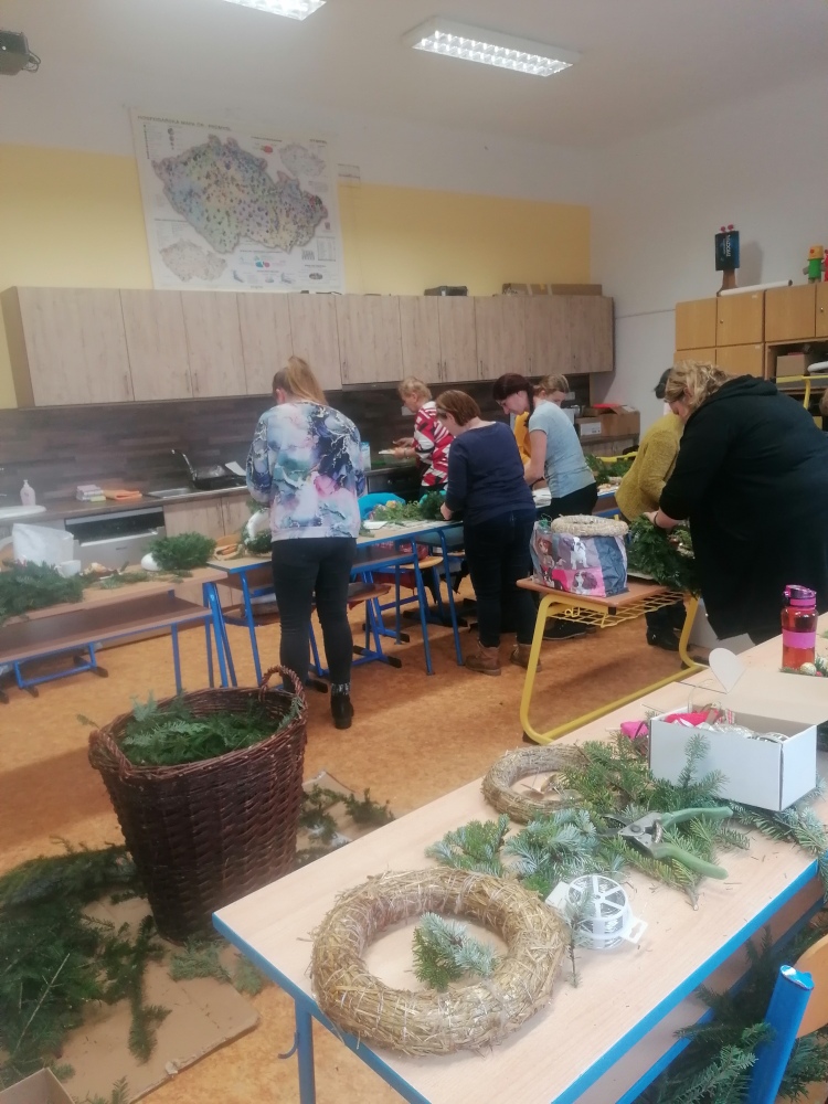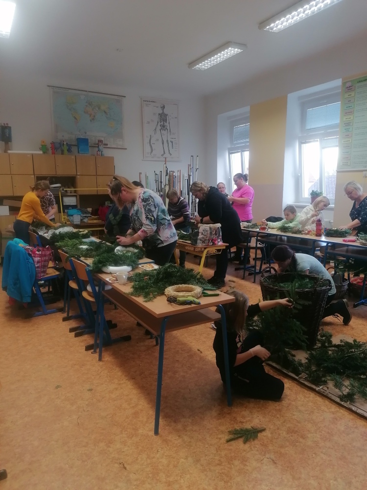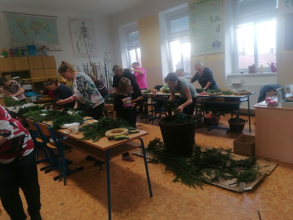 Setkání pořádané ZŠ Miličín zvalo veřejnost na výrobu vánočních věnců a dekorací z připraveného chvojí a jmelí. Pokud jste přišli nepřipraveni, nebyl problém si zakoupit na místě korpusy nebo svíčky. Na vše se myslelo.