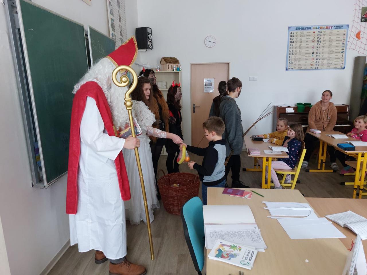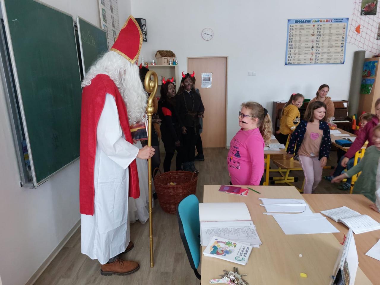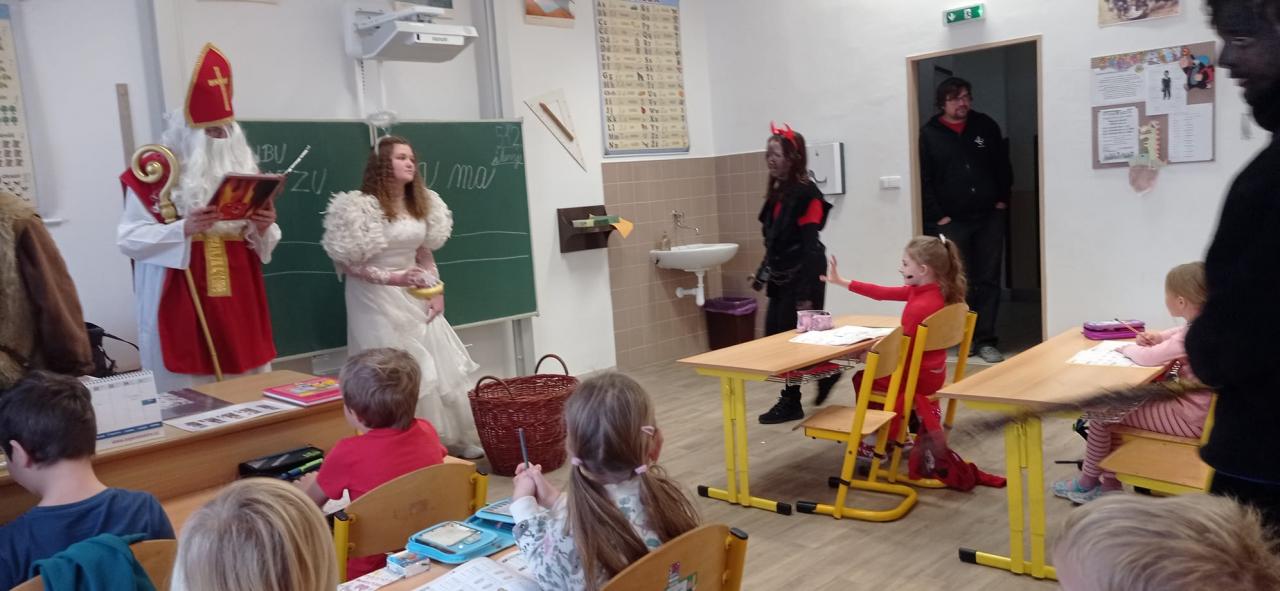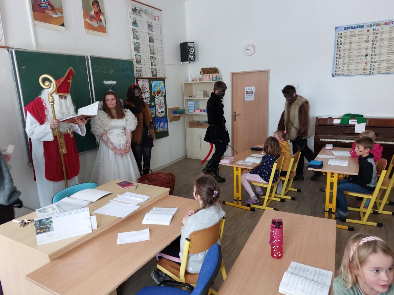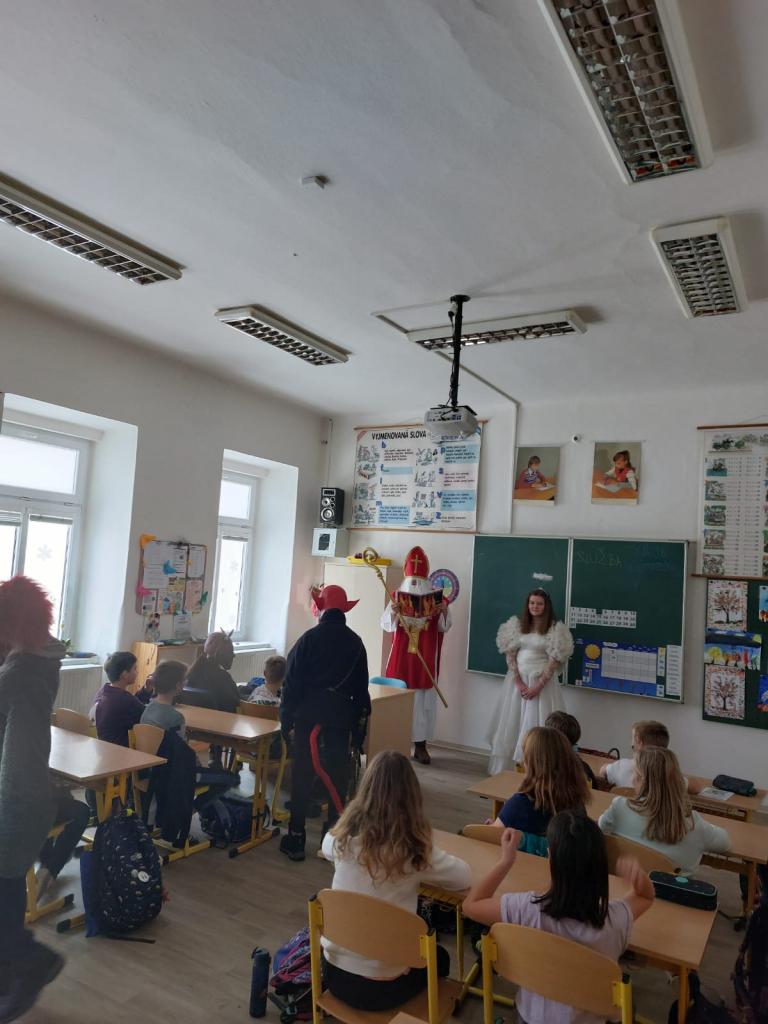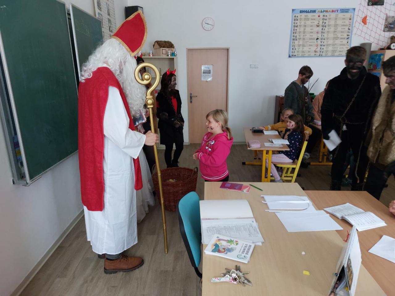 Jako již tradičně chodil u nás ve škole sv. Mikuláš se svou družinou. Zavítali do všech tříd ZŠ i mateřinky, aby zjistili, kdo se jak po celý rok choval. Naštěstí žádný z hříchů našich žáků nebyl natolik závažný, aby muselo být dítko odneseno, a tak zůstali všichni žáci ve svých lavicích. Po přednesení básní či zazpívání, byli všichni odměněni balíčky z rukou anděla. Družina zavítala i do sborovny či jídelny, ani zde se pytle nenaplnily, a tak museli čerti odejít s prázdnou.