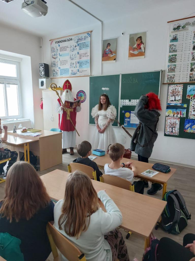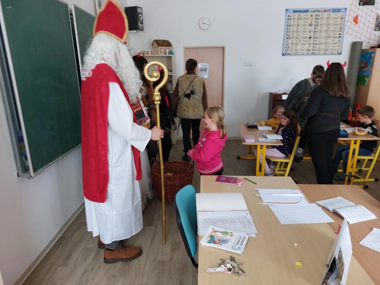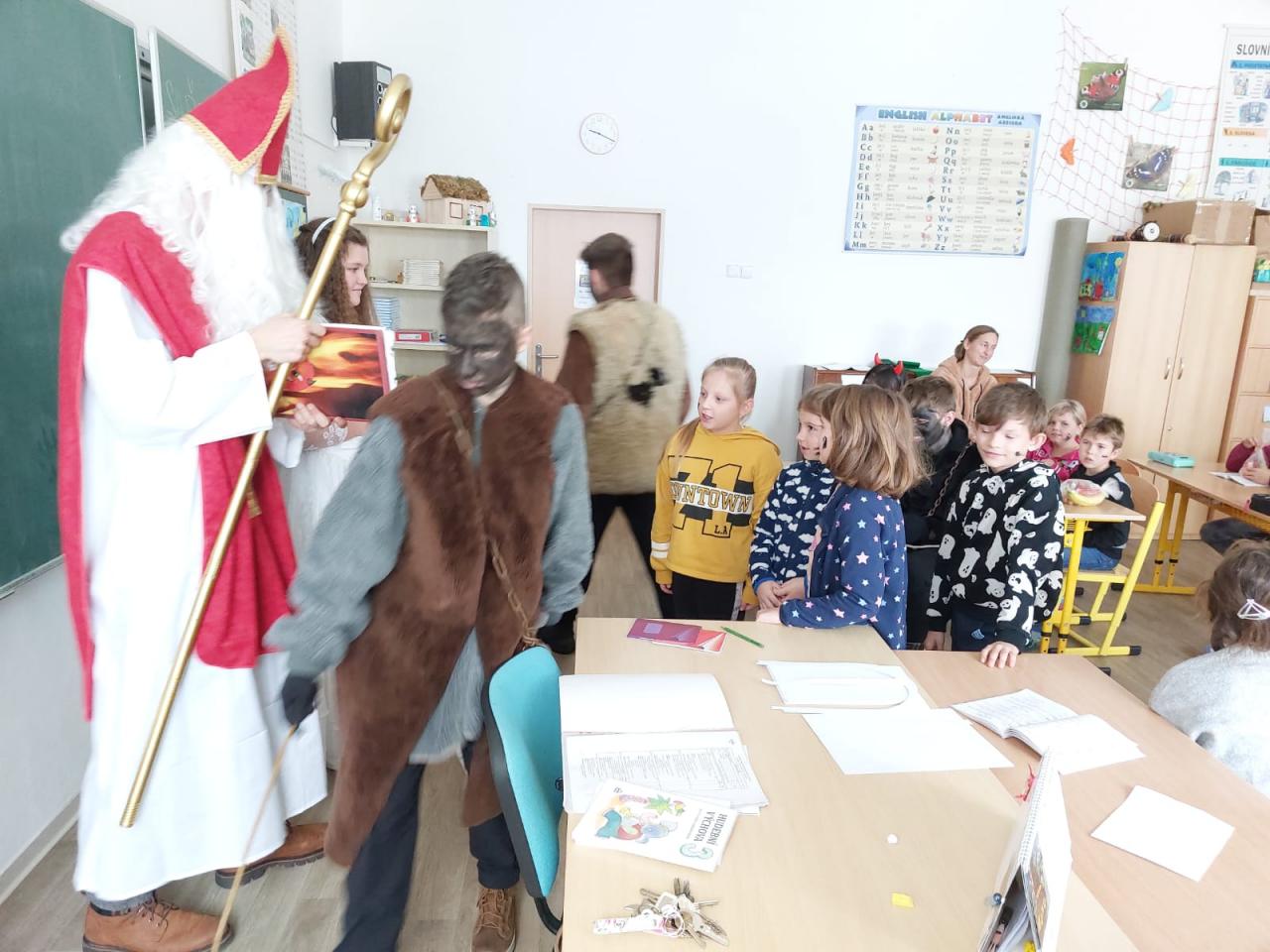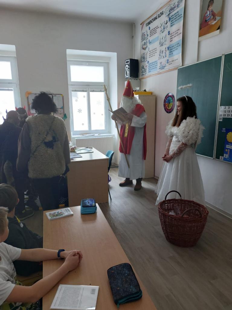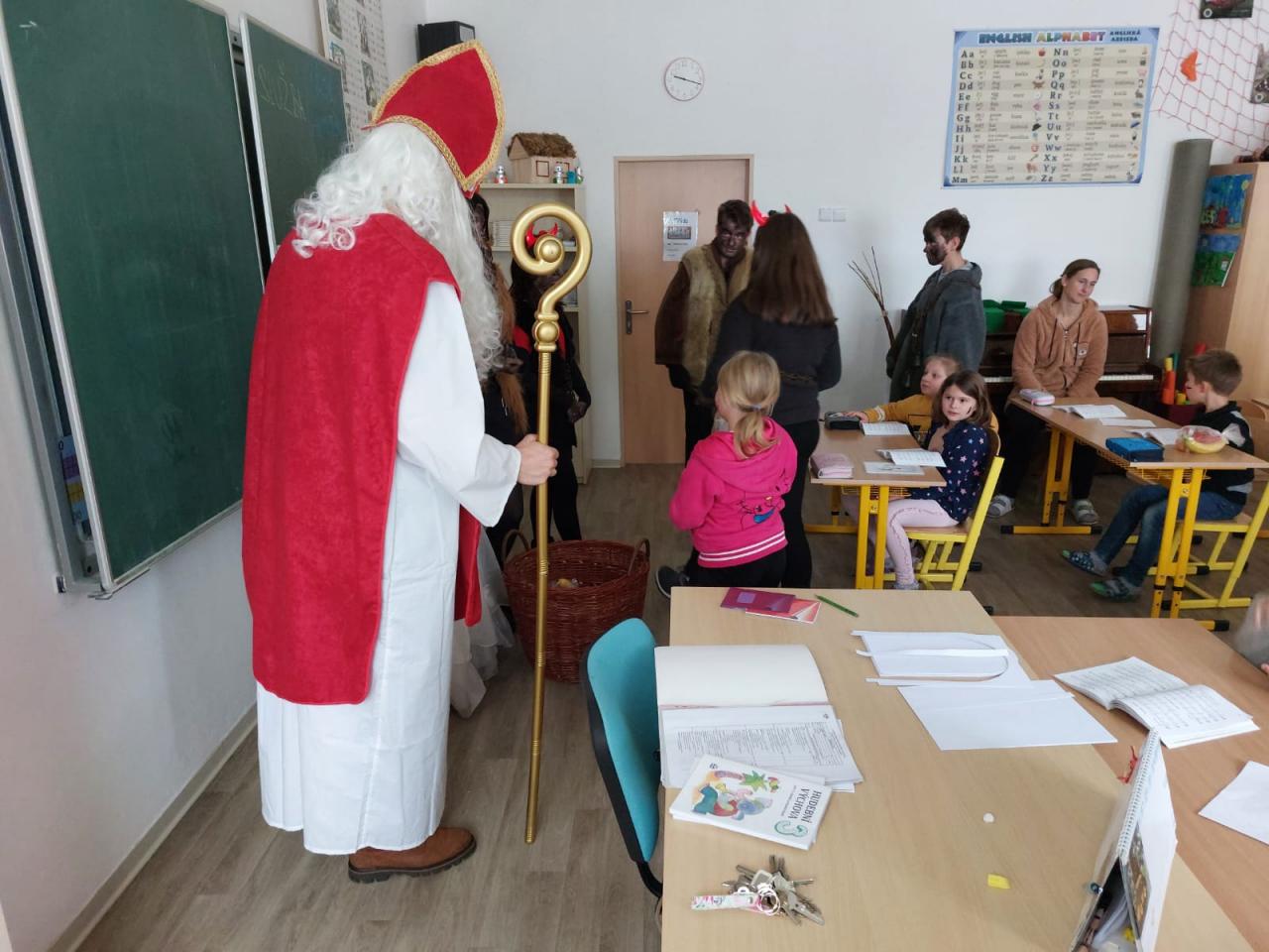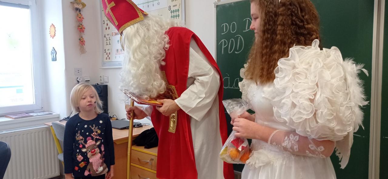 Jako již tradičně chodil u nás ve škole sv. Mikuláš se svou družinou. Zavítali do všech tříd ZŠ i mateřinky, aby zjistili, kdo se jak po celý rok choval. Naštěstí žádný z hříchů našich žáků nebyl natolik závažný, aby muselo být dítko odneseno, a tak zůstali všichni žáci ve svých lavicích. Po přednesení básní či zazpívání, byli všichni odměněni balíčky z rukou anděla. Družina zavítala i do sborovny či jídelny, ani zde se pytle nenaplnily, a tak museli čerti odejít s prázdnou.