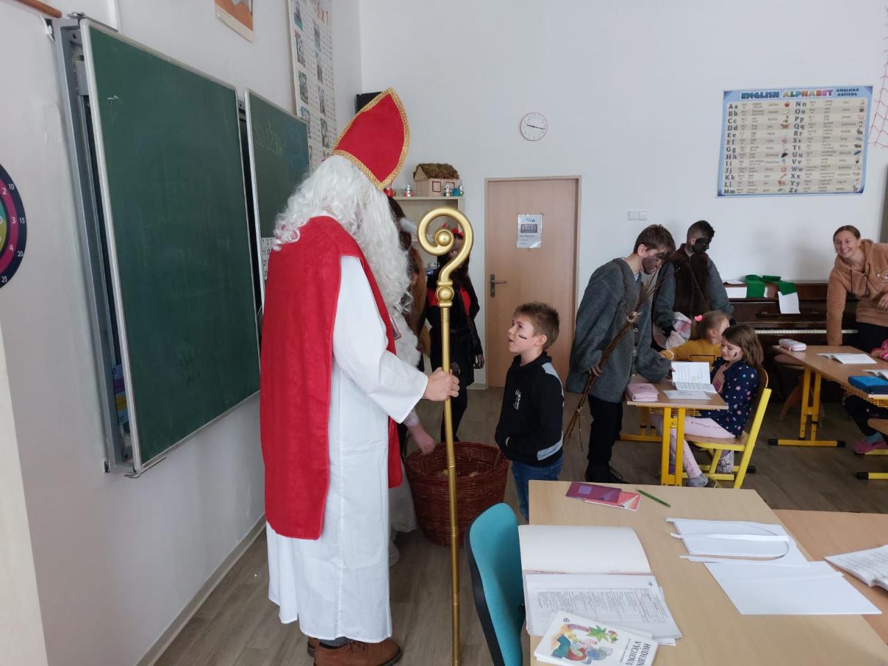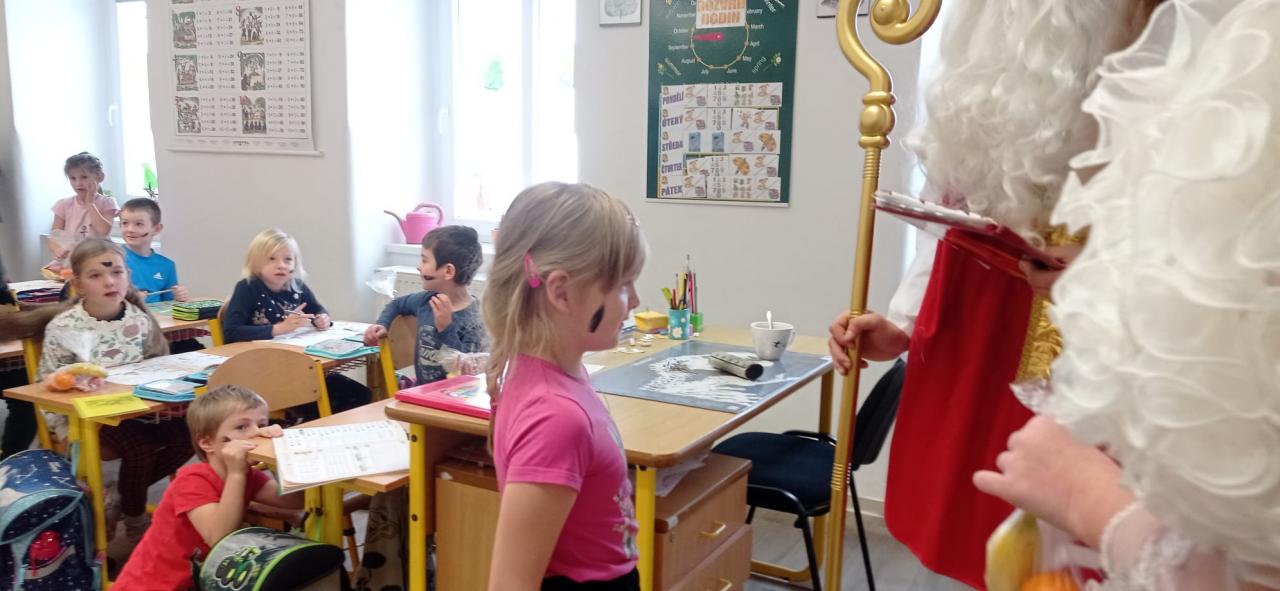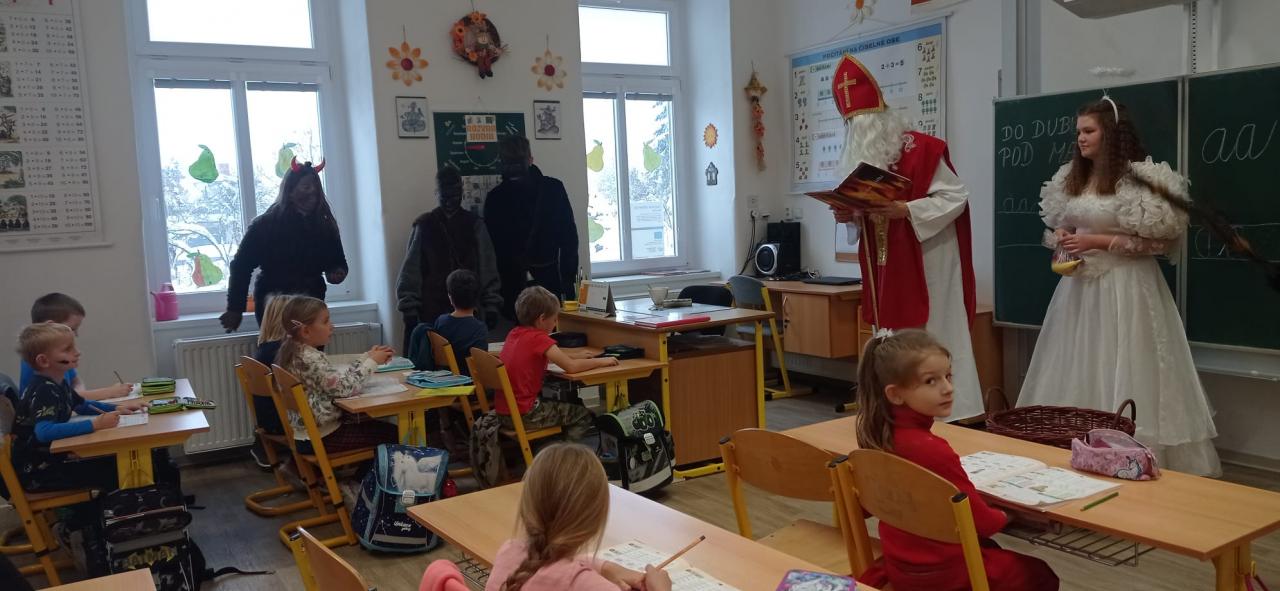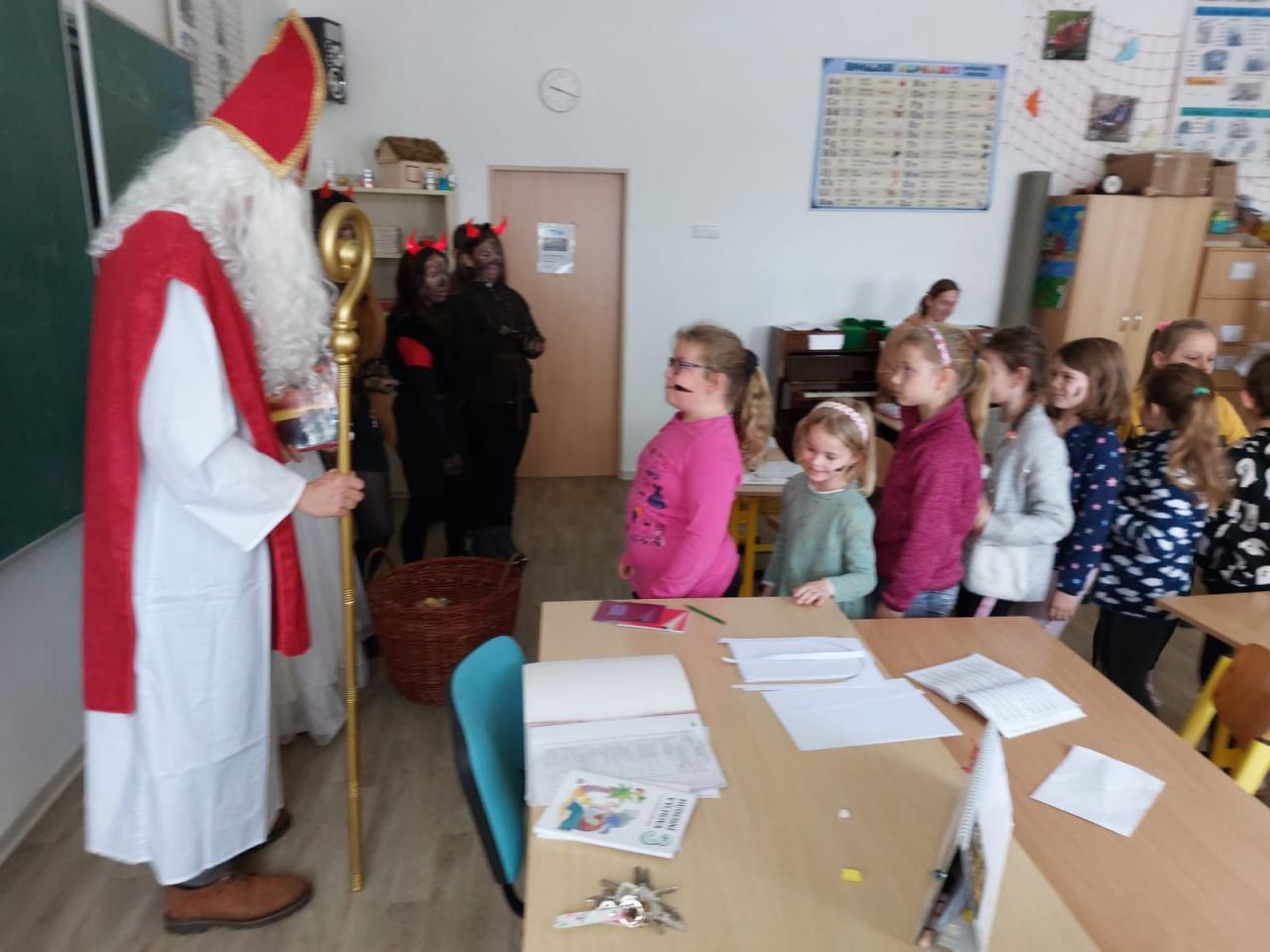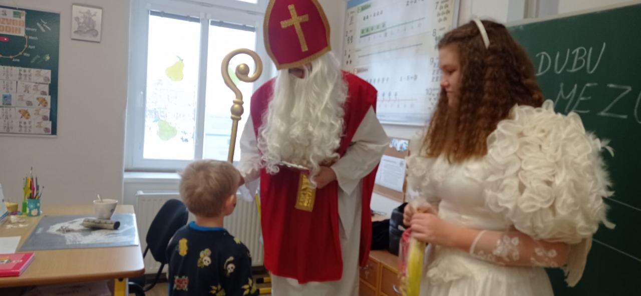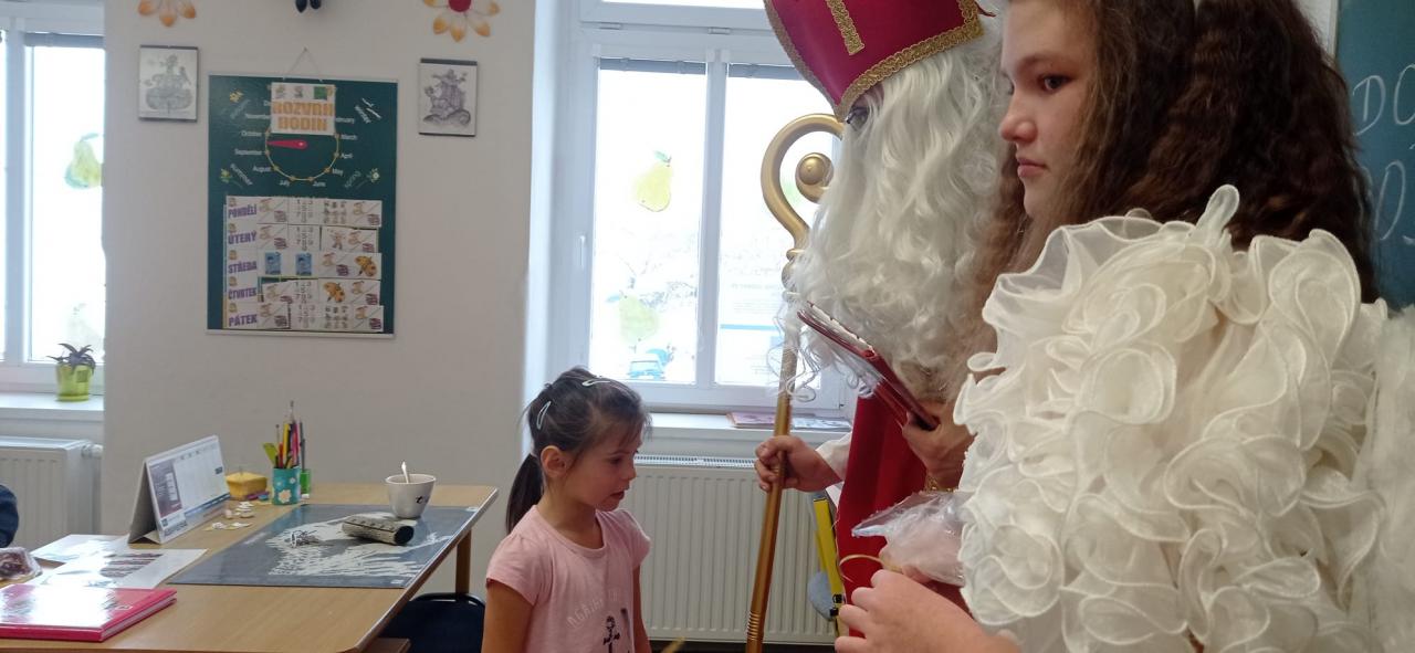 Jako již tradičně chodil u nás ve škole sv. Mikuláš se svou družinou. Zavítali do všech tříd ZŠ i mateřinky, aby zjistili, kdo se jak po celý rok choval. Naštěstí žádný z hříchů našich žáků nebyl natolik závažný, aby muselo být dítko odneseno, a tak zůstali všichni žáci ve svých lavicích. Po přednesení básní či zazpívání, byli všichni odměněni balíčky z rukou anděla. Družina zavítala i do sborovny či jídelny, ani zde se pytle nenaplnily, a tak museli čerti odejít s prázdnou.