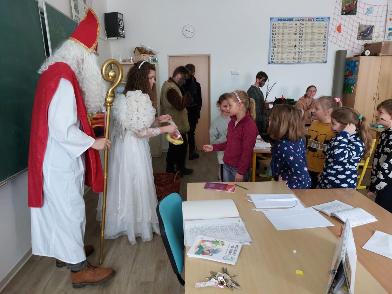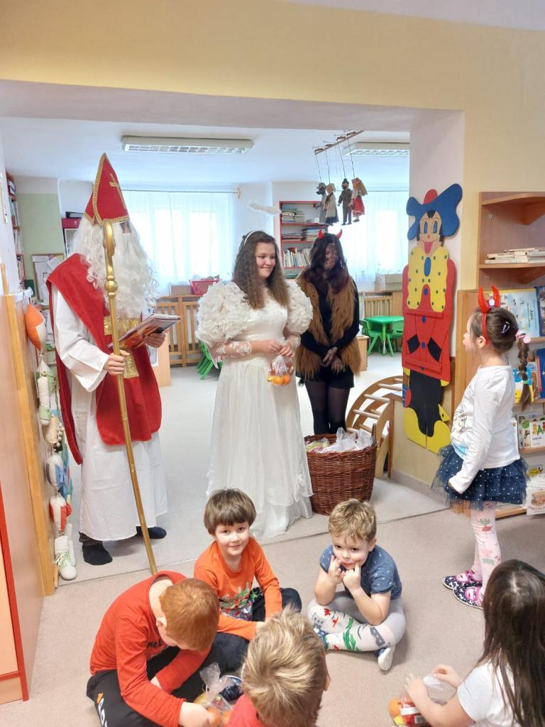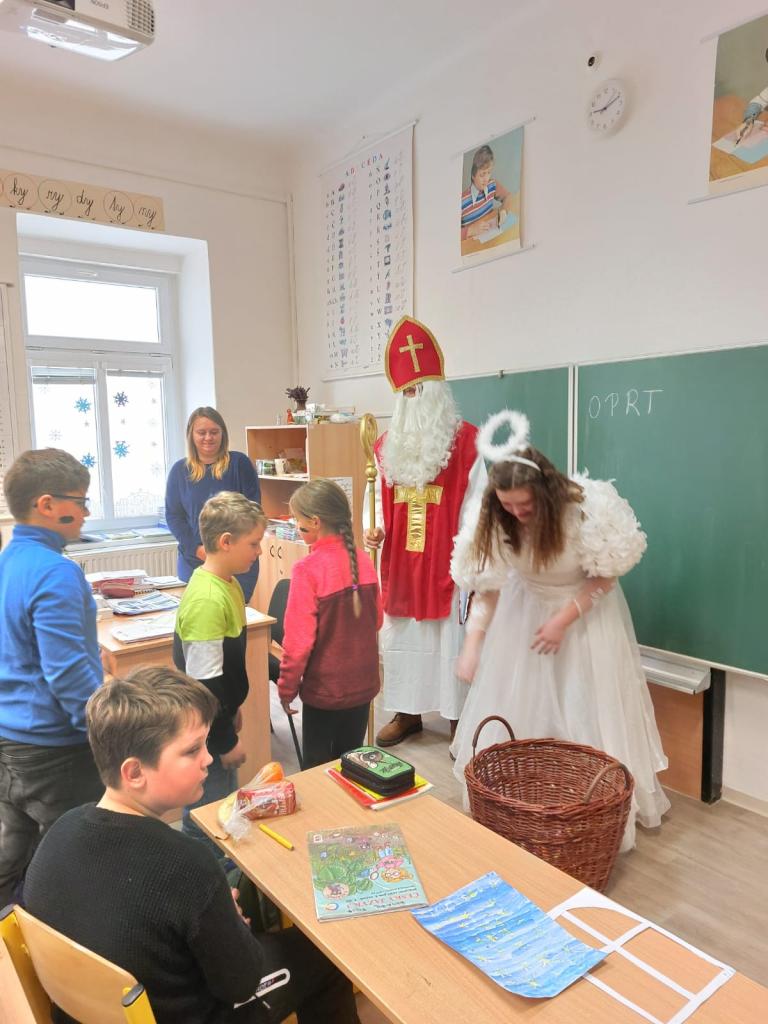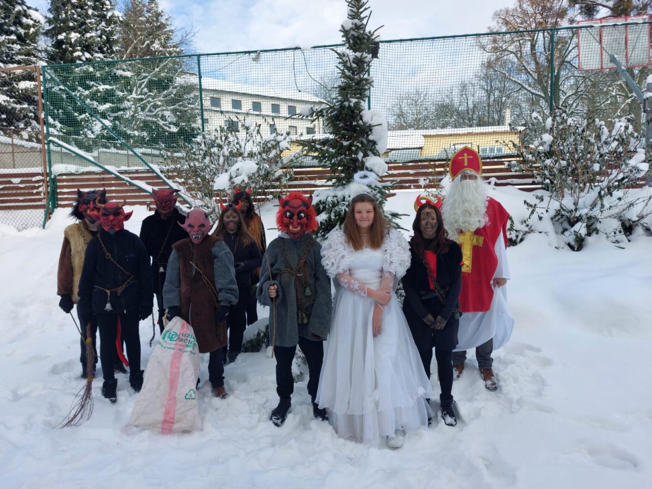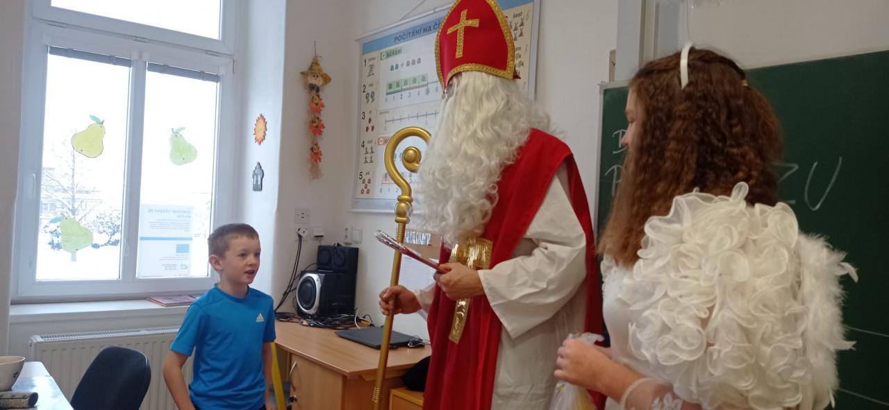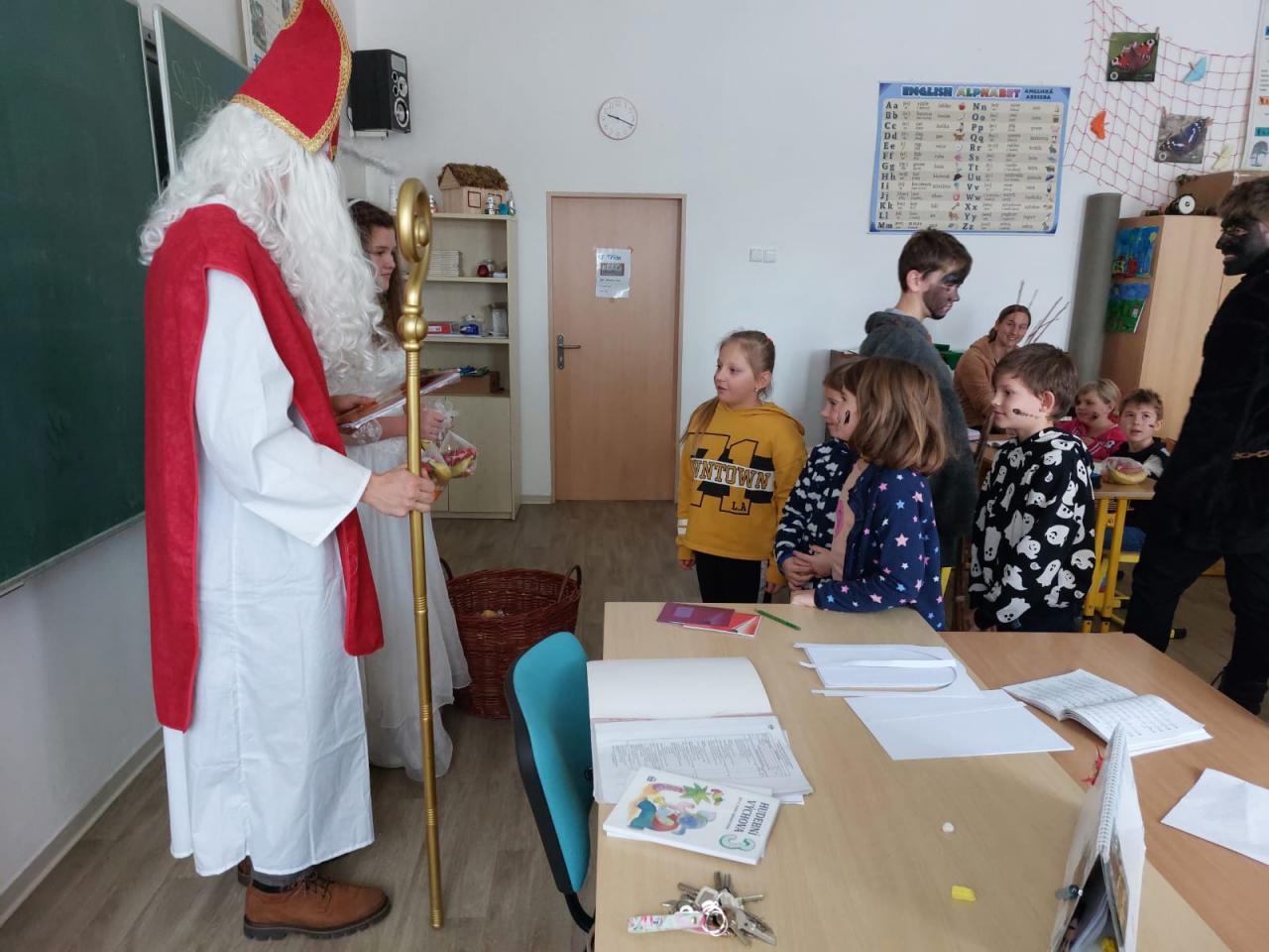 Jako již tradičně chodil u nás ve škole sv. Mikuláš se svou družinou. Zavítali do všech tříd ZŠ i mateřinky, aby zjistili, kdo se jak po celý rok choval. Naštěstí žádný z hříchů našich žáků nebyl natolik závažný, aby muselo být dítko odneseno, a tak zůstali všichni žáci ve svých lavicích. Po přednesení básní či zazpívání, byli všichni odměněni balíčky z rukou anděla. Družina zavítala i do sborovny či jídelny, ani zde se pytle nenaplnily, a tak museli čerti odejít s prázdnou.
