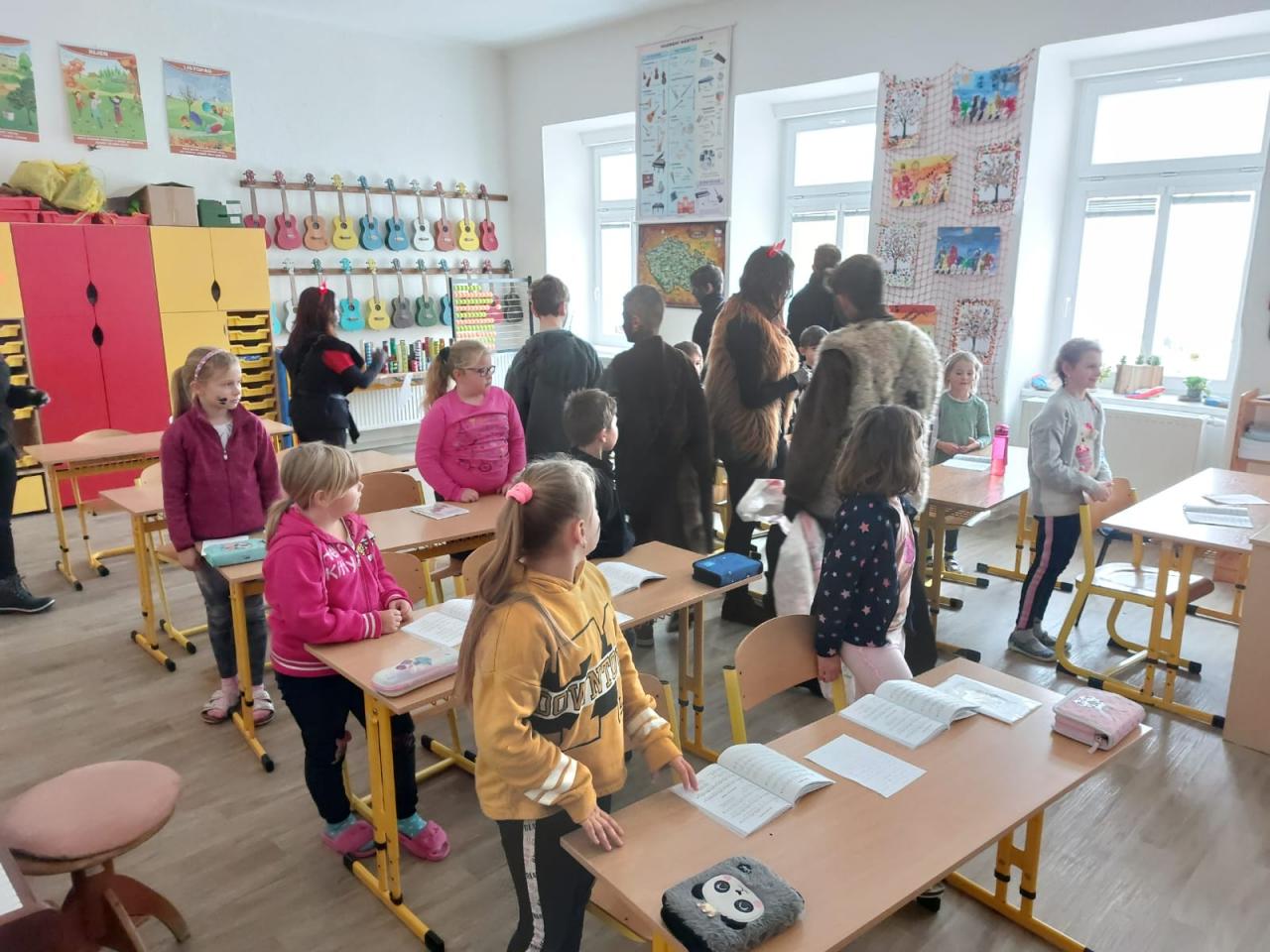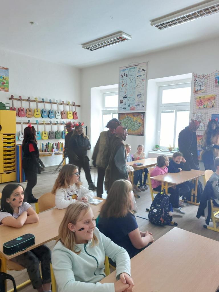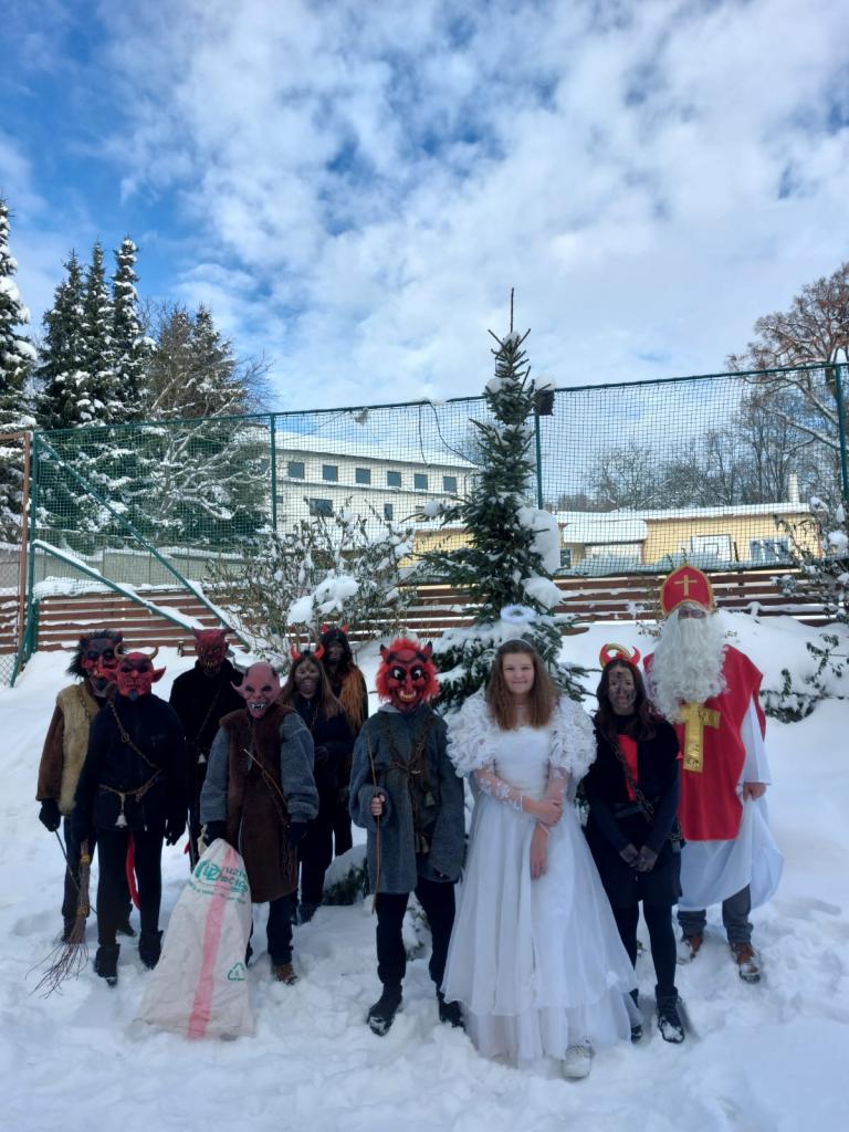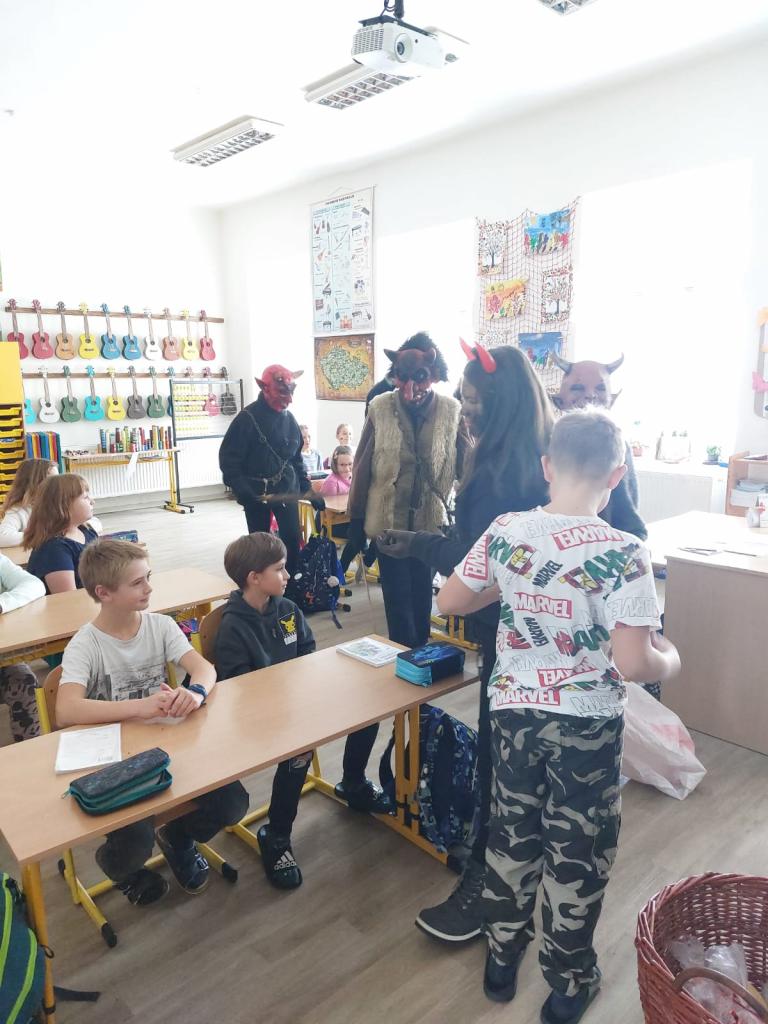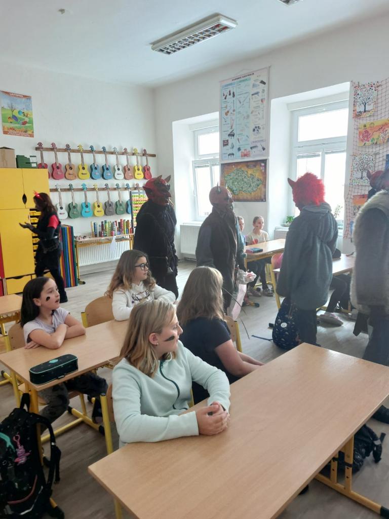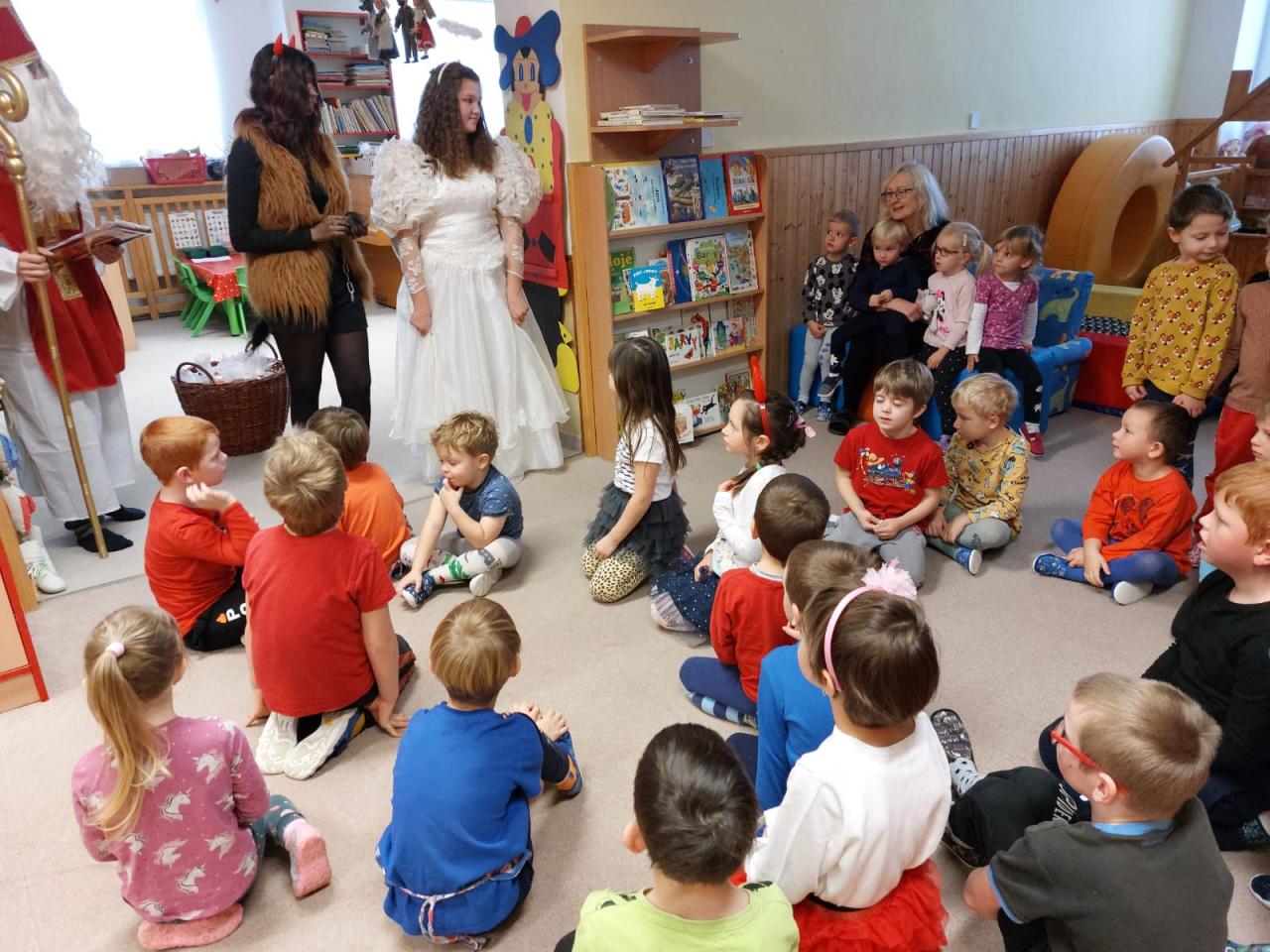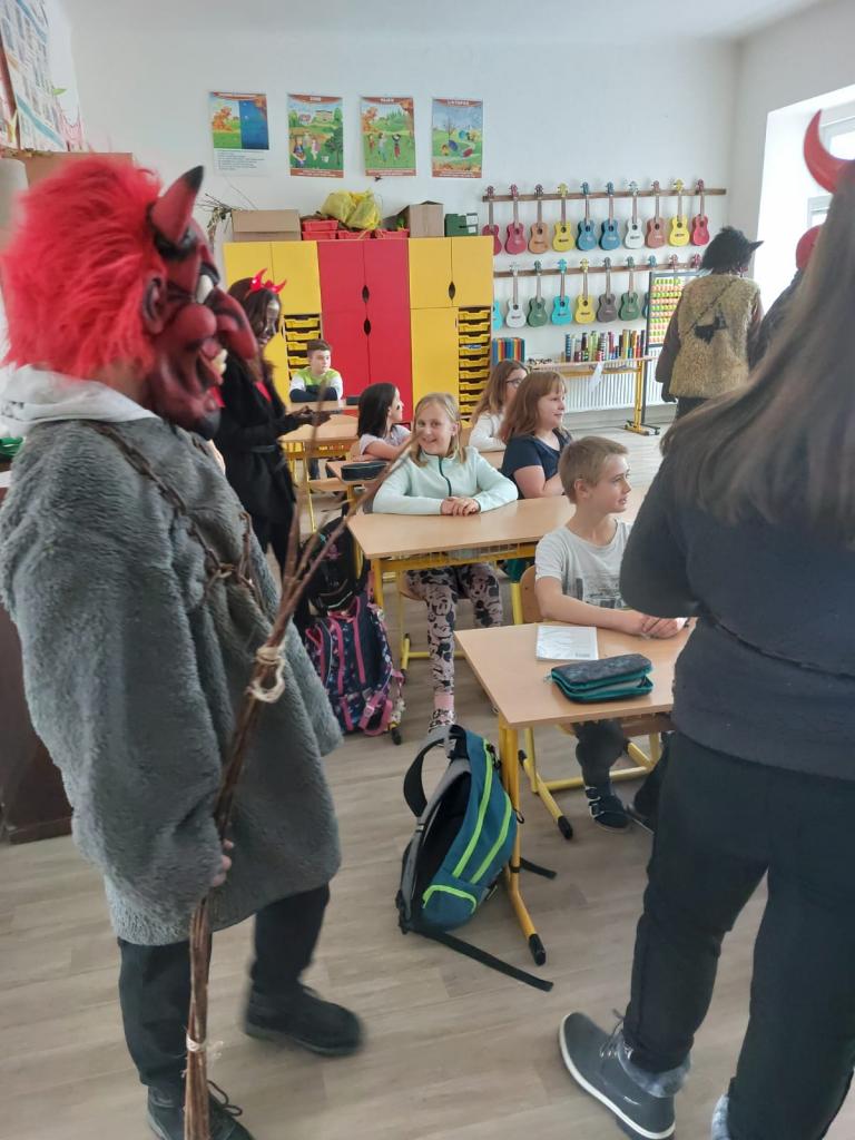 Jako již tradičně chodil u nás ve škole sv. Mikuláš se svou družinou. Zavítali do všech tříd ZŠ i mateřinky, aby zjistili, kdo se jak po celý rok choval. Naštěstí žádný z hříchů našich žáků nebyl natolik závažný, aby muselo být dítko odneseno, a tak zůstali všichni žáci ve svých lavicích. Po přednesení básní či zazpívání, byli všichni odměněni balíčky z rukou anděla. Družina zavítala i do sborovny či jídelny, ani zde se pytle nenaplnily, a tak museli čerti odejít s prázdnou.