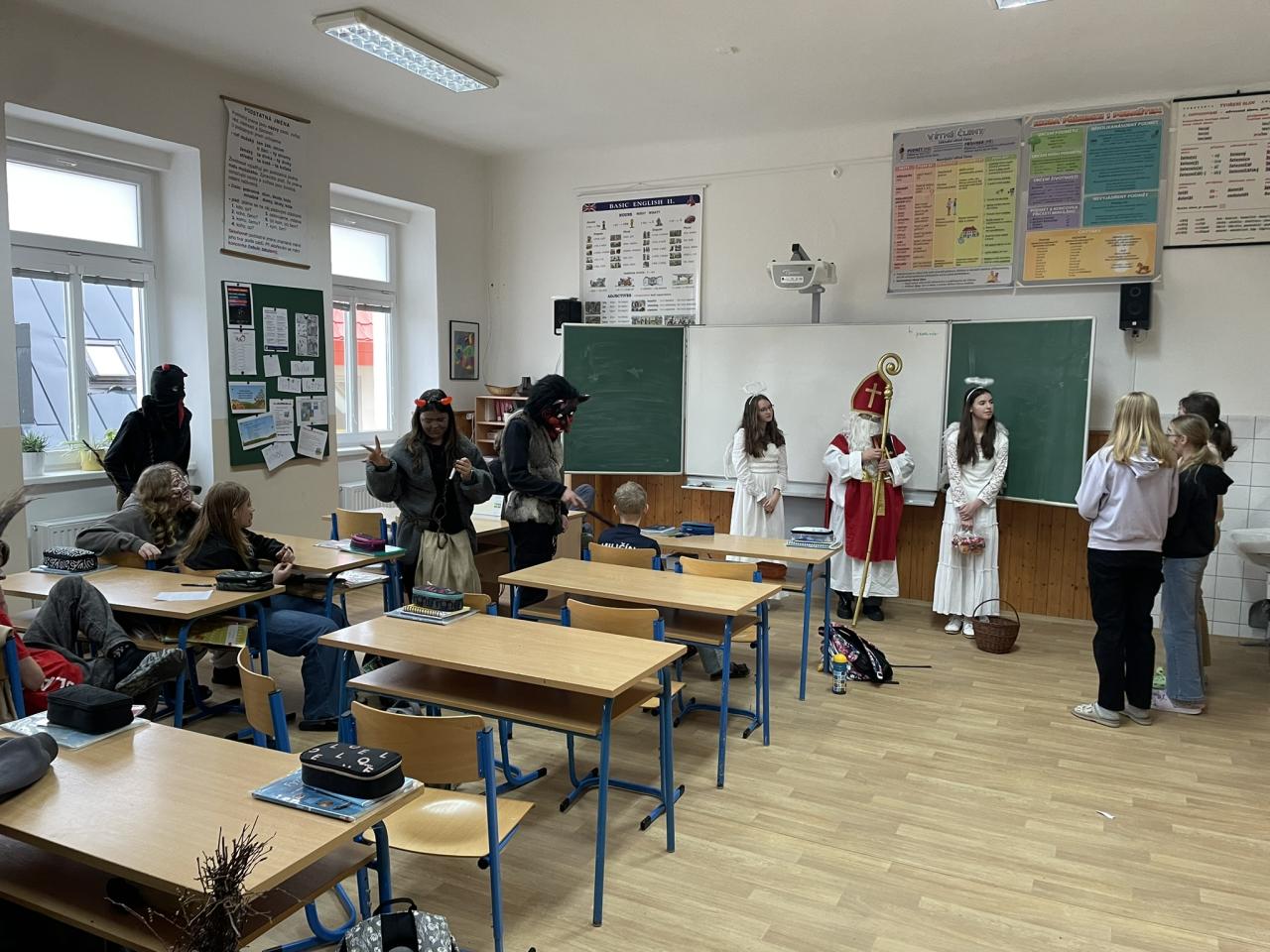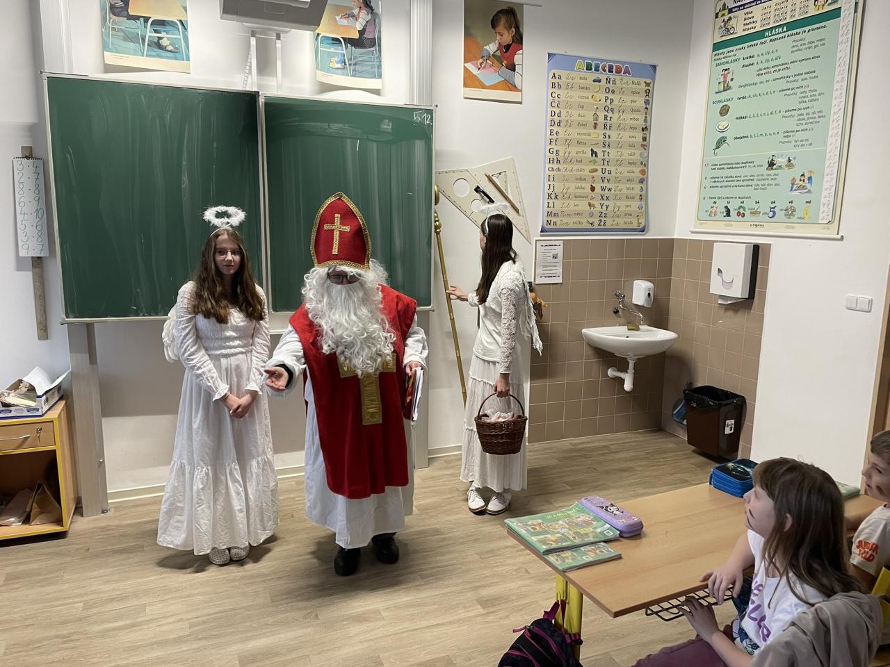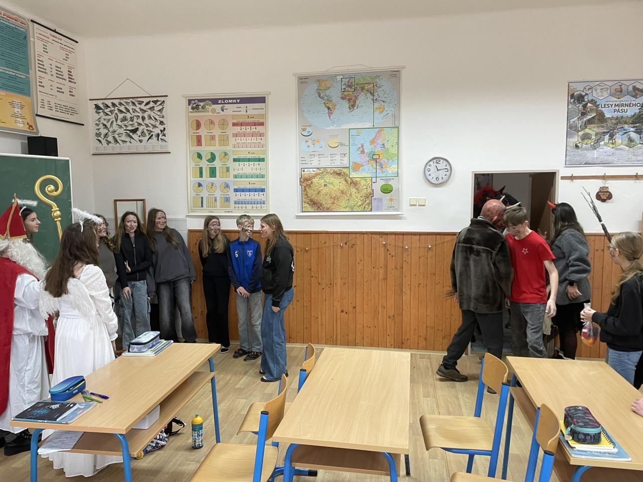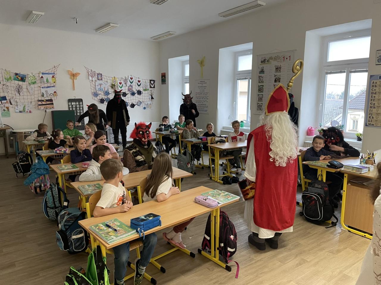 Dne 5. 12. přišli do naší školy a školky čerti. Samozřejmě nechodili sami, ale doprovázeli ctihodného Mikuláše a dva něžné anděly. Celá skupina navštívila třídu po třídě, sborovnu i mateřskou školu. Tam se Mikuláš s velkou knihou hříchů zajímal nejen o prohřešky dětí, ale i paní učitelek. Všichni upřímně slíbili nápravu, takže mohli dostat odměnu. Mikuláš si všiml, jak jsou děti krásně oblečené do vánočních nebo čertovských šatů, popovídal si s nimi a moc je pochválil. Čerti se drželi v pozadí a jenom občas hudrovali, řinčeli řetězy a zvonili zvonci. Zato v základní škole je čekala velká práce s nezbednými školáky! Museli jim důrazně domlouvat, chtěli slyšet příslib nápravy, k čemuž používali i mírné čertovské donucovací prostředky. Mikuláš s každým hříšníkem pohovořil a nechal si zazpívat či zarecitovat. Vousy se mu ježily hrůzou a andělům zplihla křídla, když museli vyslechnout třeba Skákal pes místo vánoční písně. Ale nakonec vše dobře dopadlo a tradiční mikulášská nadílka potěšila všechny přítomné.