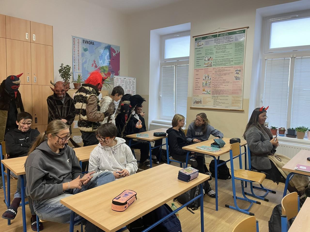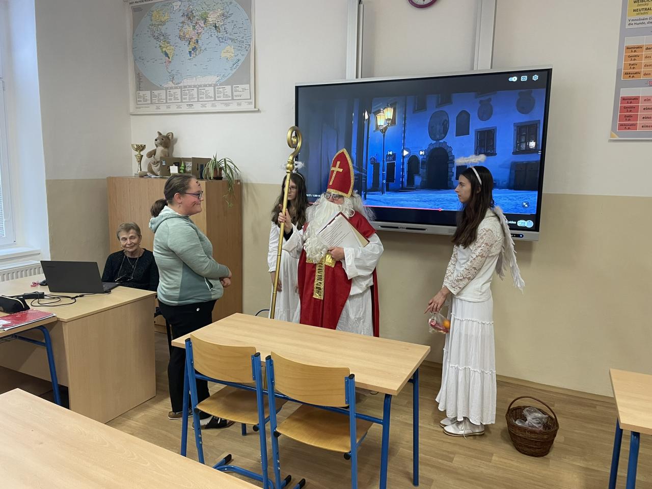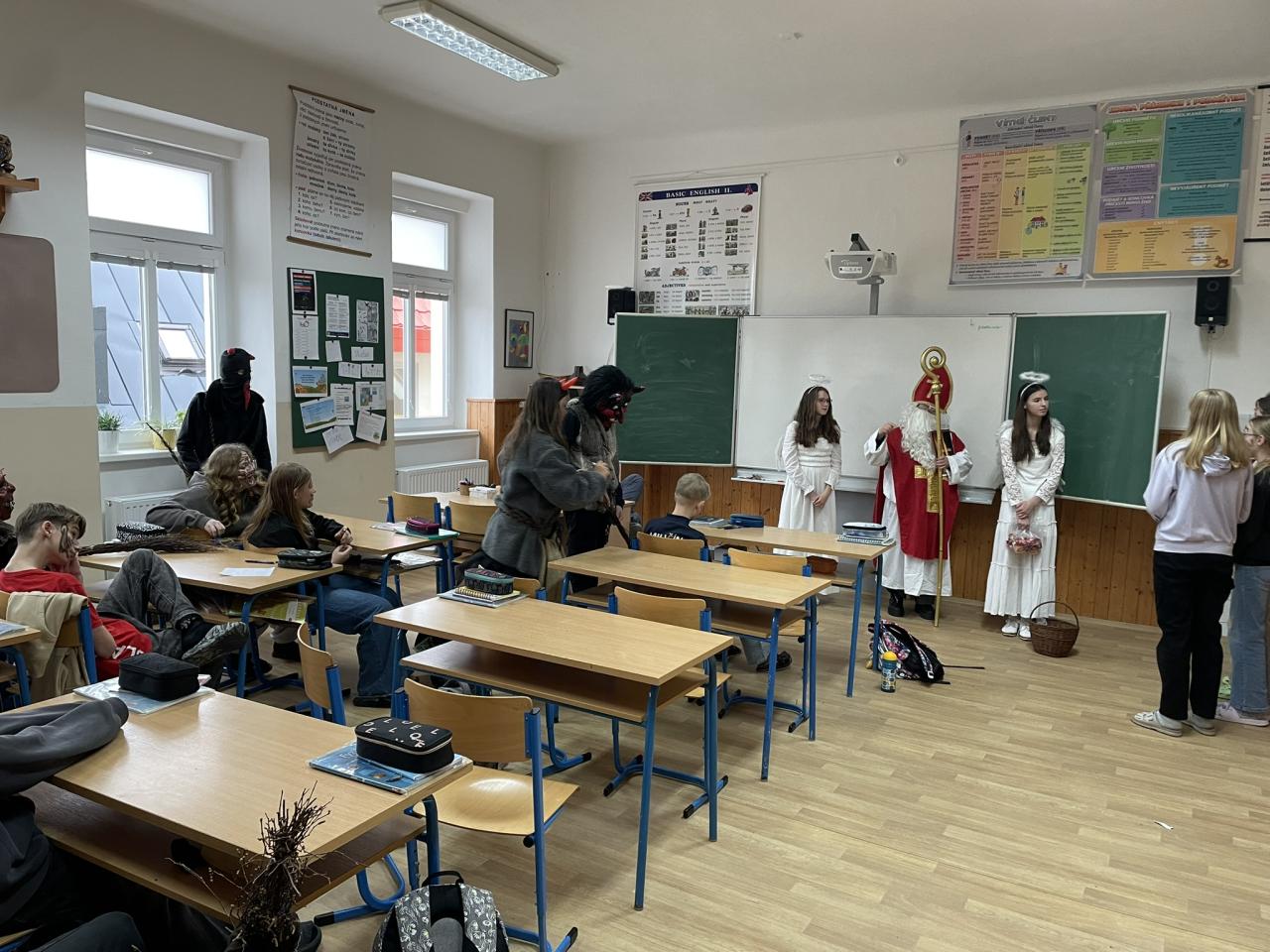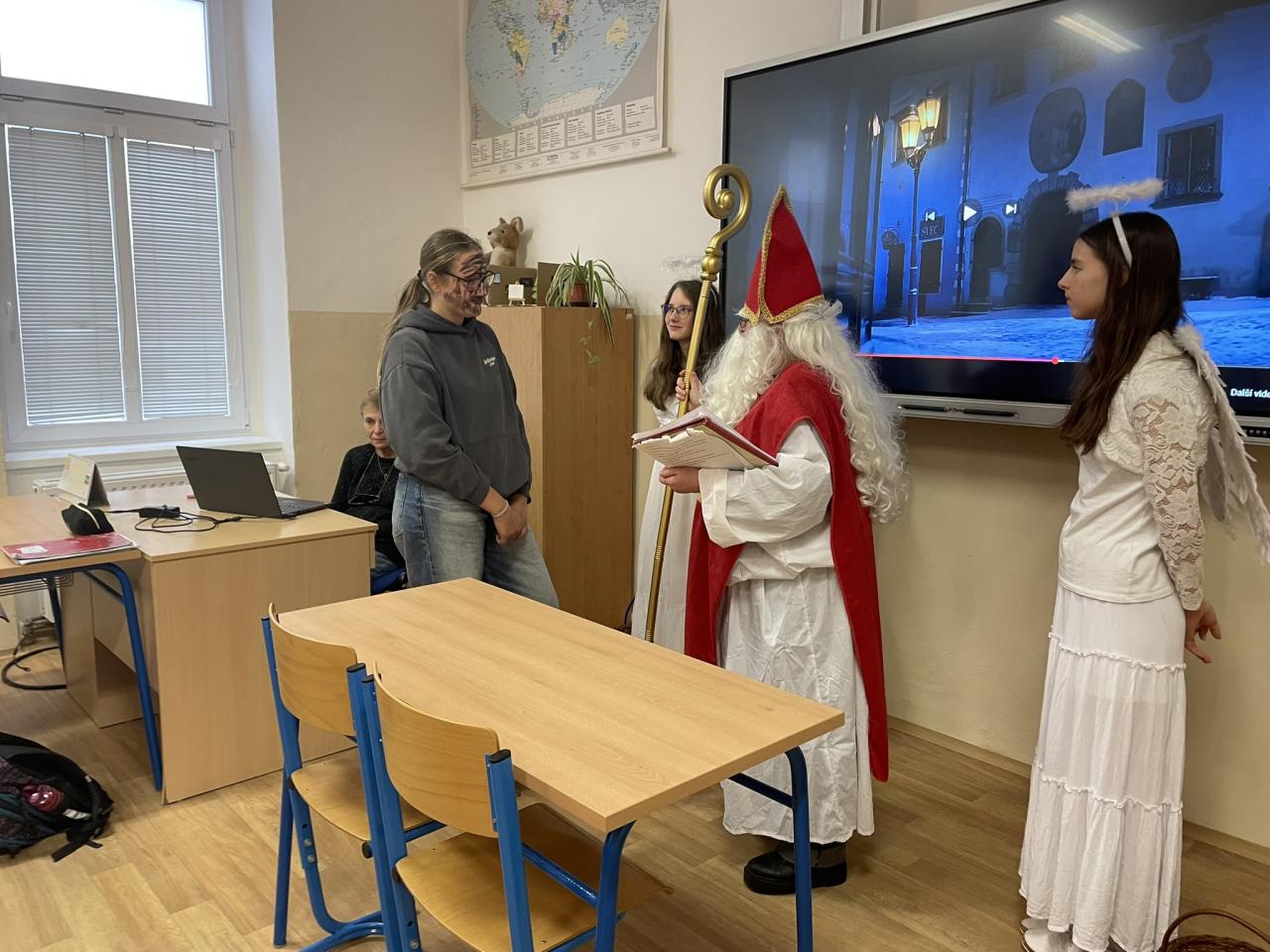 Dne 5. 12. přišli do naší školy a školky čerti. Samozřejmě nechodili sami, ale doprovázeli ctihodného Mikuláše a dva něžné anděly. Celá skupina navštívila třídu po třídě, sborovnu i mateřskou školu. Tam se Mikuláš s velkou knihou hříchů zajímal nejen o prohřešky dětí, ale i paní učitelek. Všichni upřímně slíbili nápravu, takže mohli dostat odměnu. Mikuláš si všiml, jak jsou děti krásně oblečené do vánočních nebo čertovských šatů, popovídal si s nimi a moc je pochválil. Čerti se drželi v pozadí a jenom občas hudrovali, řinčeli řetězy a zvonili zvonci. Zato v základní škole je čekala velká práce s nezbednými školáky! Museli jim důrazně domlouvat, chtěli slyšet příslib nápravy, k čemuž používali i mírné čertovské donucovací prostředky. Mikuláš s každým hříšníkem pohovořil a nechal si zazpívat či zarecitovat. Vousy se mu ježily hrůzou a andělům zplihla křídla, když museli vyslechnout třeba Skákal pes místo vánoční písně. Ale nakonec vše dobře dopadlo a tradiční mikulášská nadílka potěšila všechny přítomné.