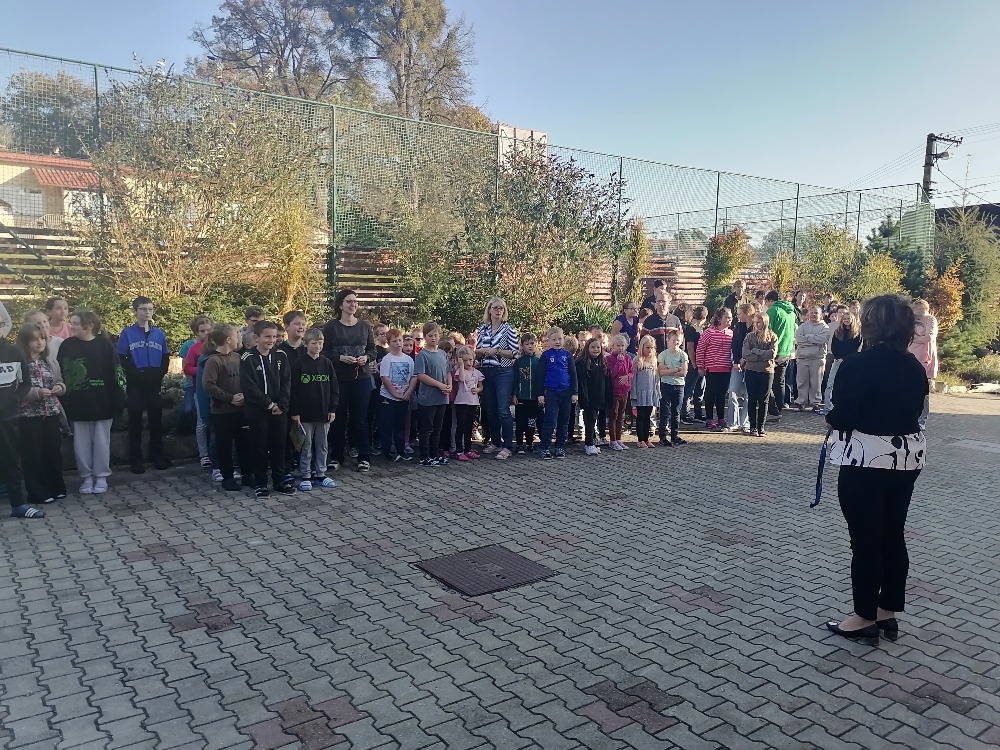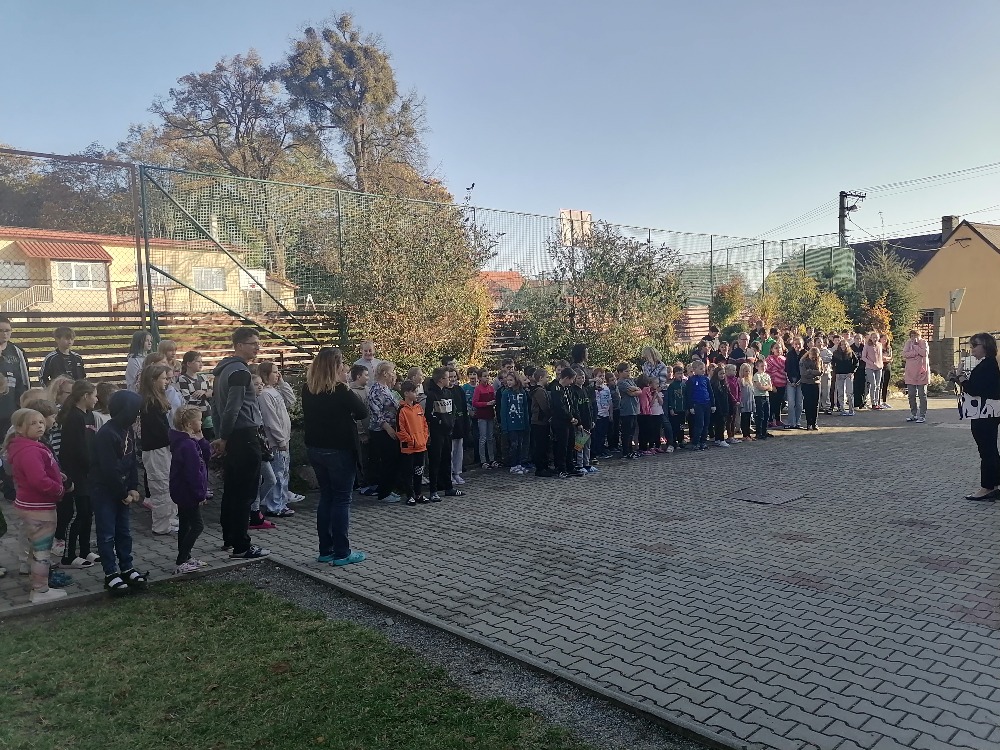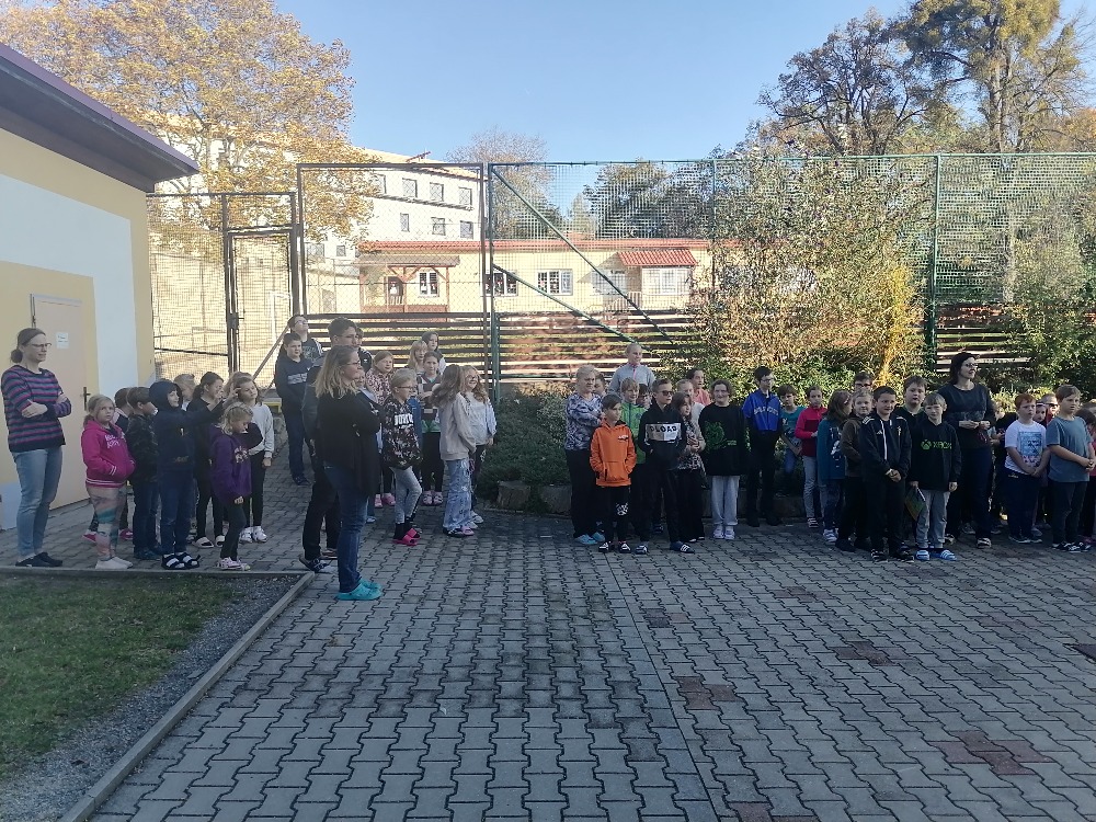 Ve čtvrtek 17. října přesně v 9 hodin jsme si vyzkoušeli rychlou evakuaci budovy školy. Při hlasité siréně vyučující zaveleli, aby žáci okamžitě opustili třídu, a potom se s nimi vydali únikovým východem na dvůr. Bez tašek, učebnic, mobilů, bund, Teodor i bez jedné boty😊Venku paní ředitelka všechny pochválila za skvělý čas 1 minuta a 52 vteřin, kterého jsme dosáhli. Děti se vrátily do tříd osvěžené a vesele jsme pokračovali ve výuce.