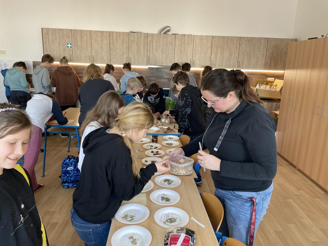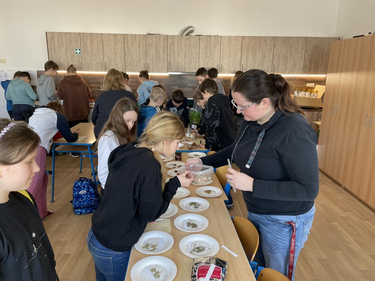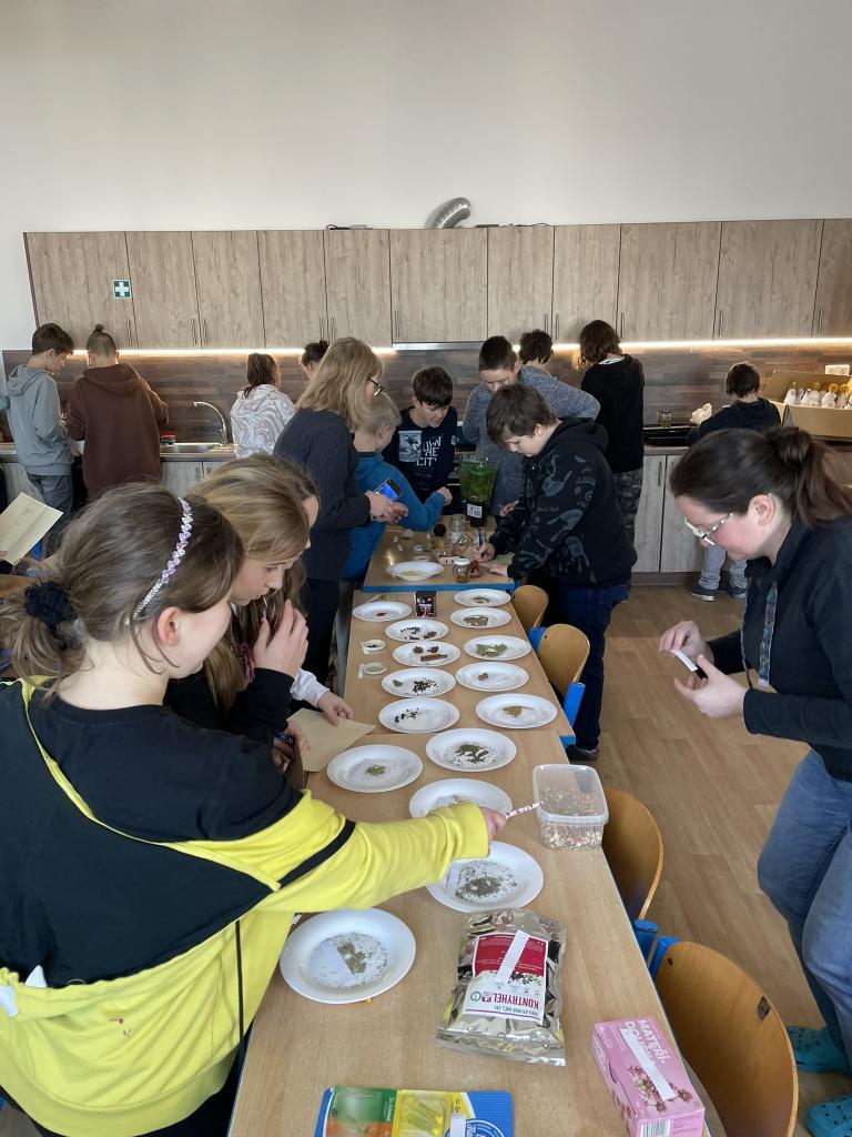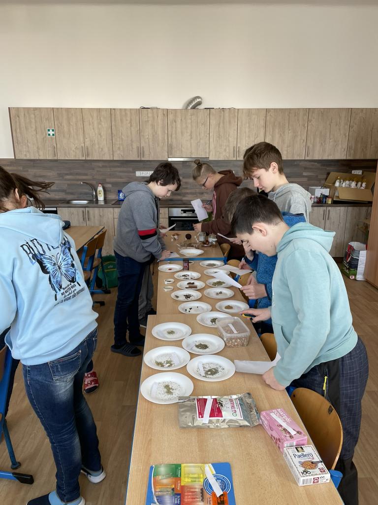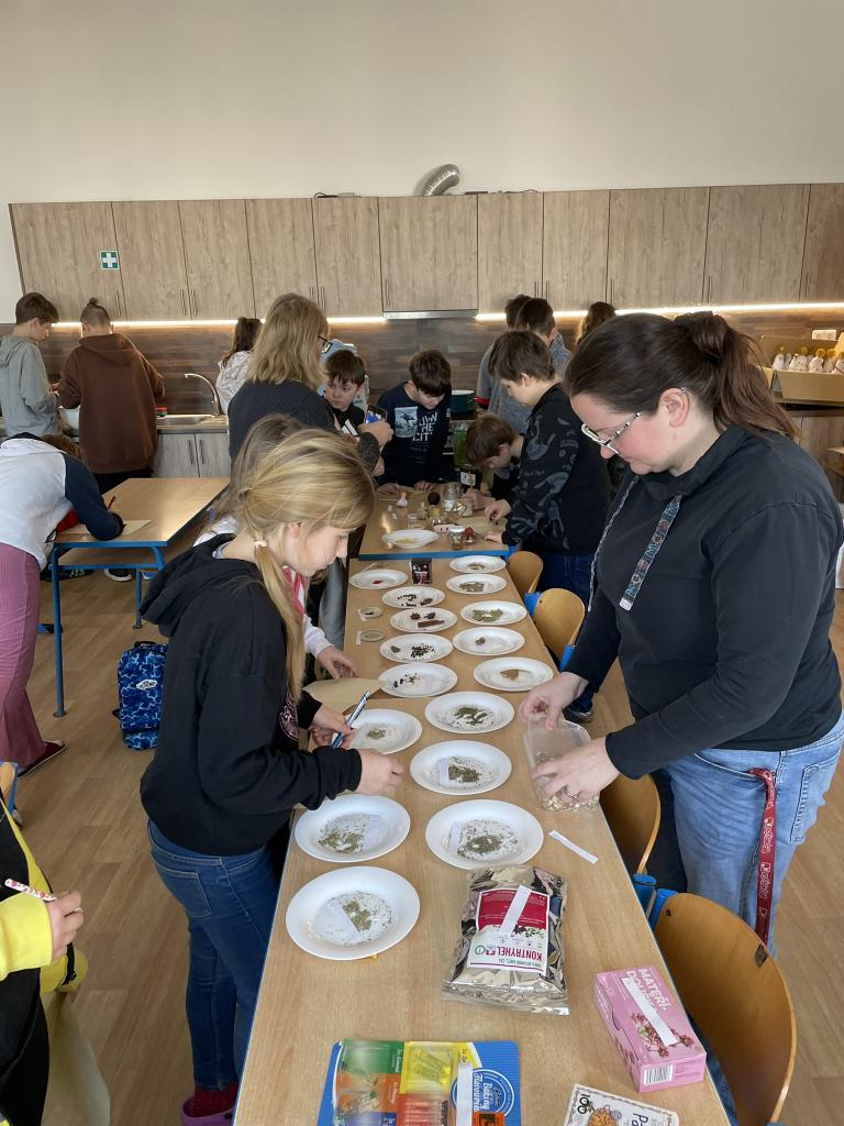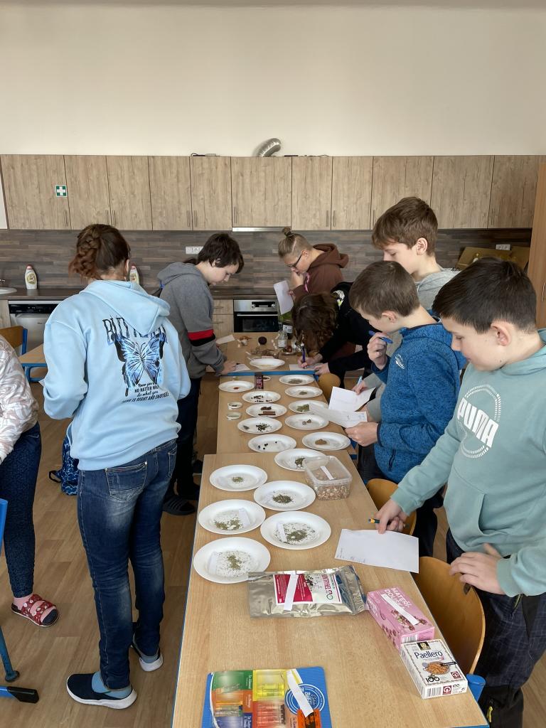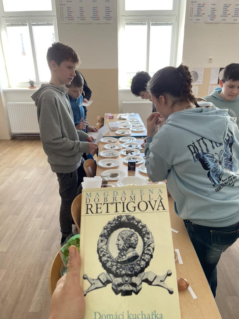 Poté jsme se již přesunuli do historie kulinářství, zajímavostí napříč světem a dějin zpracování, uchovávání a kořenění potravin. Po teorii si děti samy vyzkoušely své znalosti v poznávání 35 druhů koření a pochutin zlepšujících chuť. Zde se k nám přidal i 5. ročník s paní učitelkou Janou Plačkovou. Moc děkuji za skvělou spolupráci s ostatními kolegy i žáky, takže program šel dle plánu a časového harmonogramu. Vrcholem všeho bylo vaření buřt guláše a praktické ozkoušení nově získaných znalostí z kuchyně. To si vzala pod patronát paní učitelka Blanka Kocourková a společnými silami jsme si s žáky uvařili. Předpisově jsme po sobě uklidili a také roztřídili odpad, jak jsme se naučili. Potravinové obaly do barevných kontejnerů, bioodpad na školní zahradu a slupky od brambor slepicím pí učitelky Karolíny Týleové.