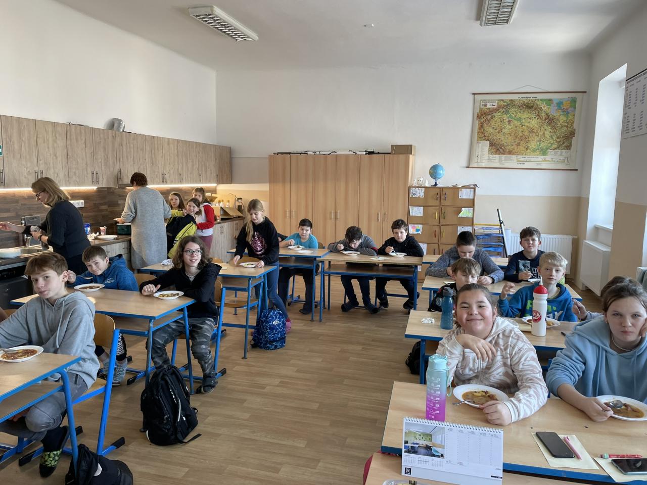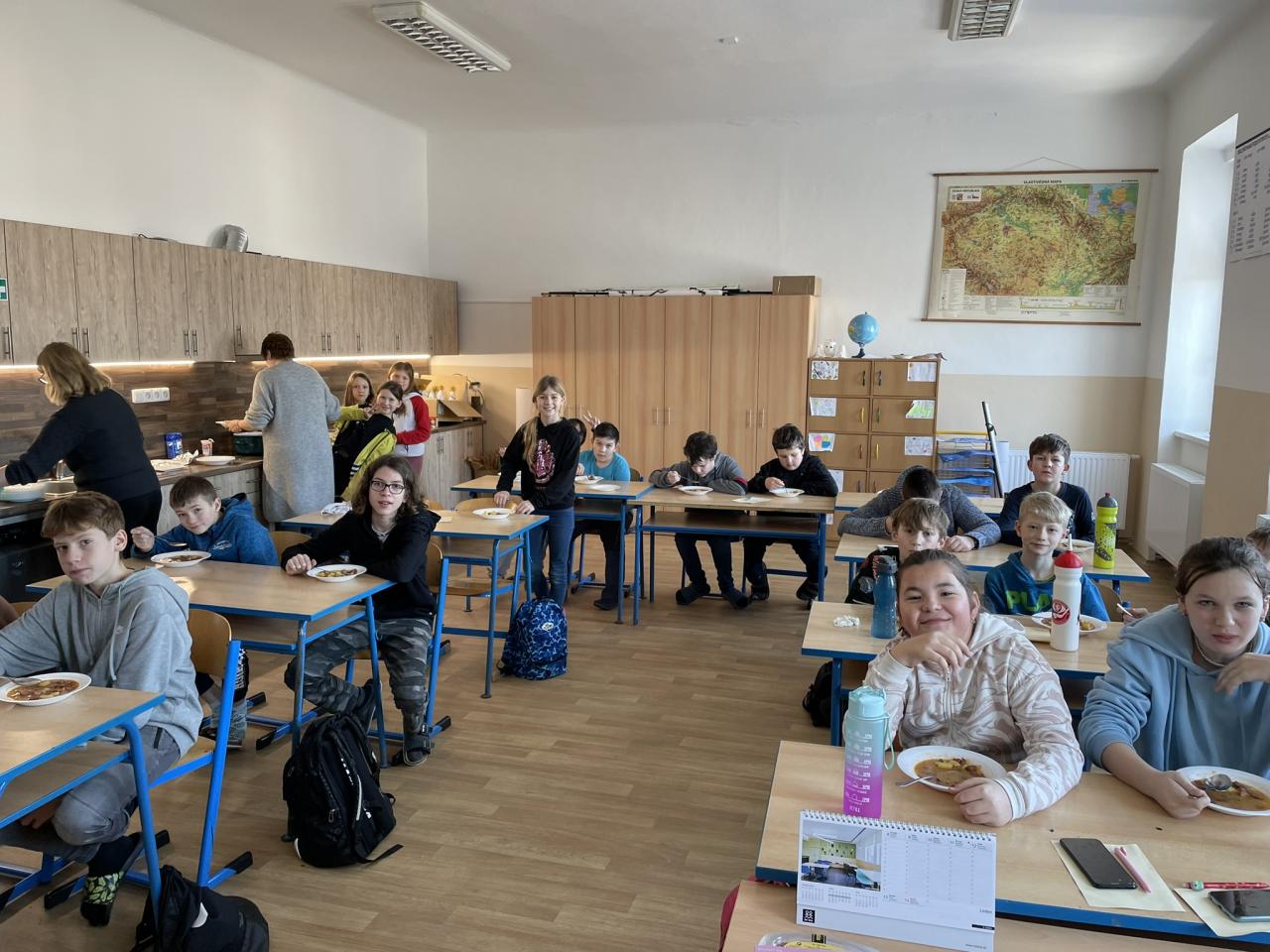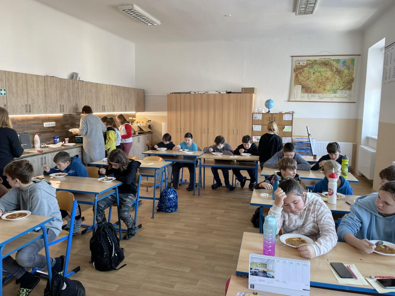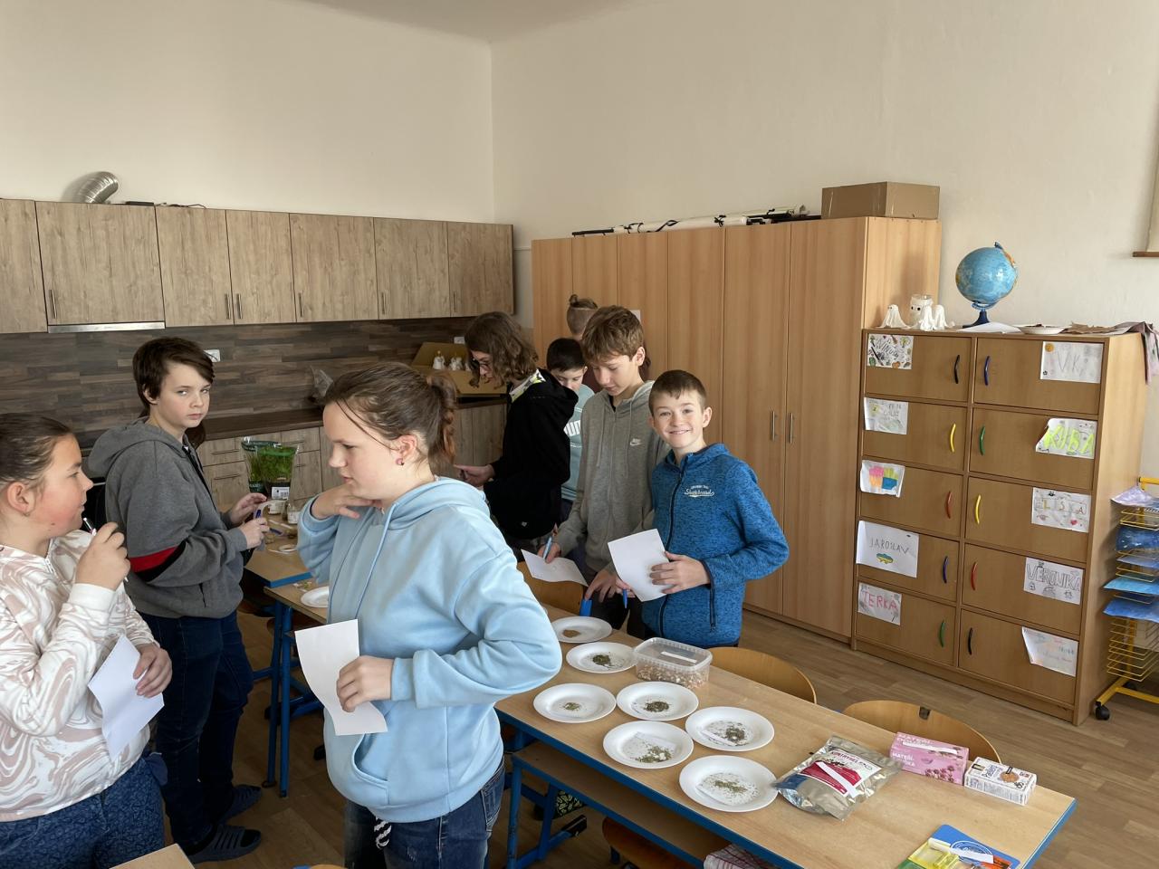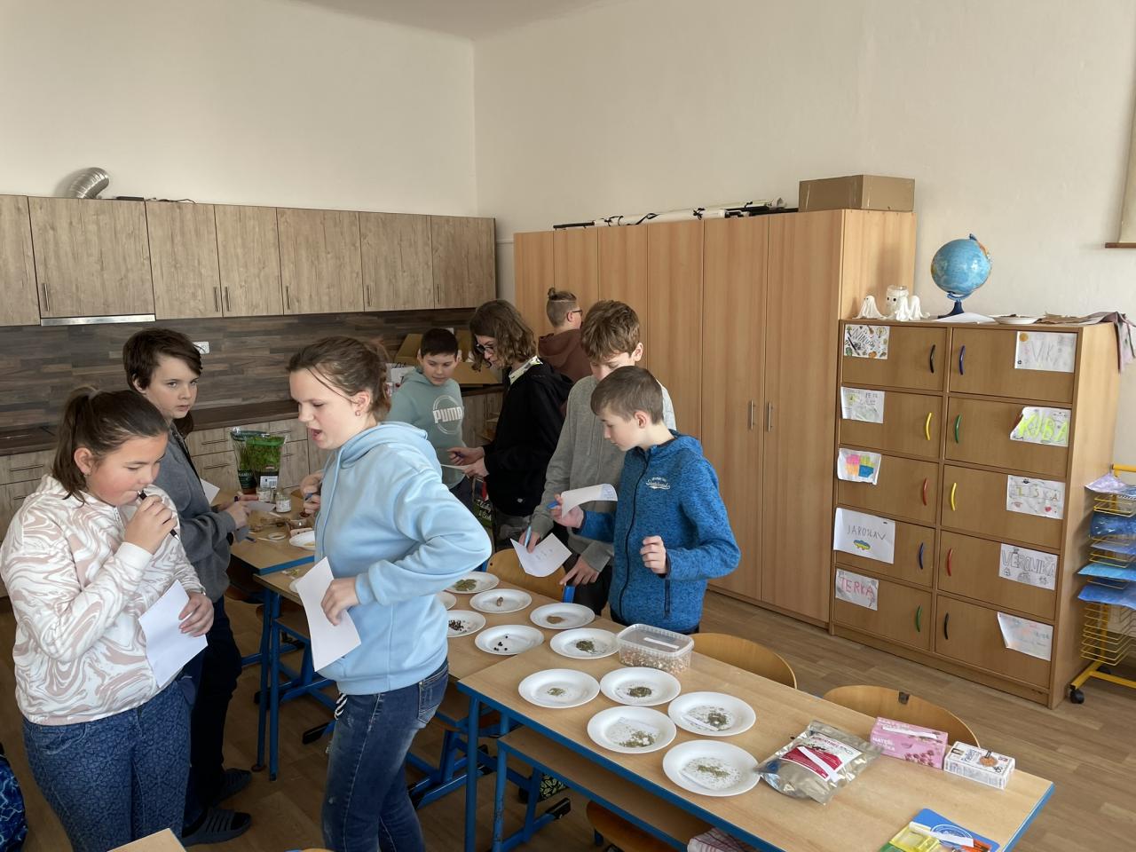 Poté jsme se již přesunuli do historie kulinářství, zajímavostí napříč světem a dějin zpracování, uchovávání a kořenění potravin. Po teorii si děti samy vyzkoušely své znalosti v poznávání 35 druhů koření a pochutin zlepšujících chuť. Zde se k nám přidal i 5. ročník s paní učitelkou Janou Plačkovou. Moc děkuji za skvělou spolupráci s ostatními kolegy i žáky, takže program šel dle plánu a časového harmonogramu. Vrcholem všeho bylo vaření buřt guláše a praktické ozkoušení nově získaných znalostí z kuchyně. To si vzala pod patronát paní učitelka Blanka Kocourková a společnými silami jsme si s žáky uvařili. Předpisově jsme po sobě uklidili a také roztřídili odpad, jak jsme se naučili. Potravinové obaly do barevných kontejnerů, bioodpad na školní zahradu a slupky od brambor slepicím pí učitelky Karolíny Týleové.