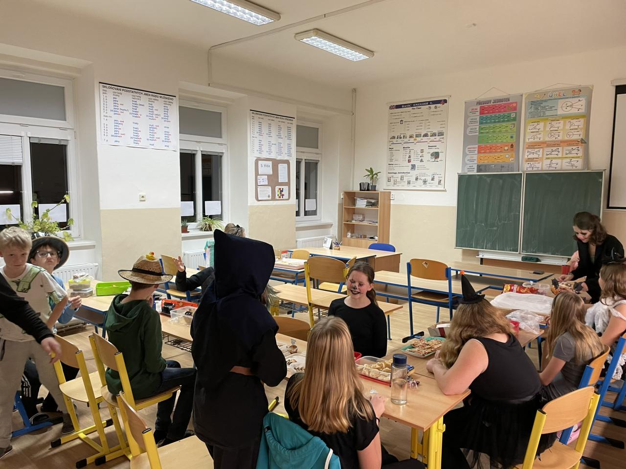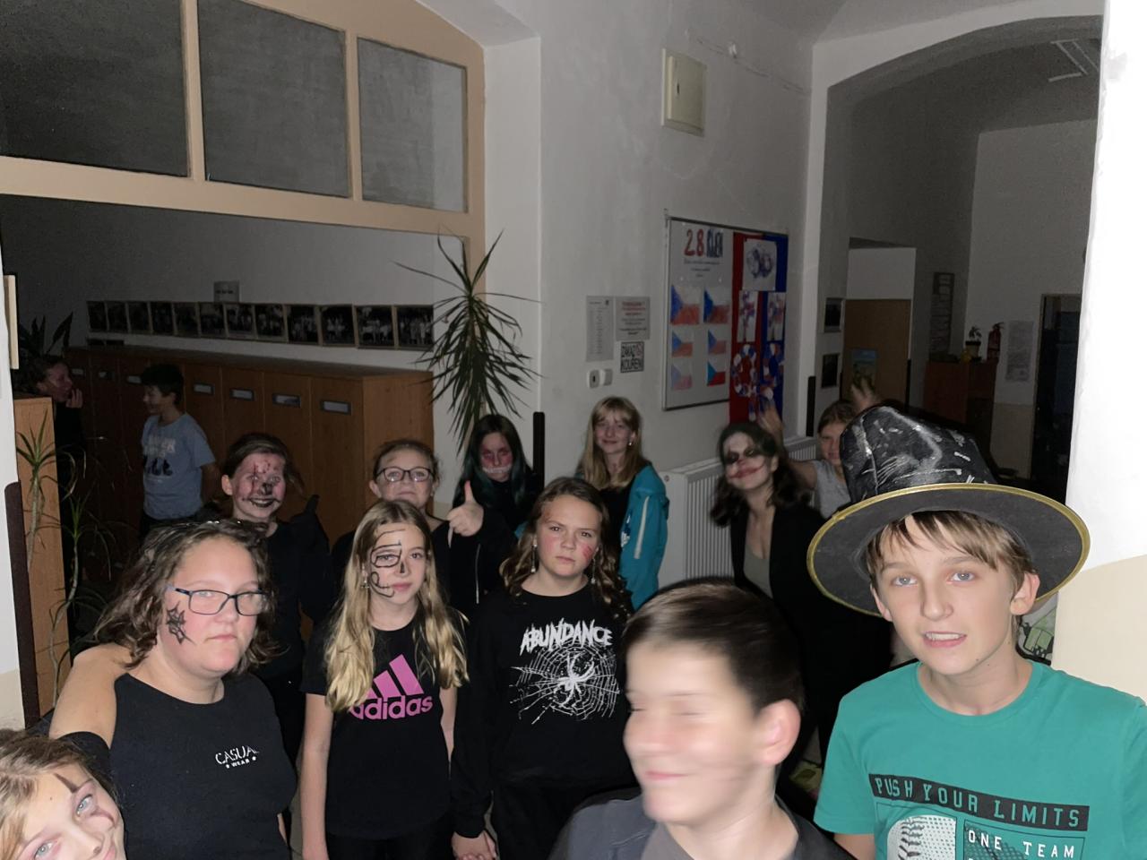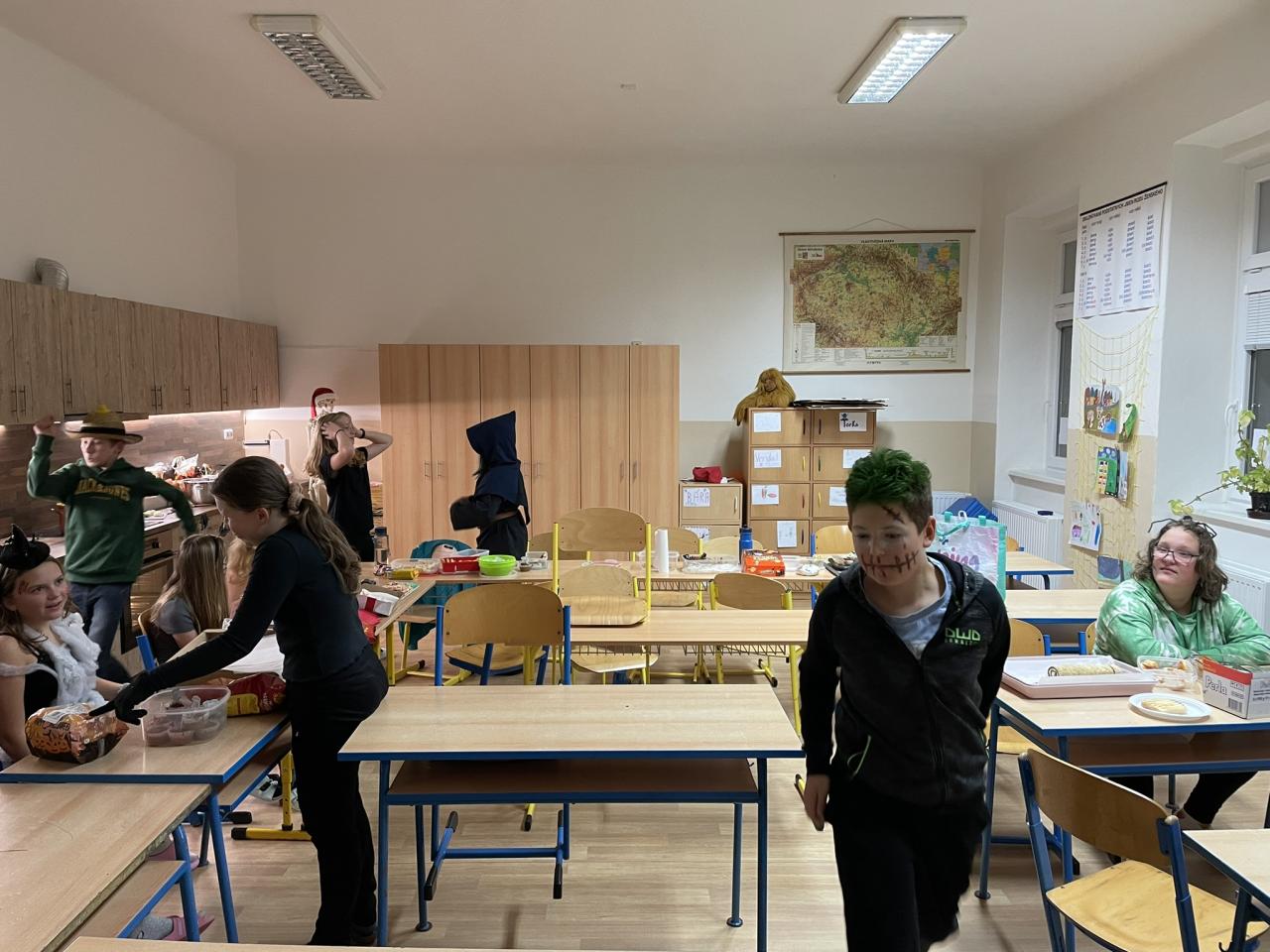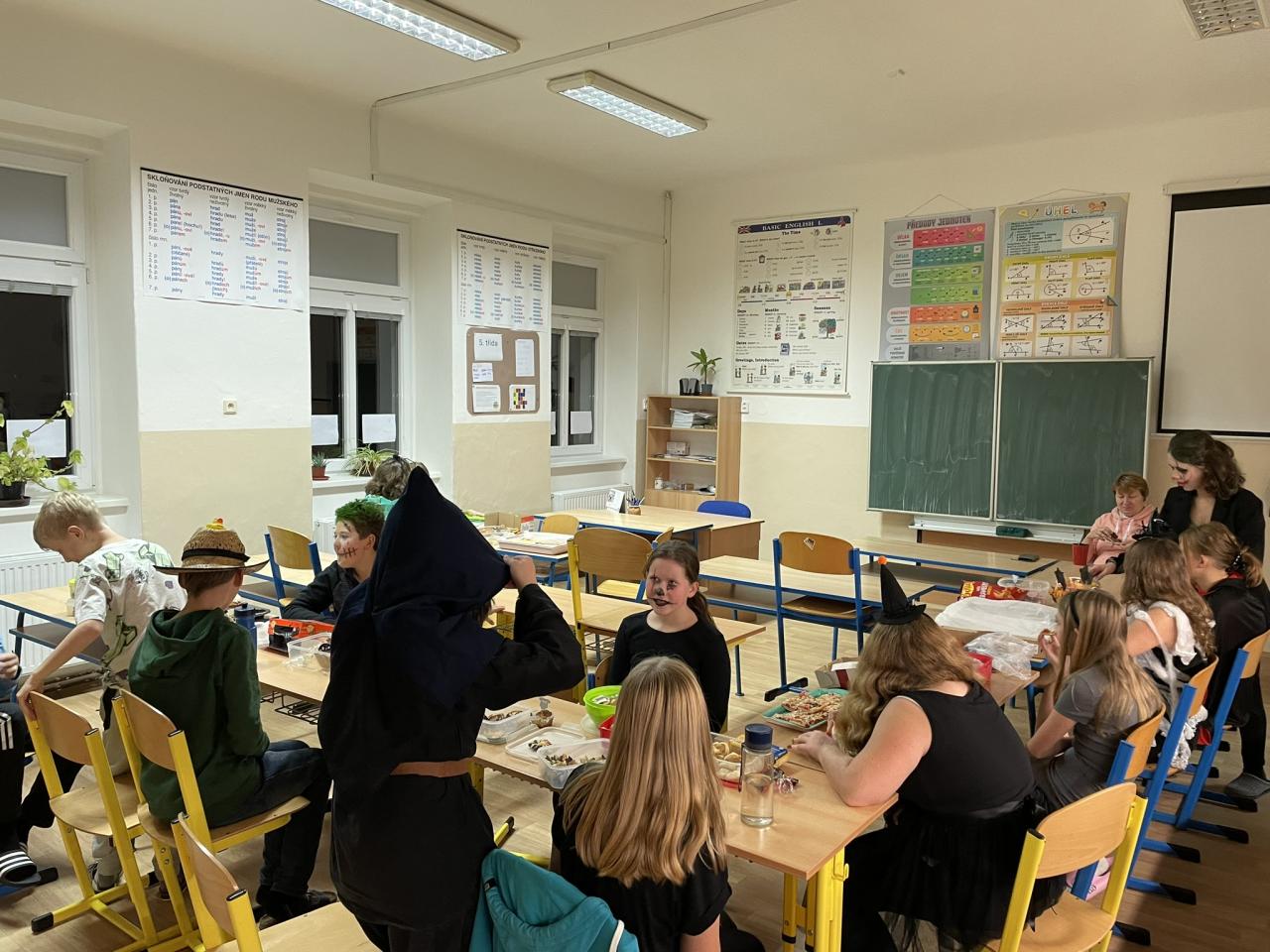Ve čtvrtek 31.10. se uskutečnila na přání dětí Halloweenská třídnická hodina s přespáním ve škole. Už samotné přespání bylo pro většinu velký zážitek, protože poznat školu tak nevšedně tichou, udělat si kuchyň, obývák i ložnici ve své třídě se nestává každý den. K Halloweenu patří samozřejmě masky, v kterých jsme se na 18:00 večerní sešli v šatnách. Některé byly opravdu nápadité až děsivé, takže samozřejmě nechybělo vyhodnocení té nejlepší. Tou se stala žákyně 7. ročníku N. Imramovská za svého „Jokera“. Hlasování o nejlepší kostým však ještě předcházela společná večeře a diskotéka, kdy byly děti sami sobě Dj´s a každý si mohl pustit tu svou oblíbenou. Před diskotékou jsme si ještě stihli říct, co to vlastně Halloween je, jaké se k němu vážou zvyky a jak na něj pohlíží v jiných zemí. Pohoštění, které si žáci připravili doma, stačilo na večeři, večerní film i snídani. Společně jsme si uvařili ještě i pečenou dýňovou polévku, která se nám moc povedla. Chybět nemohla samozřejmě hra na schovávanou, kdy jsme celou školu zhasli a vyjma sborovny, ředitelny, záchodů sklepa a půdy se mohli žáci ukrýt kdekoliv na škole. Pro velký úspěch se hrálo celkem asi 7 kol. Děkujeme pí. učitelce Martině Trachtové za nevšední ozvláštnění jednoho kola, kdy děti decentně překvapila ve svém strašidelném kostýmu. Na závěr večera jsme si pustili halloweenský animák Coralina, jenž jsme vydrželi až do jeho konce o půlnoci. Dívky ještě netradičně po překlenutí půlnoci popřály jedné z žákyň a šlo se spát, abychom byli připraveni na páteční výuku. Ráno jsme po snídani, kterou nám obstarala pí. učitelka Kocourková, dali třídy opět do pořádku a těšili se z nevšedně prožitého večera ve škole.