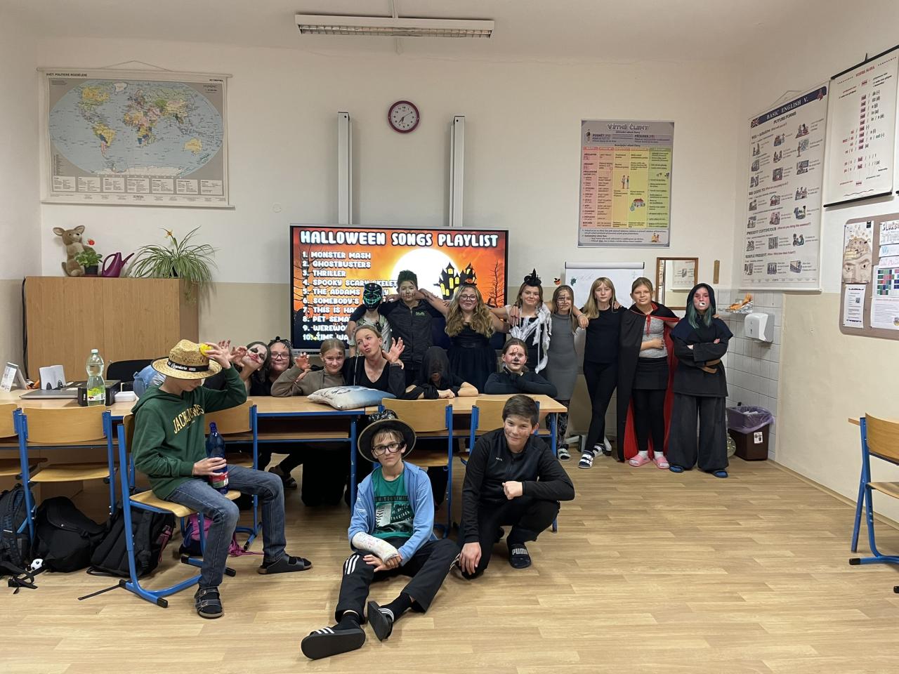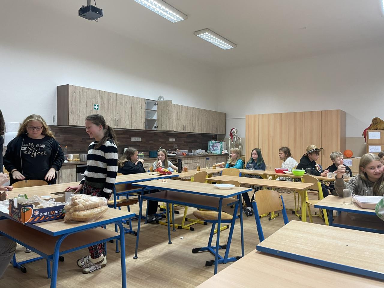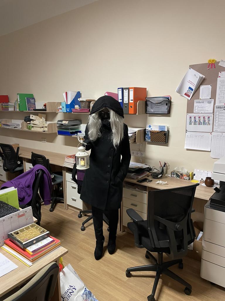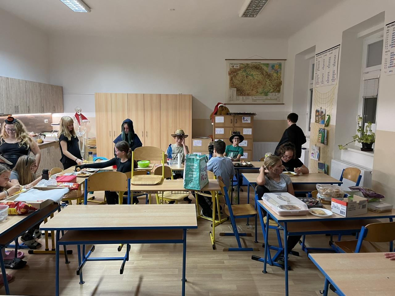 Ve čtvrtek 31.10. se uskutečnila na přání dětí Halloweenská třídnická hodina s přespáním ve škole. Už samotné přespání bylo pro většinu velký zážitek, protože poznat školu tak nevšedně tichou, udělat si kuchyň, obývák i ložnici ve své třídě se nestává každý den. K Halloweenu patří samozřejmě masky, v kterých jsme se na 18:00 večerní sešli v šatnách. Některé byly opravdu nápadité až děsivé, takže samozřejmě nechybělo vyhodnocení té nejlepší. Tou se stala žákyně 7. ročníku N. Imramovská za svého „Jokera“. Hlasování o nejlepší kostým však ještě předcházela společná večeře a diskotéka, kdy byly děti sami sobě Dj´s a každý si mohl pustit tu svou oblíbenou. Před diskotékou jsme si ještě stihli říct, co to vlastně Halloween je, jaké se k němu vážou zvyky a jak na něj pohlíží v jiných zemí. Pohoštění, které si žáci připravili doma, stačilo na večeři, večerní film i snídani. Společně jsme si uvařili ještě i pečenou dýňovou polévku, která se nám moc povedla. Chybět nemohla samozřejmě hra na schovávanou, kdy jsme celou školu zhasli a vyjma sborovny, ředitelny, záchodů sklepa a půdy se mohli žáci ukrýt kdekoliv na škole. Pro velký úspěch se hrálo celkem asi 7 kol. Děkujeme pí. učitelce Martině Trachtové za nevšední ozvláštnění jednoho kola, kdy děti decentně překvapila ve svém strašidelném kostýmu. Na závěr večera jsme si pustili halloweenský animák Coralina, jenž jsme vydrželi až do jeho konce o půlnoci. Dívky ještě netradičně po překlenutí půlnoci popřály jedné z žákyň a šlo se spát, abychom byli připraveni na páteční výuku. Ráno jsme po snídani, kterou nám obstarala pí. učitelka Kocourková, dali třídy opět do pořádku a těšili se z nevšedně prožitého večera ve škole.