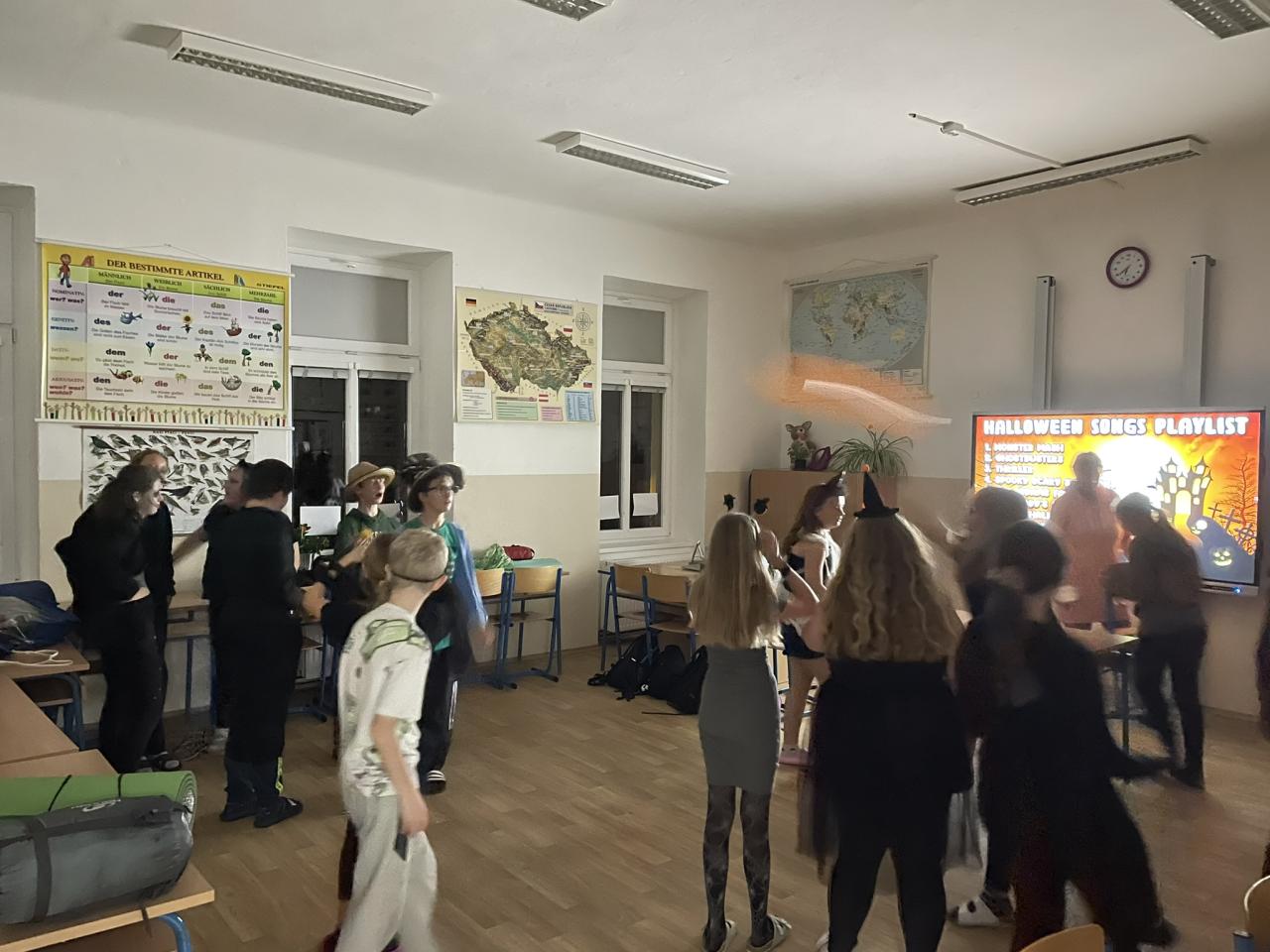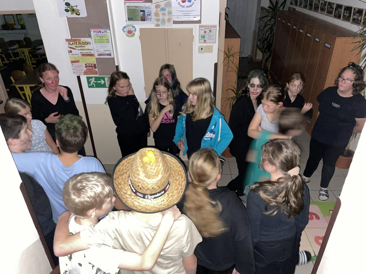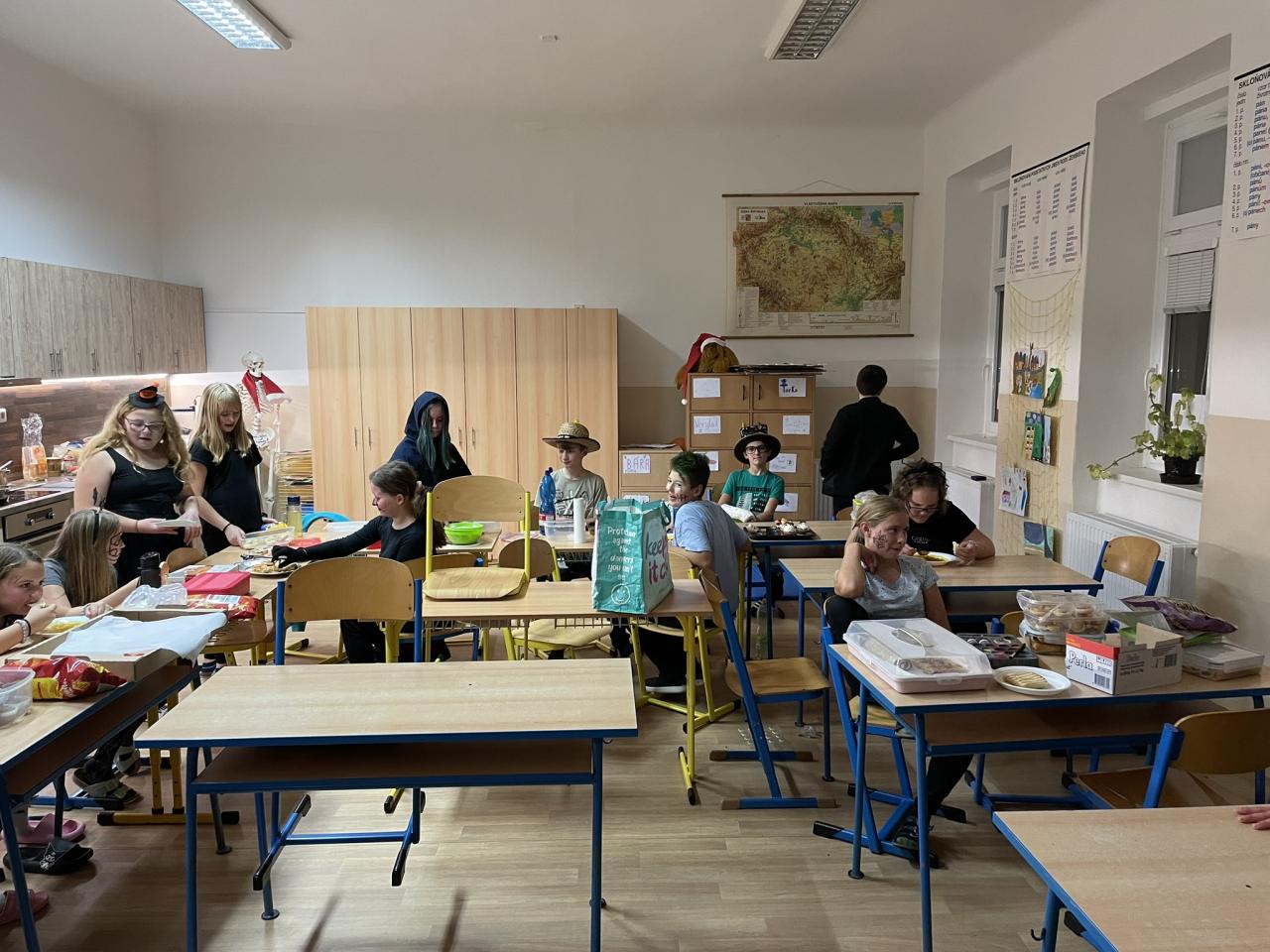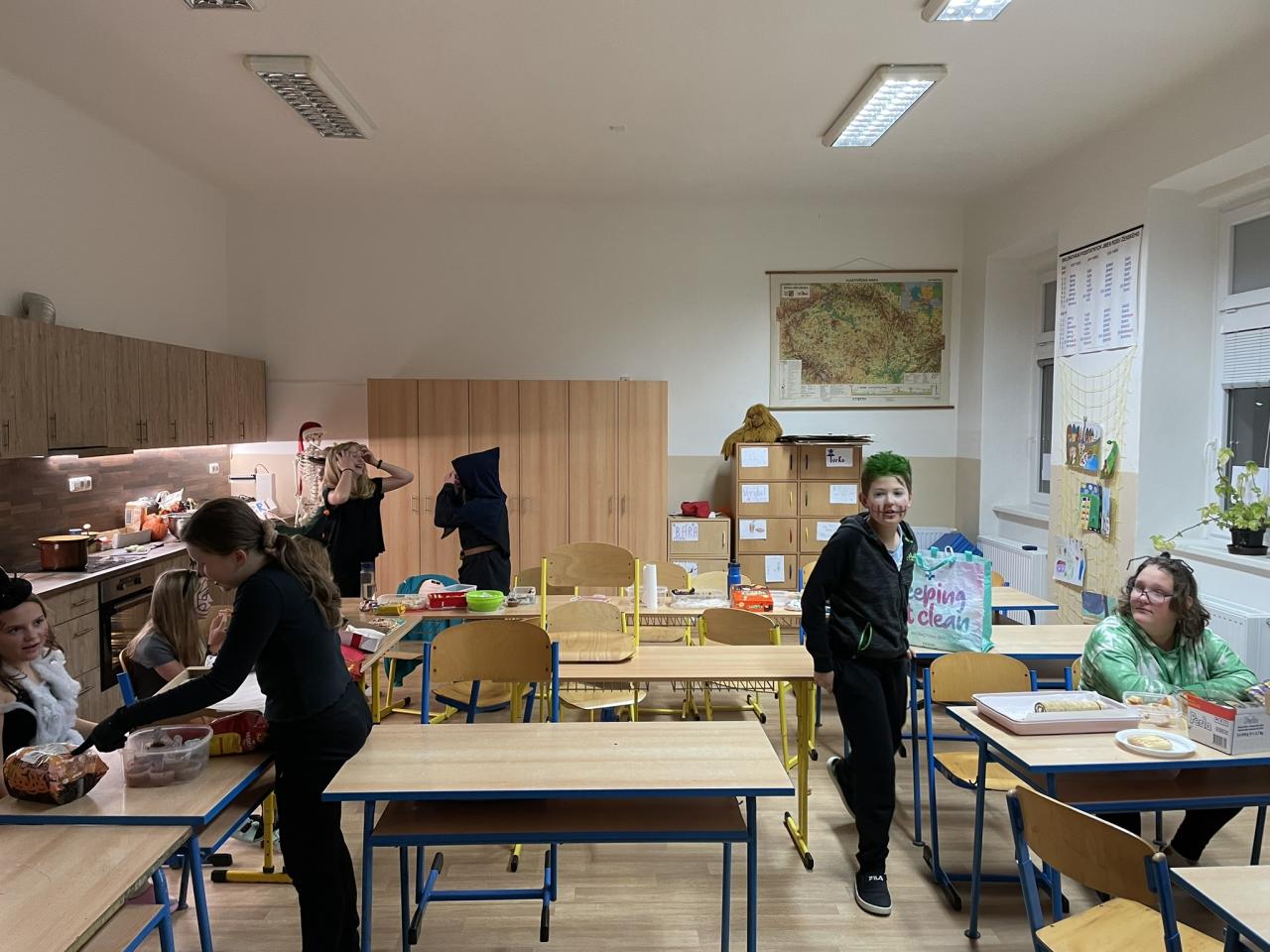 Ve čtvrtek 31.10. se uskutečnila na přání dětí Halloweenská třídnická hodina s přespáním ve škole. Už samotné přespání bylo pro většinu velký zážitek, protože poznat školu tak nevšedně tichou, udělat si kuchyň, obývák i ložnici ve své třídě se nestává každý den. K Halloweenu patří samozřejmě masky, v kterých jsme se na 18:00 večerní sešli v šatnách. Některé byly opravdu nápadité až děsivé, takže samozřejmě nechybělo vyhodnocení té nejlepší. Tou se stala žákyně 7. ročníku N. Imramovská za svého „Jokera“. Hlasování o nejlepší kostým však ještě předcházela společná večeře a diskotéka, kdy byly děti sami sobě Dj´s a každý si mohl pustit tu svou oblíbenou. Před diskotékou jsme si ještě stihli říct, co to vlastně Halloween je, jaké se k němu vážou zvyky a jak na něj pohlíží v jiných zemí. Pohoštění, které si žáci připravili doma, stačilo na večeři, večerní film i snídani. Společně jsme si uvařili ještě i pečenou dýňovou polévku, která se nám moc povedla. Chybět nemohla samozřejmě hra na schovávanou, kdy jsme celou školu zhasli a vyjma sborovny, ředitelny, záchodů sklepa a půdy se mohli žáci ukrýt kdekoliv na škole. Pro velký úspěch se hrálo celkem asi 7 kol. Děkujeme pí. učitelce Martině Trachtové za nevšední ozvláštnění jednoho kola, kdy děti decentně překvapila ve svém strašidelném kostýmu. Na závěr večera jsme si pustili halloweenský animák Coralina, jenž jsme vydrželi až do jeho konce o půlnoci. Dívky ještě netradičně po překlenutí půlnoci popřály jedné z žákyň a šlo se spát, abychom byli připraveni na páteční výuku. Ráno jsme po snídani, kterou nám obstarala pí. učitelka Kocourková, dali třídy opět do pořádku a těšili se z nevšedně prožitého večera ve škole.