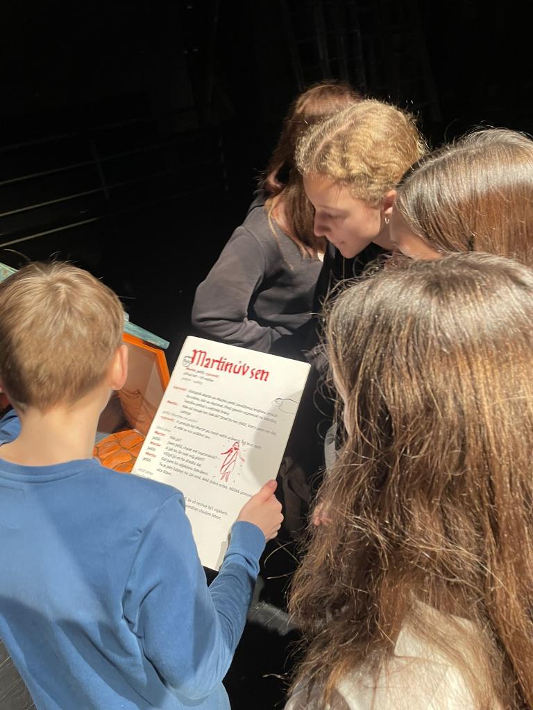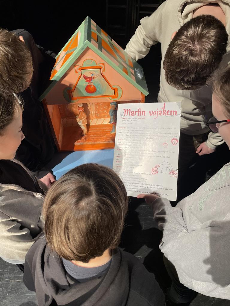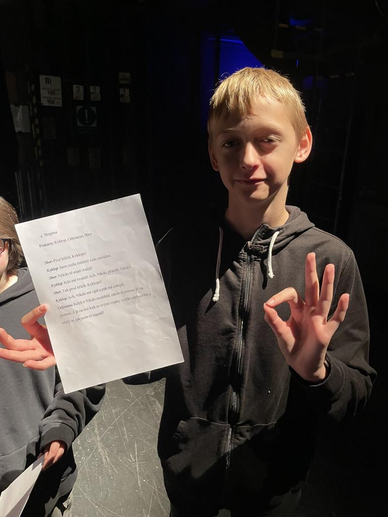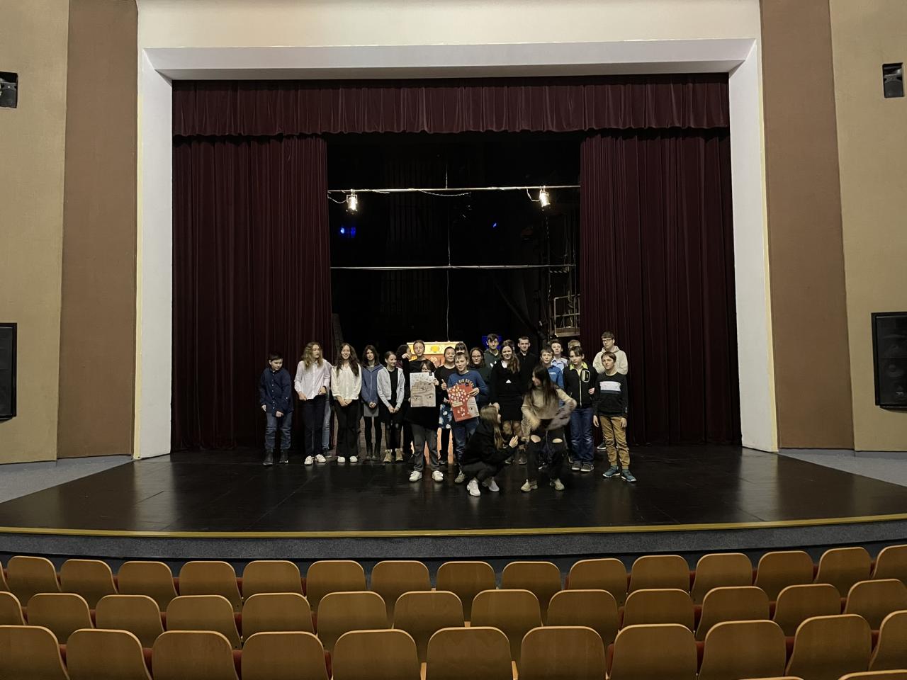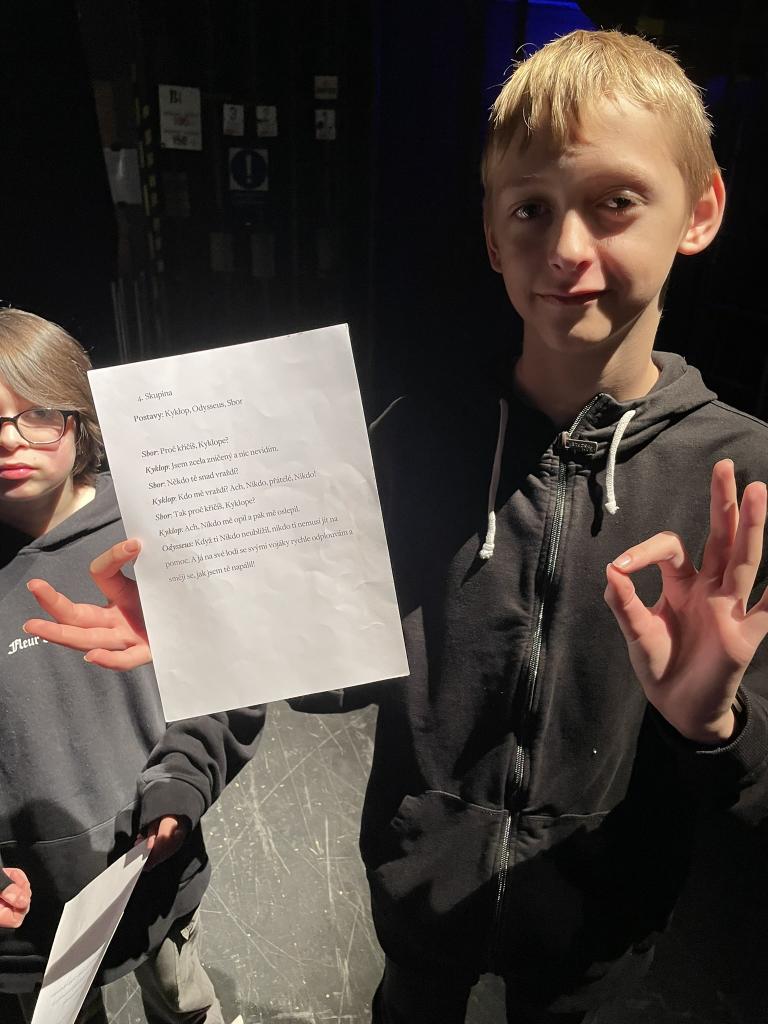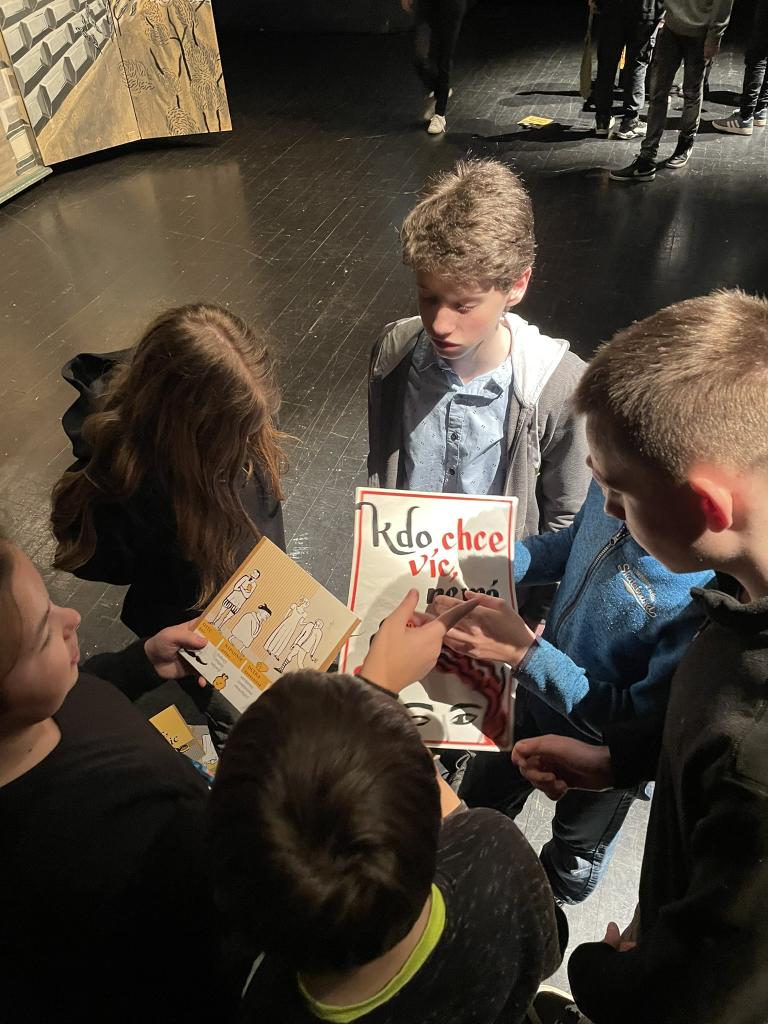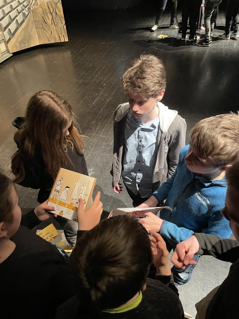 Ve čtvrtek 22. 2. 2024 se za kulturou vydalo 27 žáků z šesté až osmé třídy. Věděli, že nezhlédnou „klasickou“ divadelní hru, ale dozvědí se něco o tom, jak vzniklo a vyvíjelo se divadlo. Program je určený pro jednu skupinu žáků, takže jsme byli v celém divadle sami. Už to bylo zvláštní. Zajímavý byl i vstup – do sálu jsme vešli postranními dveřmi a pokračovali na jeviště, vzápětí se za námi zatáhla opona. Všechny nás to překvapilo.