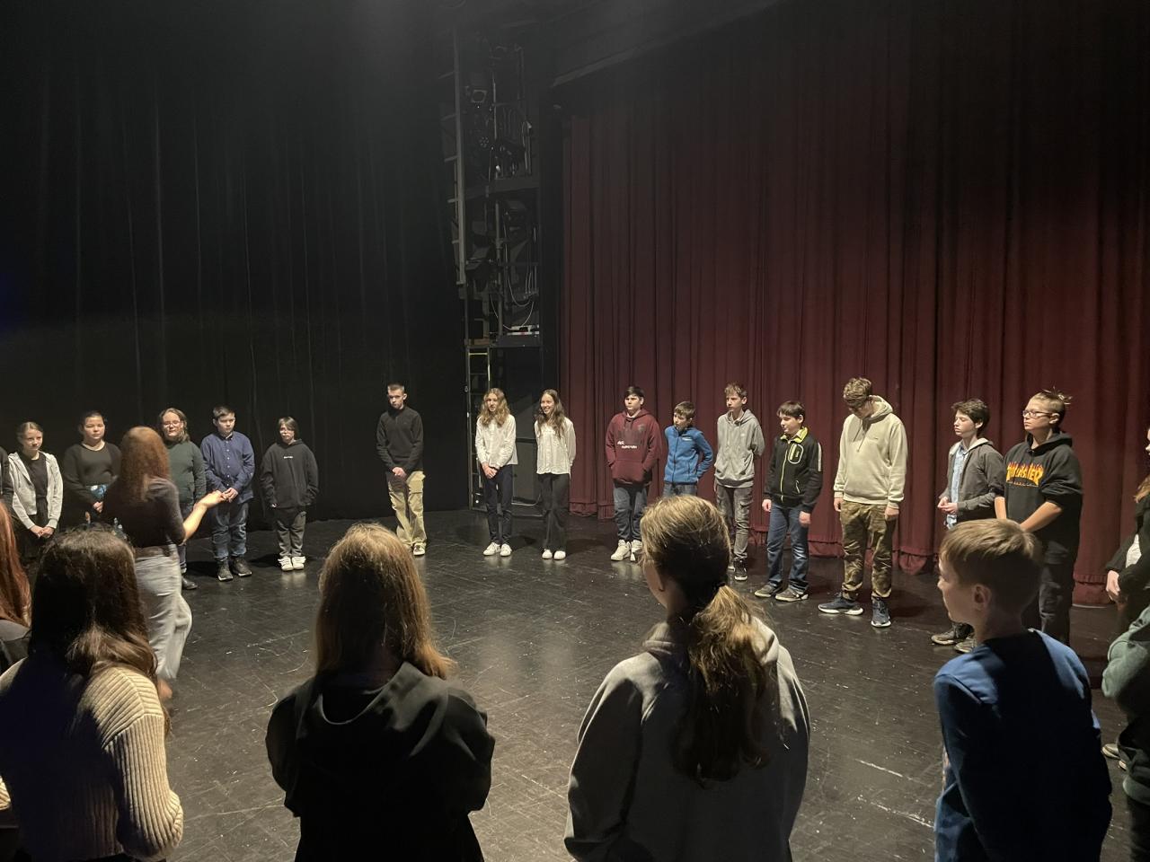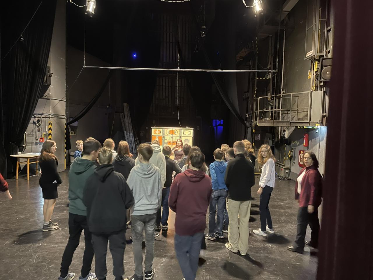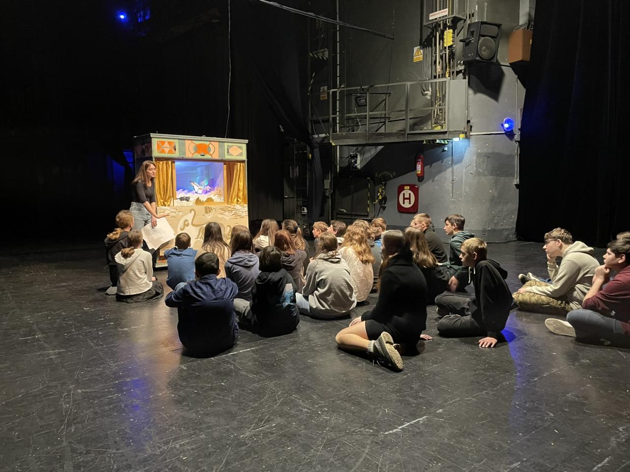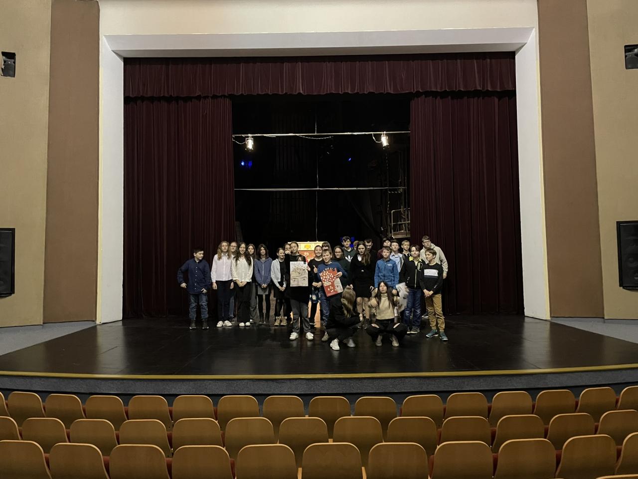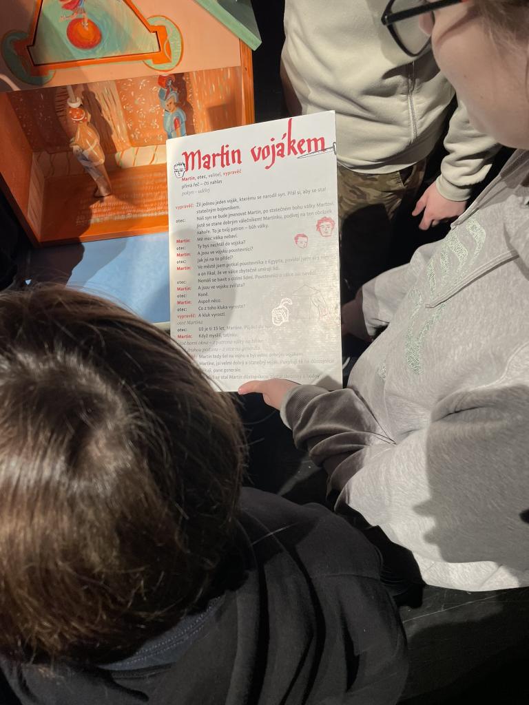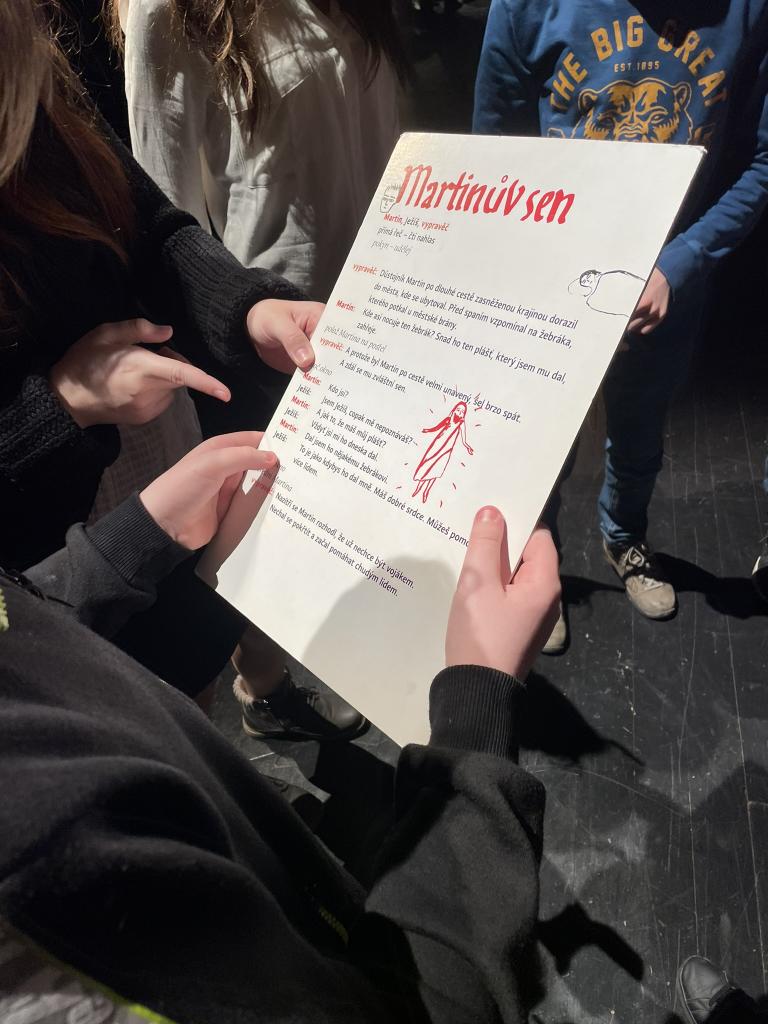 Ve čtvrtek 22. 2. 2024 se za kulturou vydalo 27 žáků z šesté až osmé třídy. Věděli, že nezhlédnou „klasickou“ divadelní hru, ale dozvědí se něco o tom, jak vzniklo a vyvíjelo se divadlo. Program je určený pro jednu skupinu žáků, takže jsme byli v celém divadle sami. Už to bylo zvláštní. Zajímavý byl i vstup – do sálu jsme vešli postranními dveřmi a pokračovali na jeviště, vzápětí se za námi zatáhla opona. Všechny nás to překvapilo.