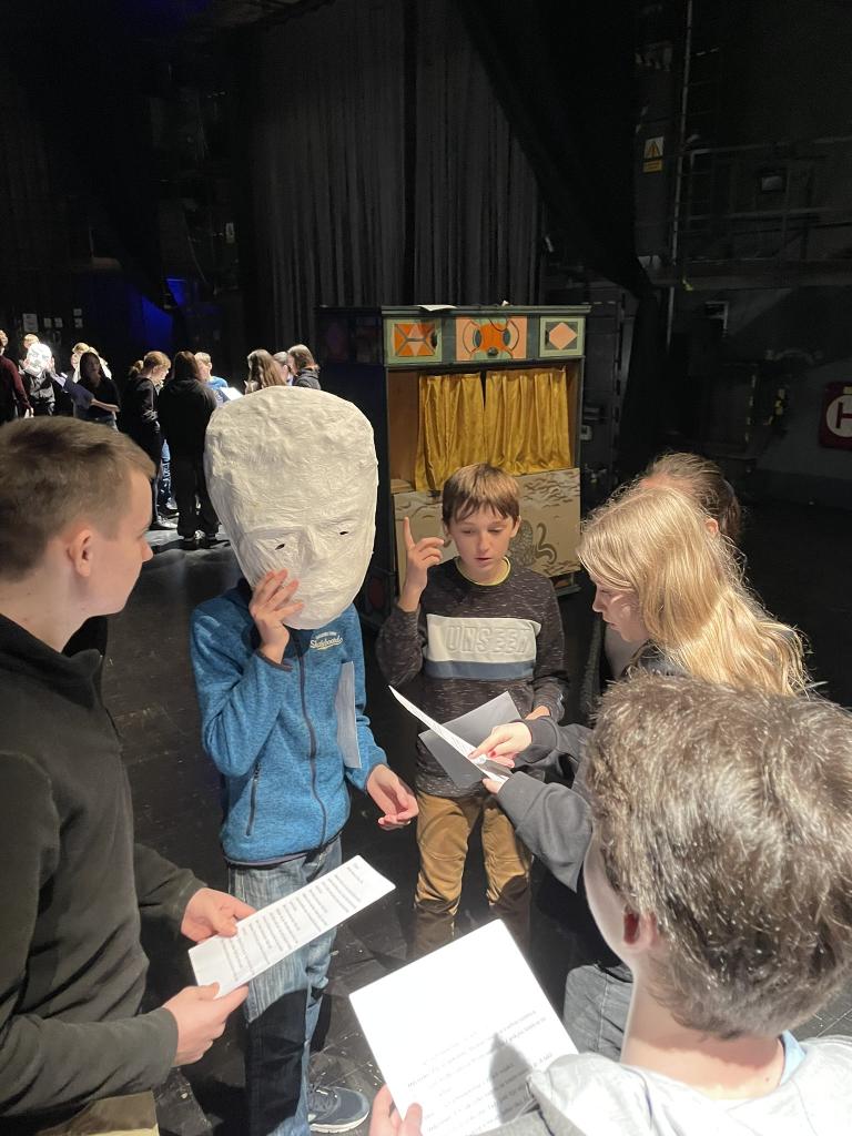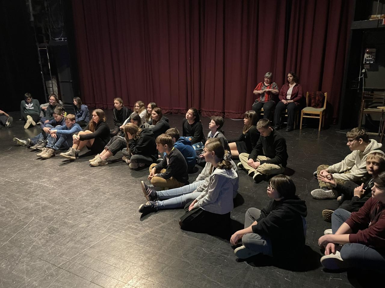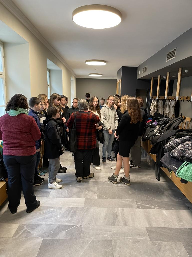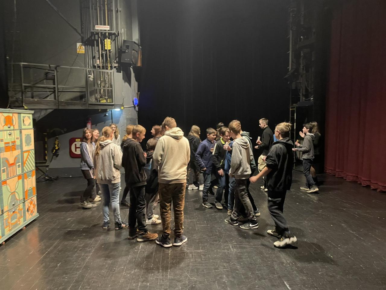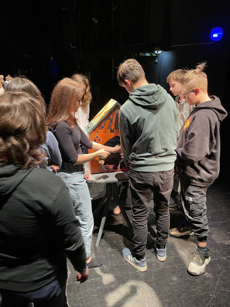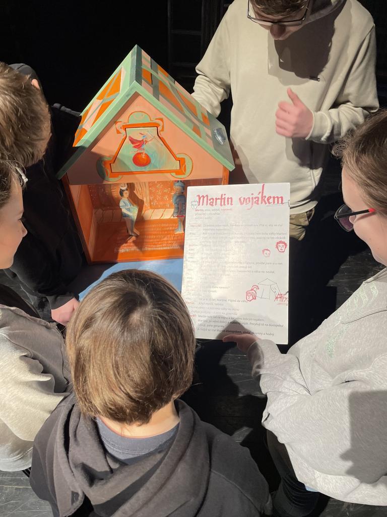 Ve čtvrtek 22. 2. 2024 se za kulturou vydalo 27 žáků z šesté až osmé třídy. Věděli, že nezhlédnou „klasickou“ divadelní hru, ale dozvědí se něco o tom, jak vzniklo a vyvíjelo se divadlo. Program je určený pro jednu skupinu žáků, takže jsme byli v celém divadle sami. Už to bylo zvláštní. Zajímavý byl i vstup – do sálu jsme vešli postranními dveřmi a pokračovali na jeviště, vzápětí se za námi zatáhla opona. Všechny nás to překvapilo.