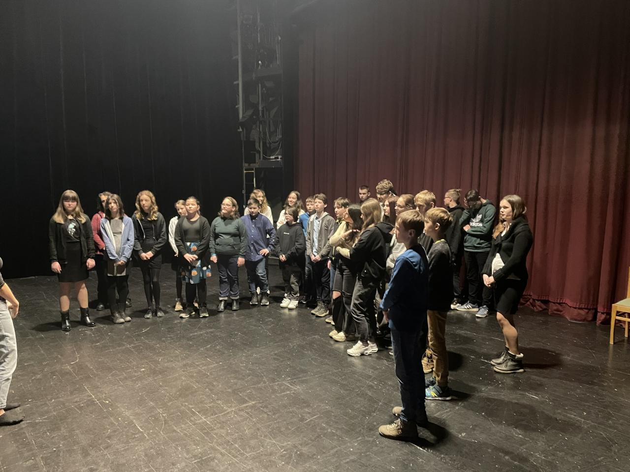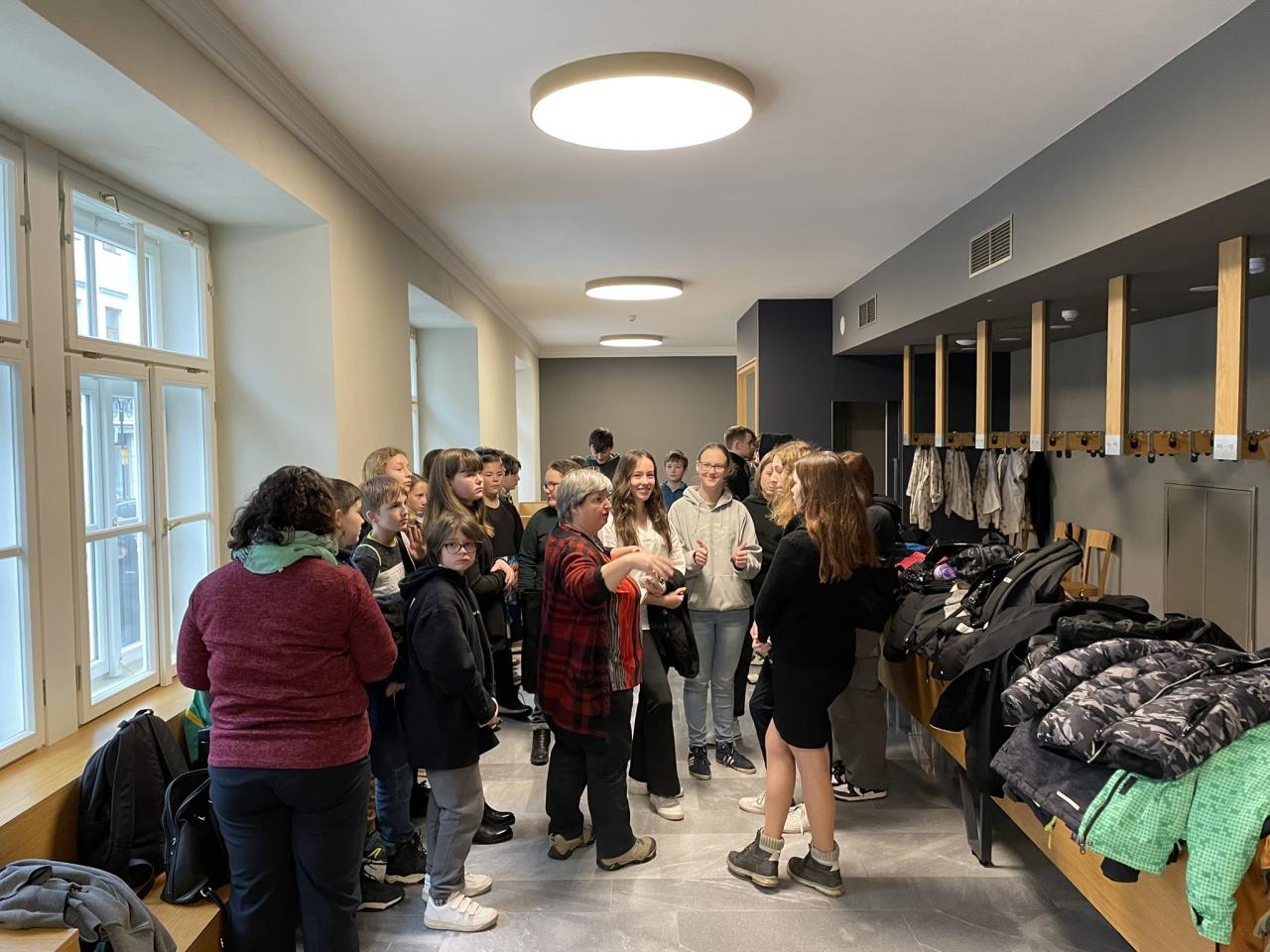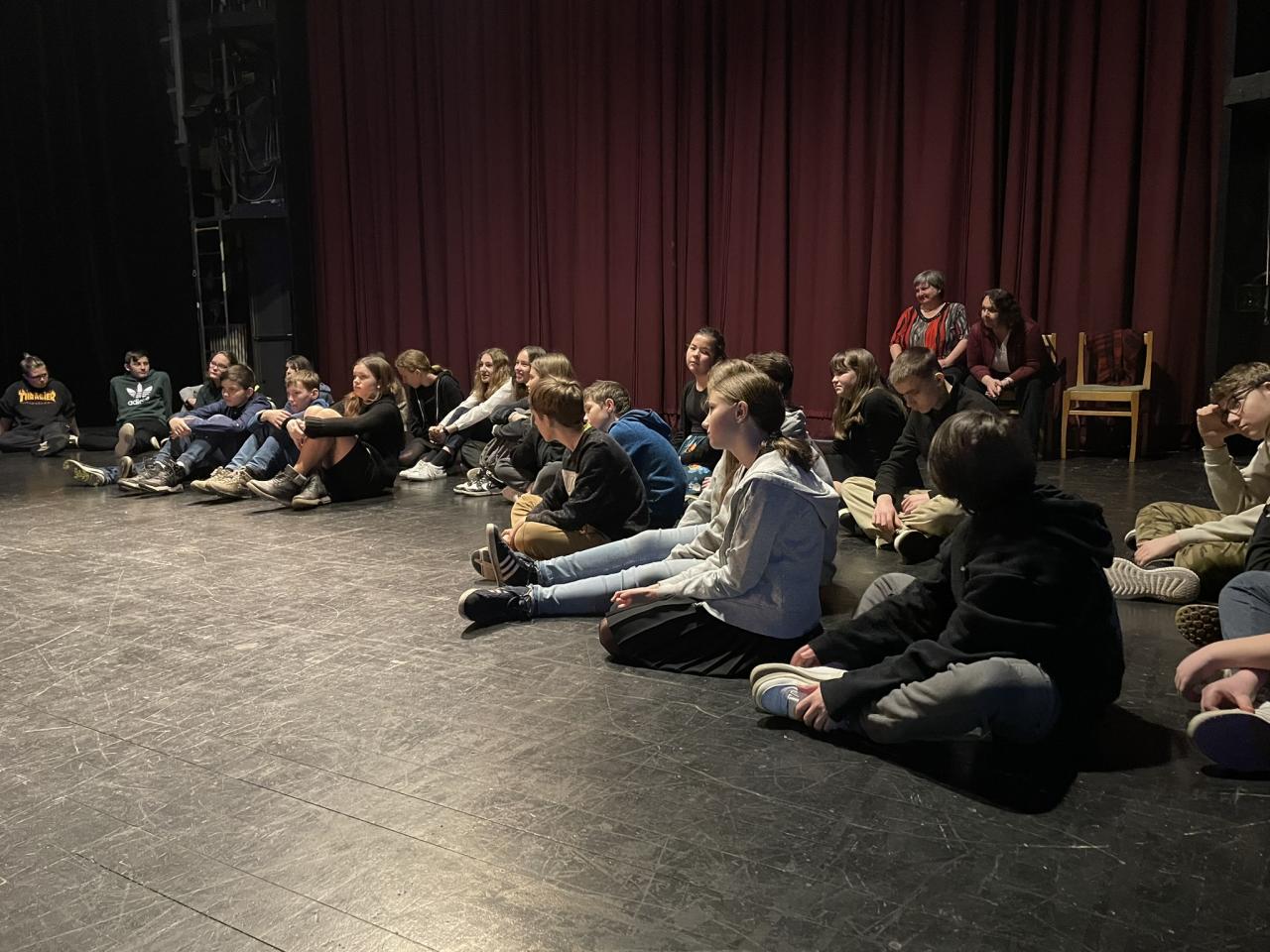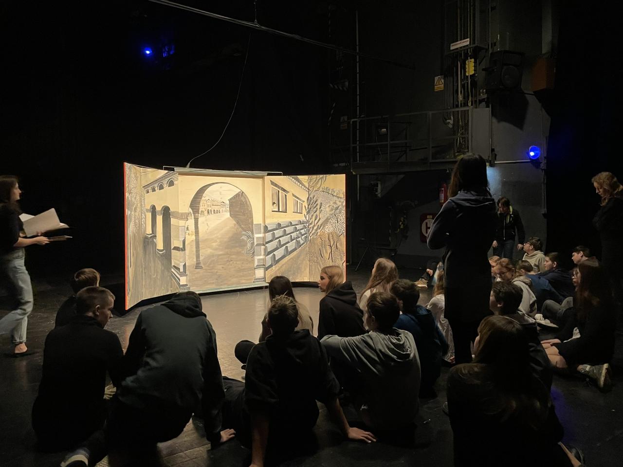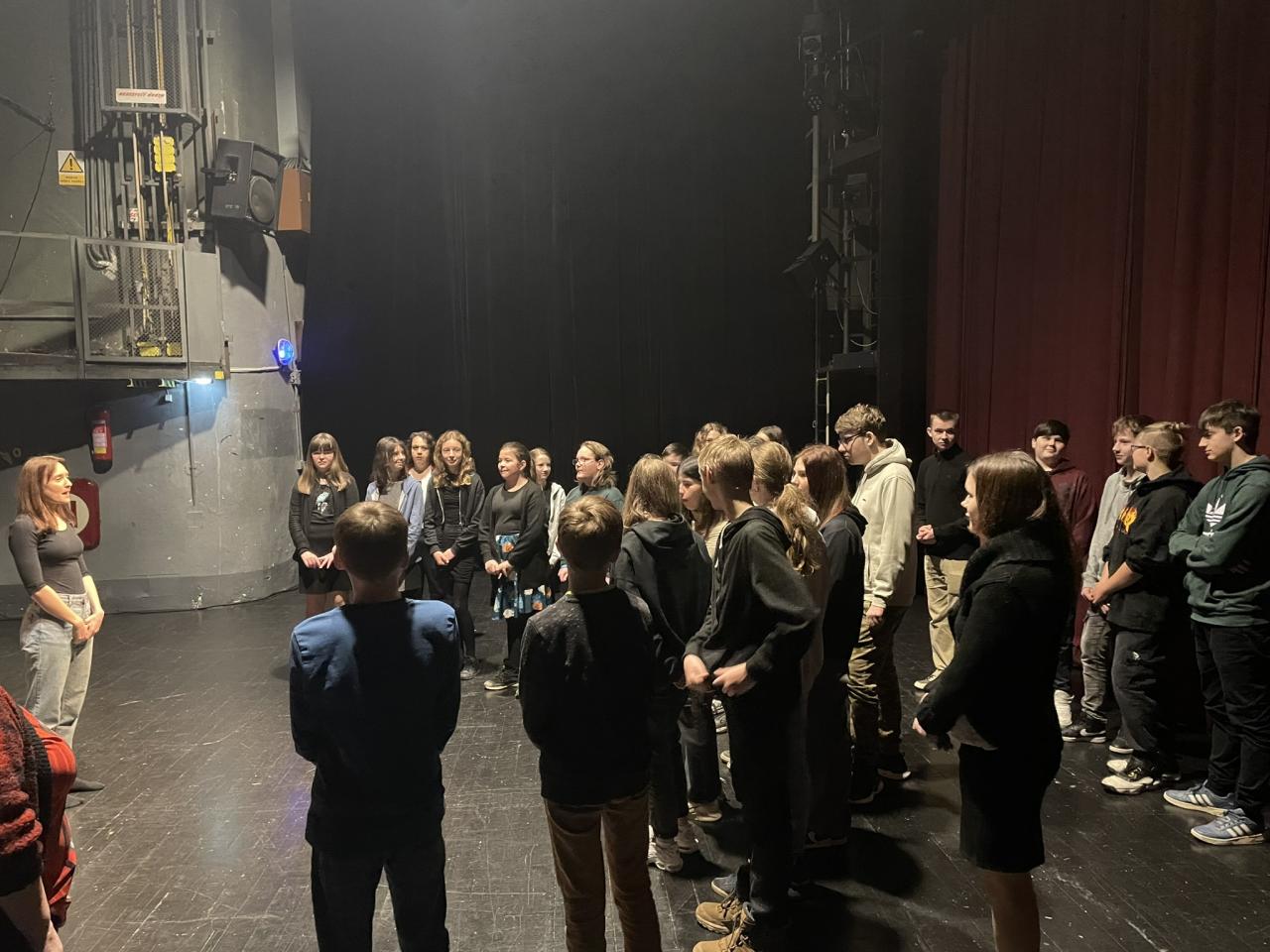 Ve čtvrtek 22. 2. 2024 se za kulturou vydalo 27 žáků z šesté až osmé třídy. Věděli, že nezhlédnou „klasickou“ divadelní hru, ale dozvědí se něco o tom, jak vzniklo a vyvíjelo se divadlo. Program je určený pro jednu skupinu žáků, takže jsme byli v celém divadle sami. Už to bylo zvláštní. Zajímavý byl i vstup – do sálu jsme vešli postranními dveřmi a pokračovali na jeviště, vzápětí se za námi zatáhla opona. Všechny nás to překvapilo.