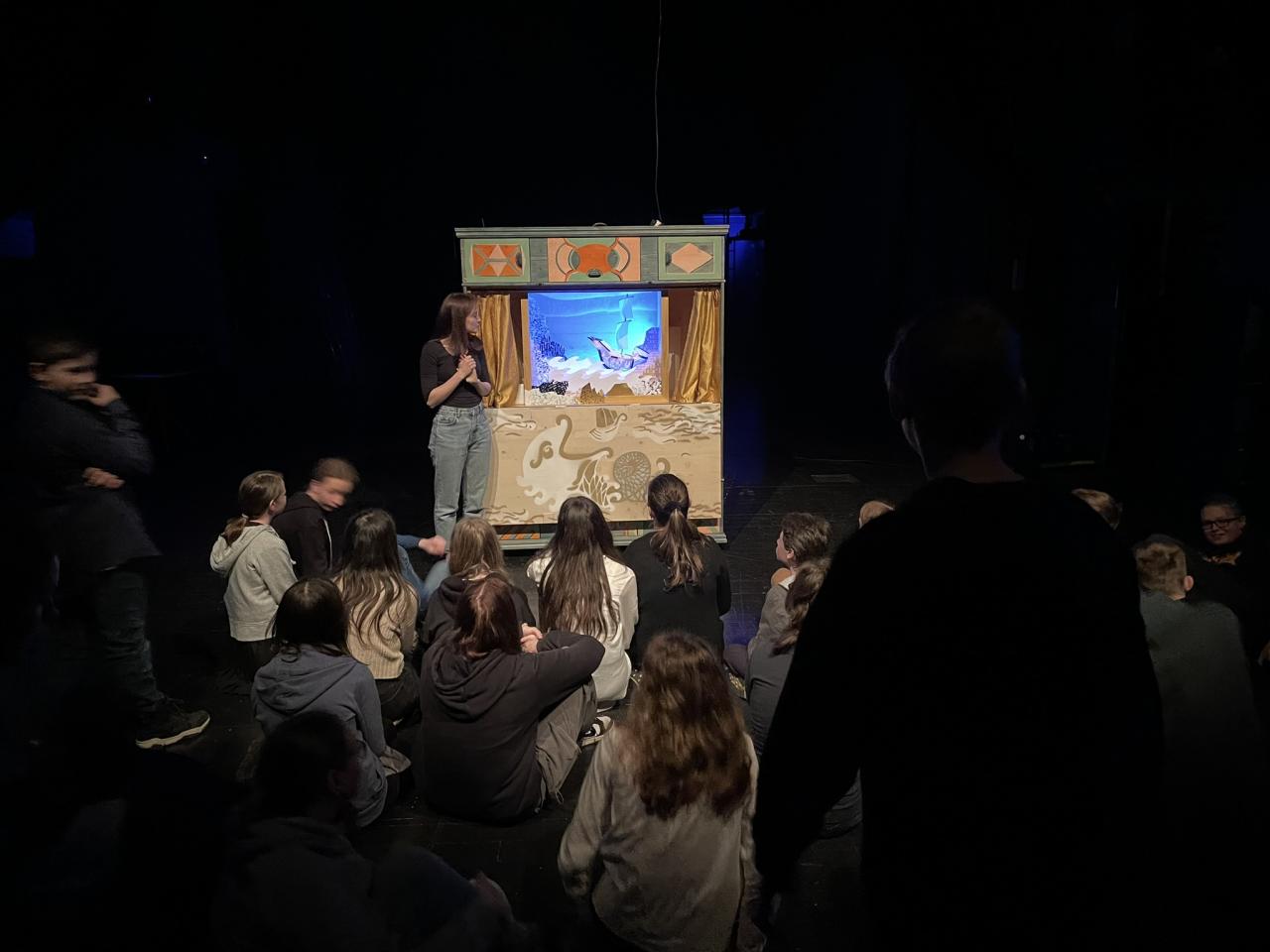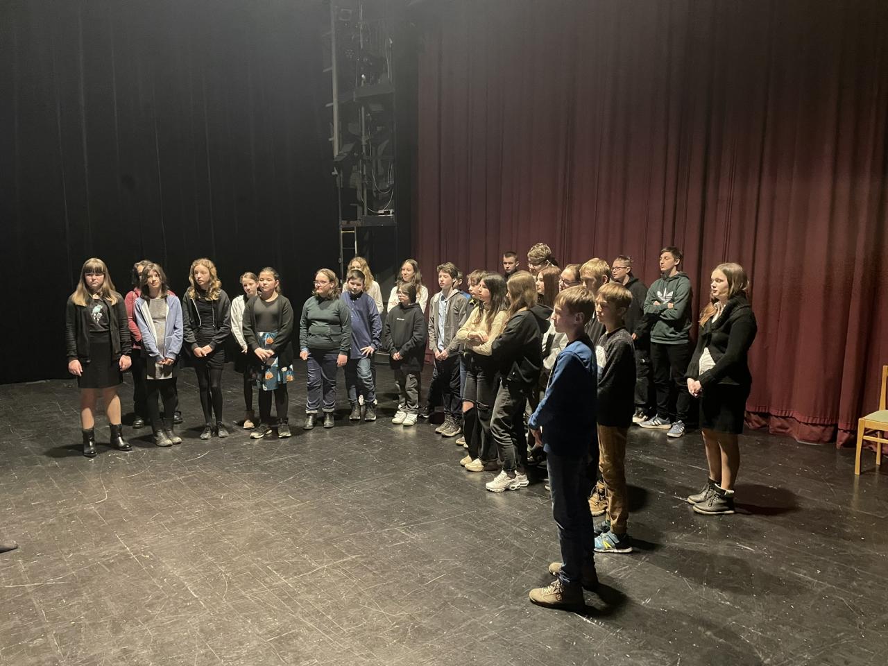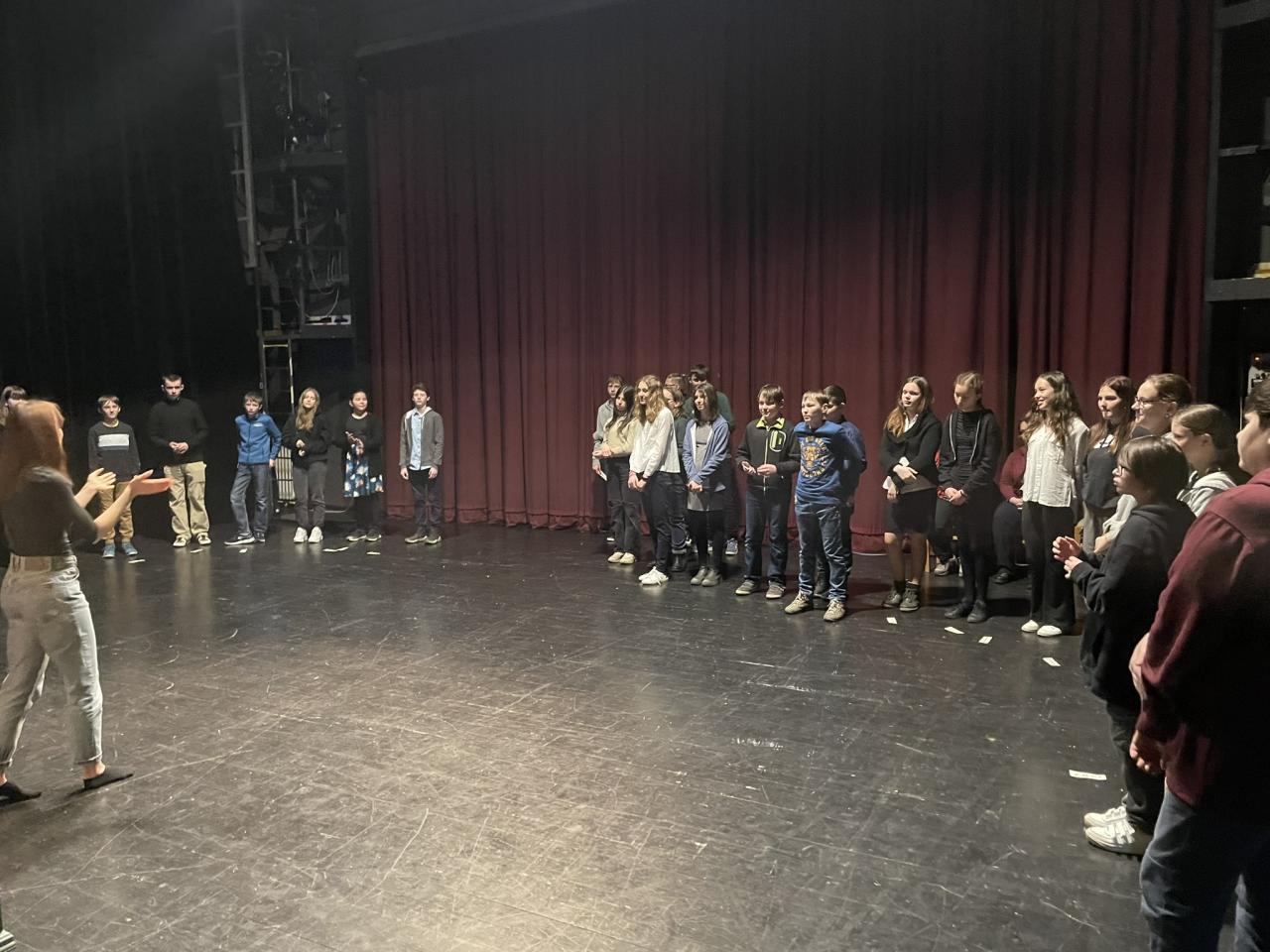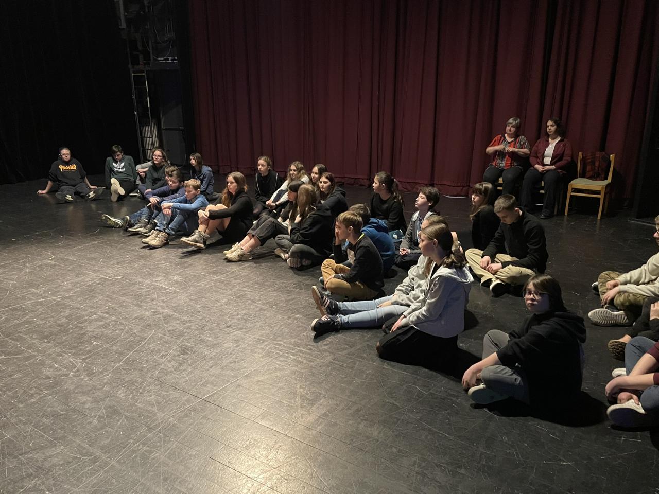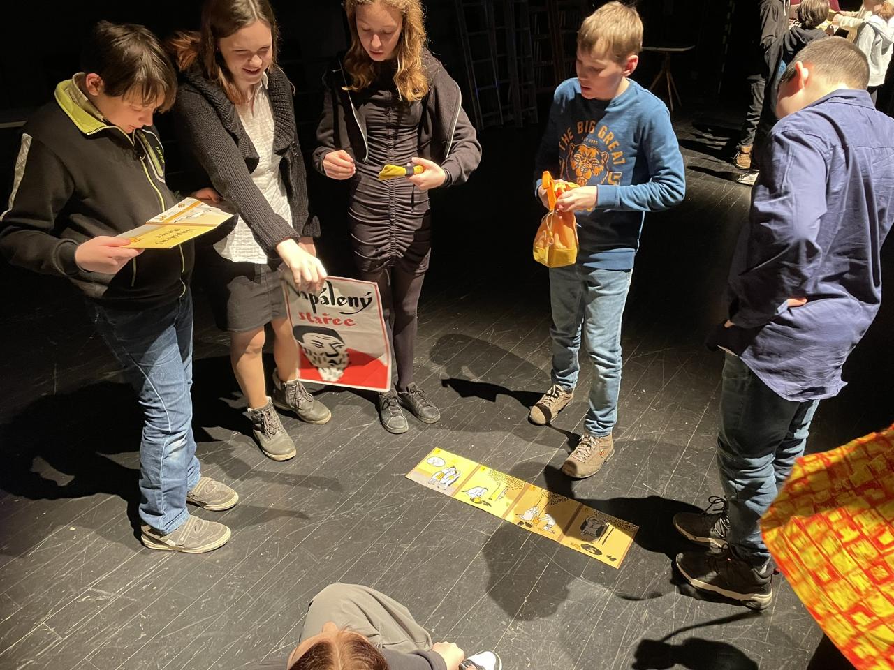 Ve čtvrtek 22. 2. 2024 se za kulturou vydalo 27 žáků z šesté až osmé třídy. Věděli, že nezhlédnou „klasickou“ divadelní hru, ale dozvědí se něco o tom, jak vzniklo a vyvíjelo se divadlo. Program je určený pro jednu skupinu žáků, takže jsme byli v celém divadle sami. Už to bylo zvláštní. Zajímavý byl i vstup – do sálu jsme vešli postranními dveřmi a pokračovali na jeviště, vzápětí se za námi zatáhla opona. Všechny nás to překvapilo.
