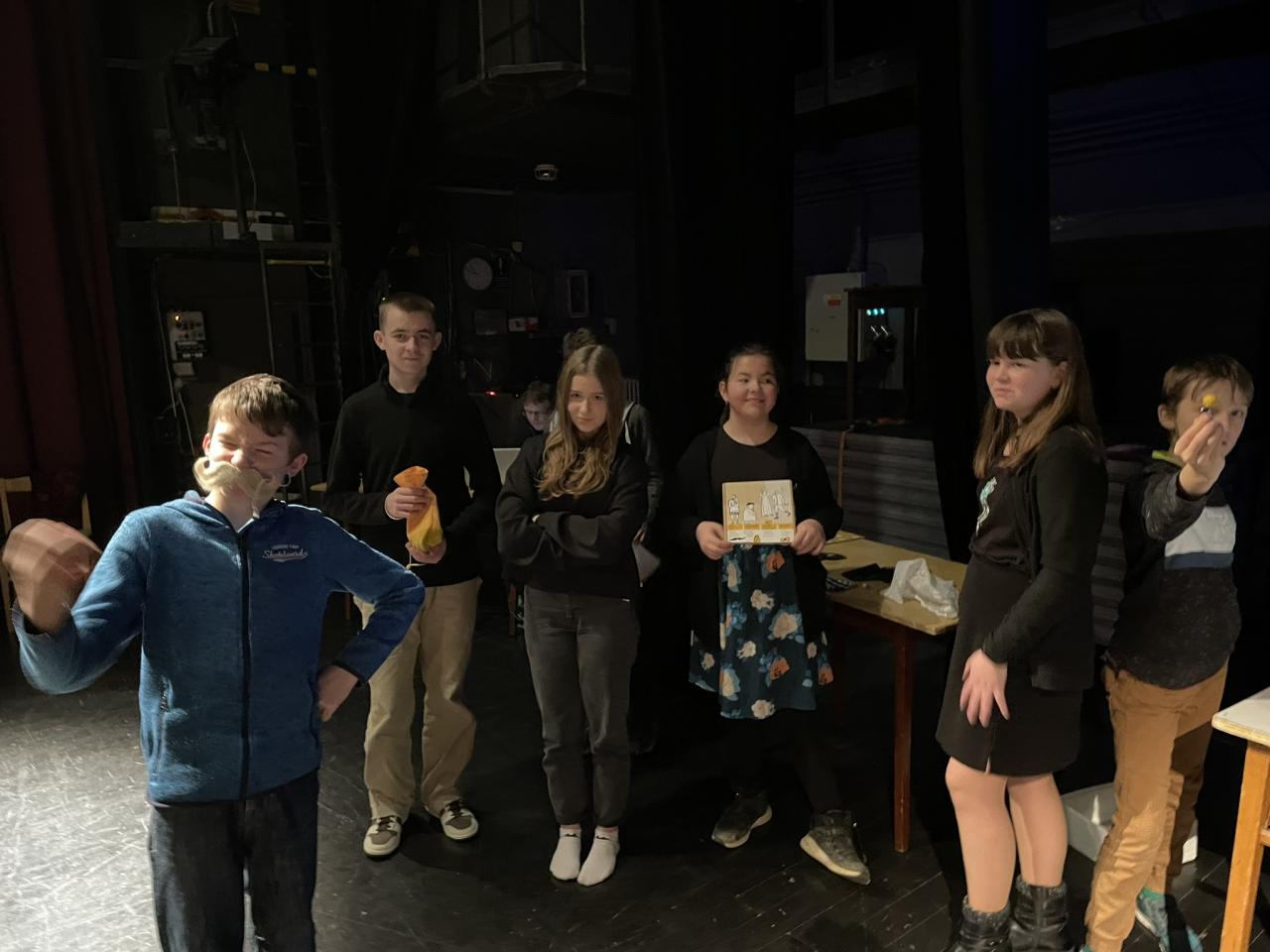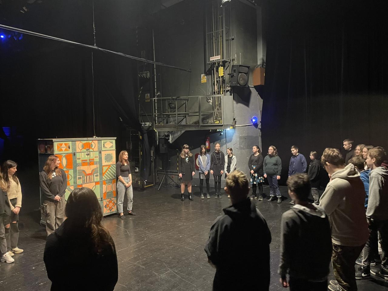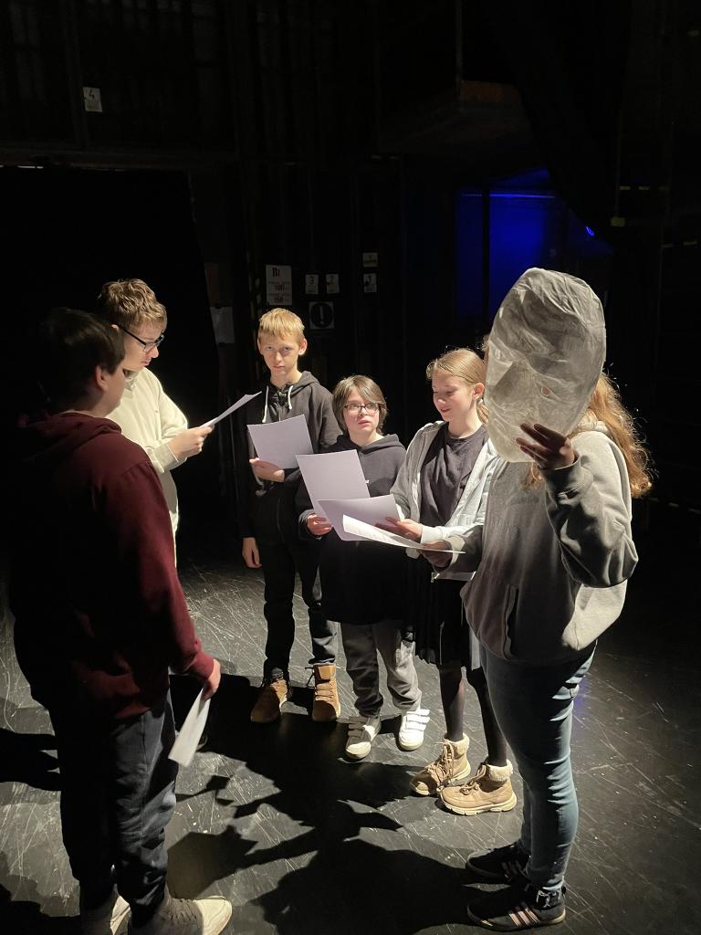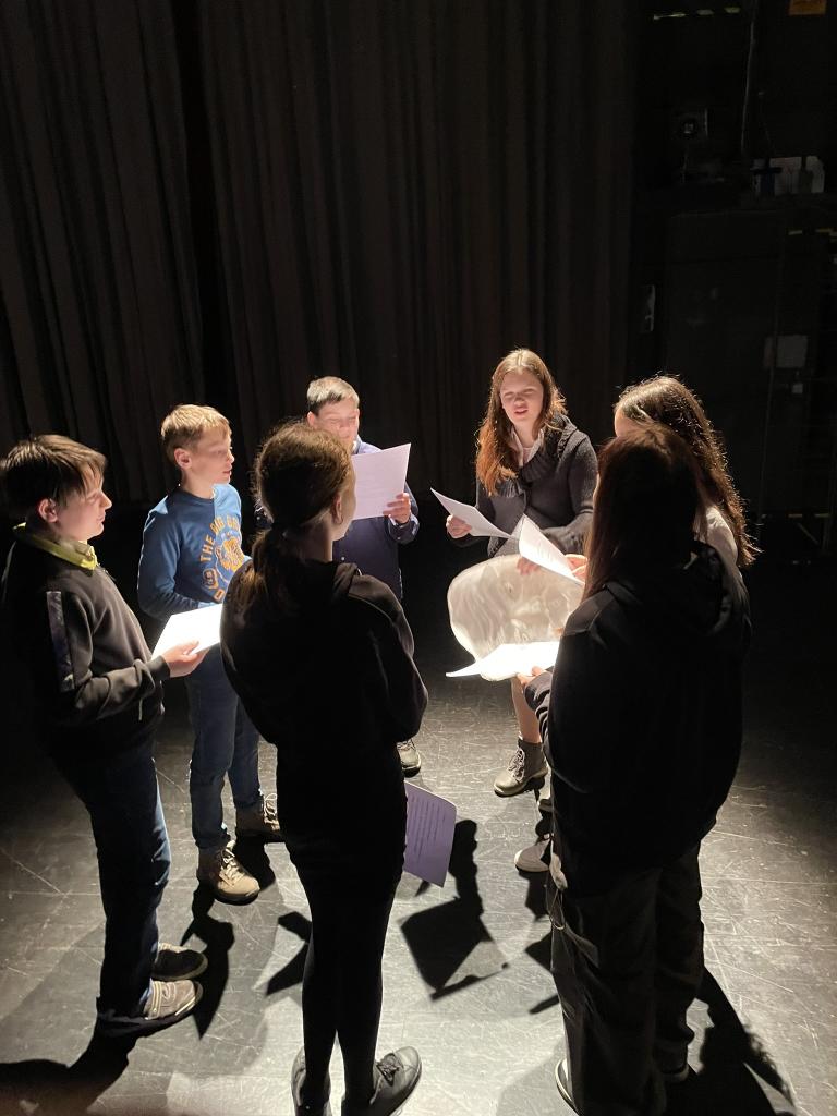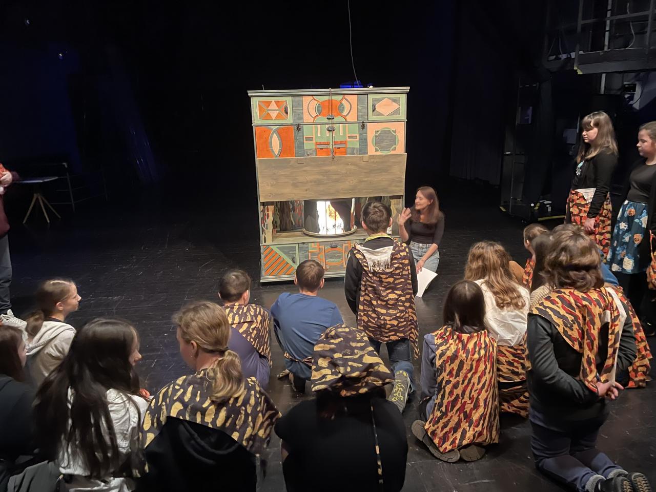 Ve čtvrtek 22. 2. 2024 se za kulturou vydalo 27 žáků z šesté až osmé třídy. Věděli, že nezhlédnou „klasickou“ divadelní hru, ale dozvědí se něco o tom, jak vzniklo a vyvíjelo se divadlo. Program je určený pro jednu skupinu žáků, takže jsme byli v celém divadle sami. Už to bylo zvláštní. Zajímavý byl i vstup – do sálu jsme vešli postranními dveřmi a pokračovali na jeviště, vzápětí se za námi zatáhla opona. Všechny nás to překvapilo.
