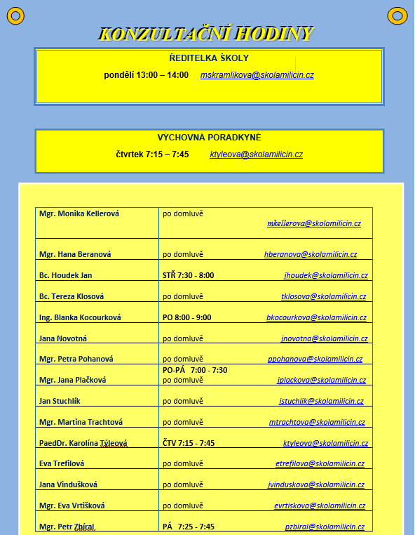 Vypsané termíny konzultačních hodin pro školní rok 2025/26