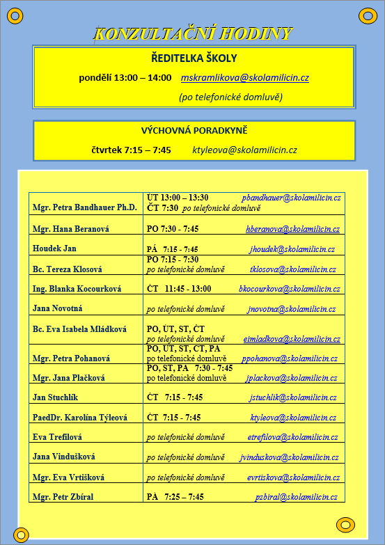 Přinášíme letošní konzultační hodiny pedagogů.