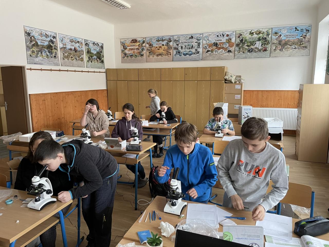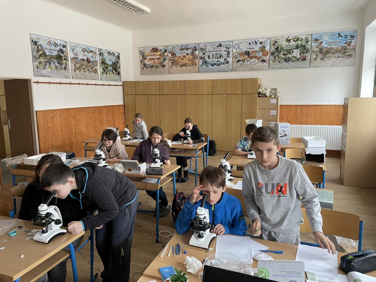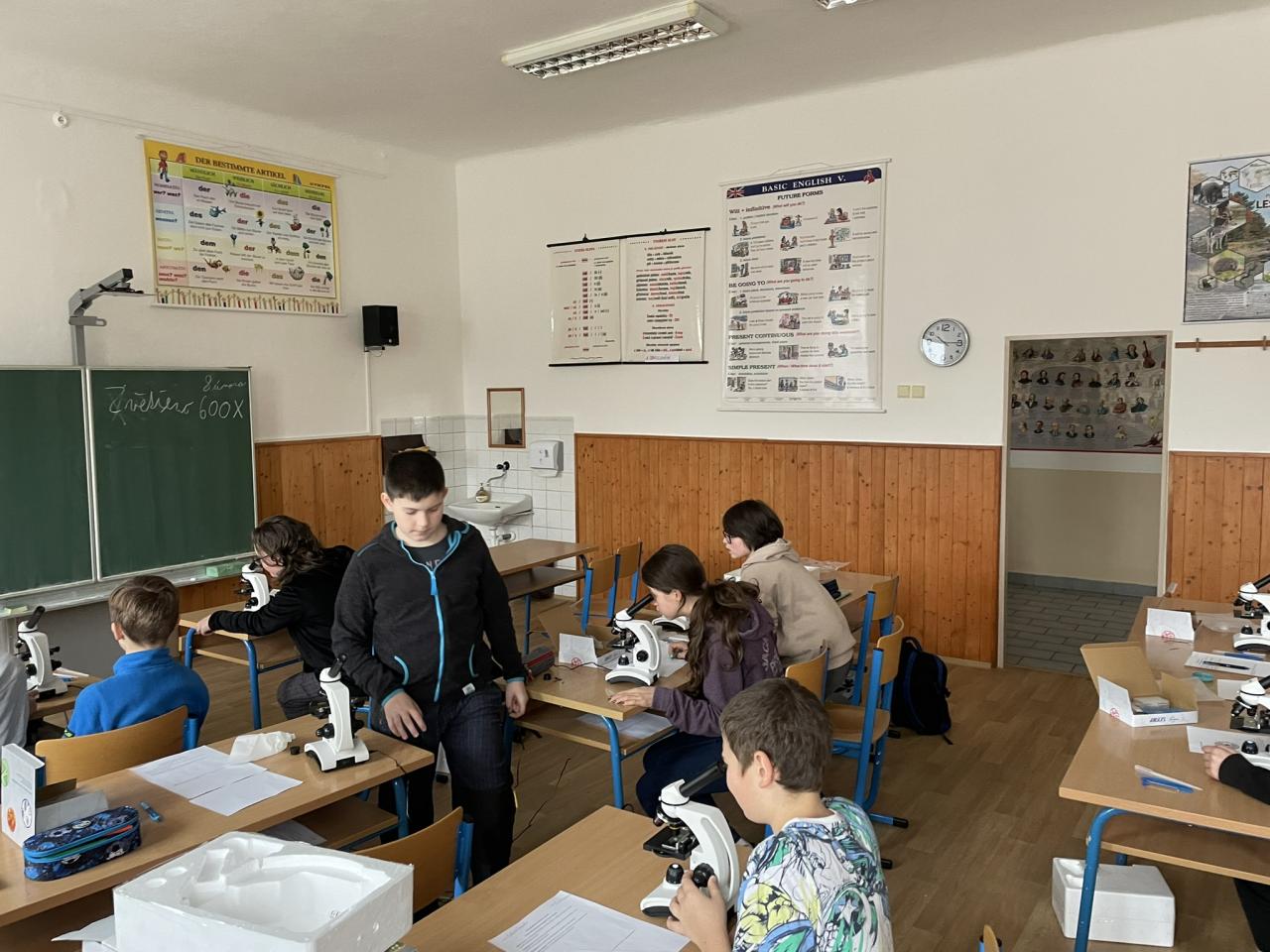 Ve čtvrtek 8. 2. jsme společně s šesťáky a sedmáky mikroskopovali. Sedmáci, kteří se již s mikroskopem setkali, připravili po krátkém opakování svým mladším spolužákům vodné vzorky jednobuněčné řasy zrněnky. Ty většina úspěšně pozorovala a zakreslila. Kromě zmíněné řasy žáci pozorovali i hlístice – háďátka a prvoky z kmene vířníků. Sedmáci si vyzkoušeli i jiné trvalé preparáty z mikroskopických sad, které jsou součástí nových školních mikroskopů. Šestý ročník si nejprve prošel teorii mikroskopování, historii mikroskopického pozorování a osahal si vůbec poprvé i samotný mikroskop. Poté jsme se již přesunuli do sedmé třídy, kde bylo vše připraveno z předchozího pozorování. Viděli jsme všechny mikro tvory a rostliny jako předchozí skupina a svá pozorování zapsali a zakreslili do laboratorního protokolu.