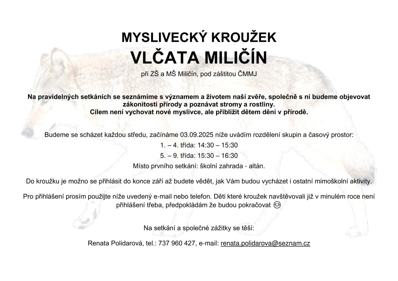 Srdečně zveme všechny malé nadšence přírody a myslivosti do Mysliveckého kroužku Vlčata