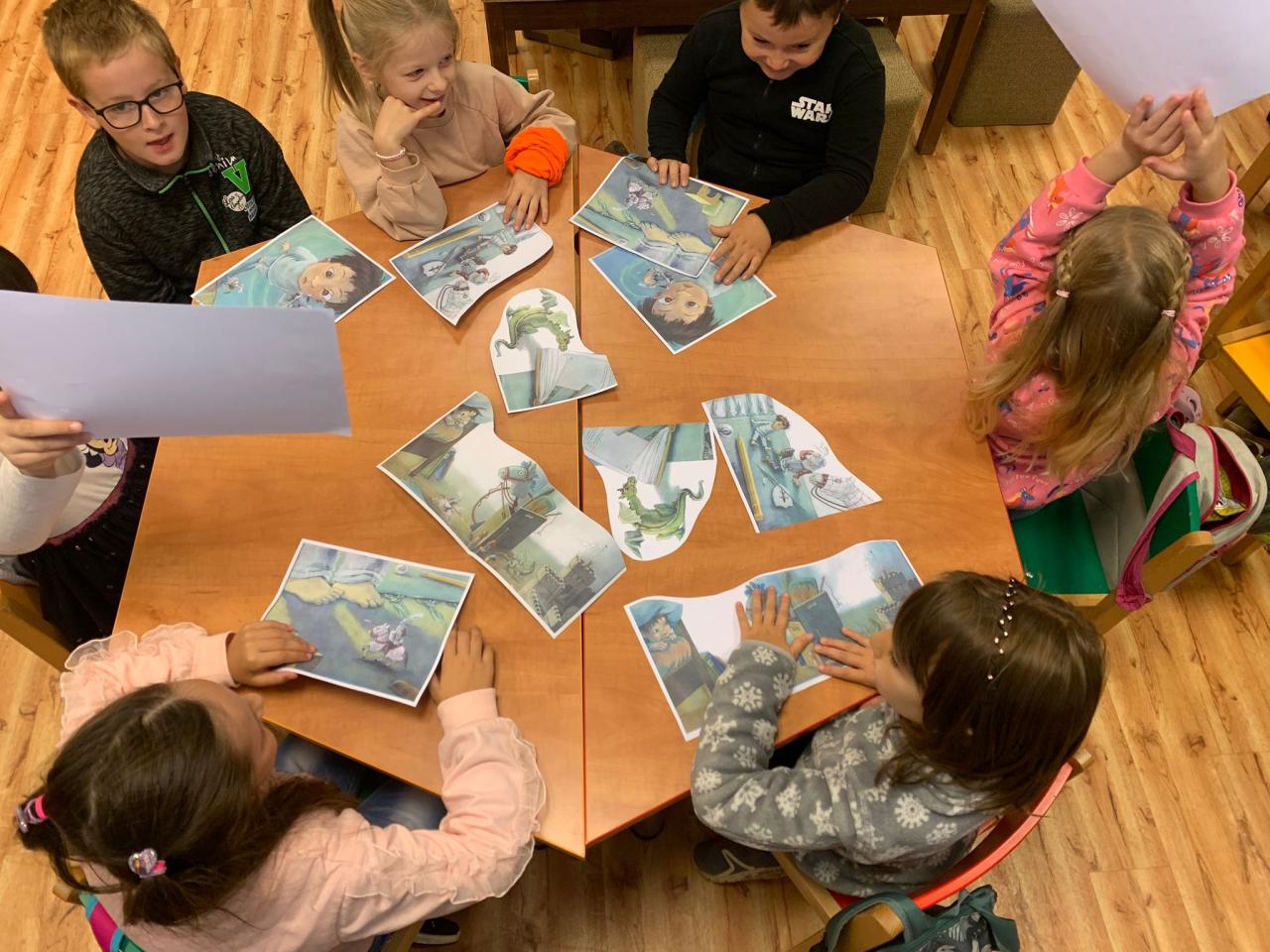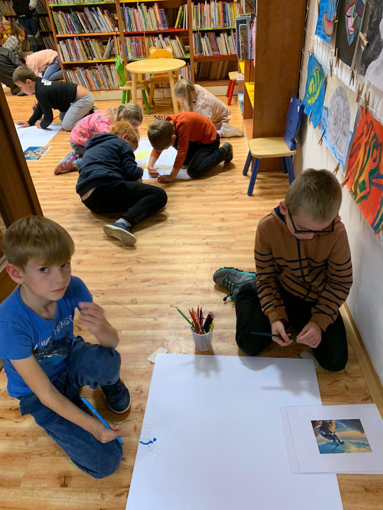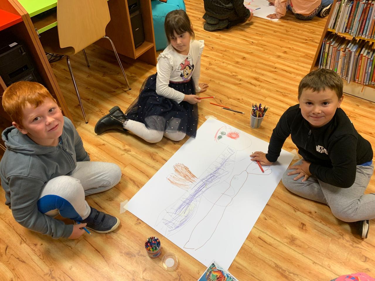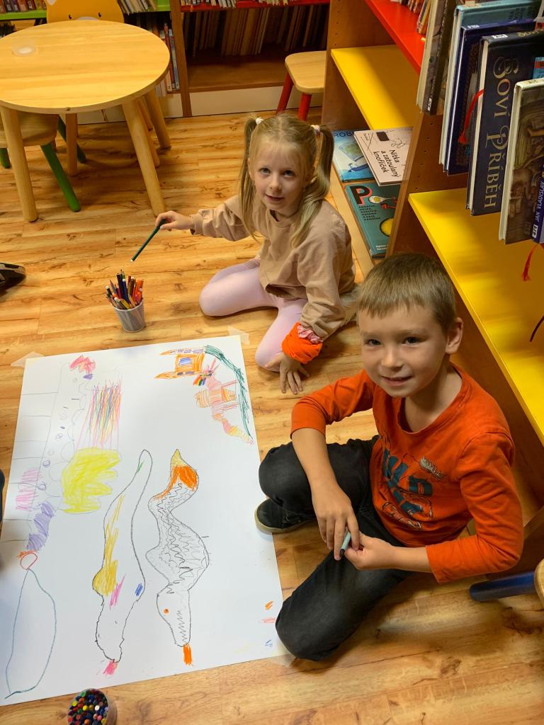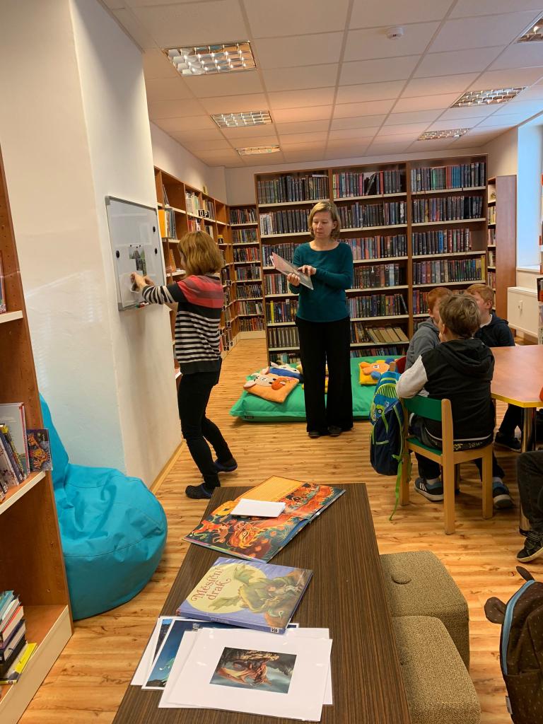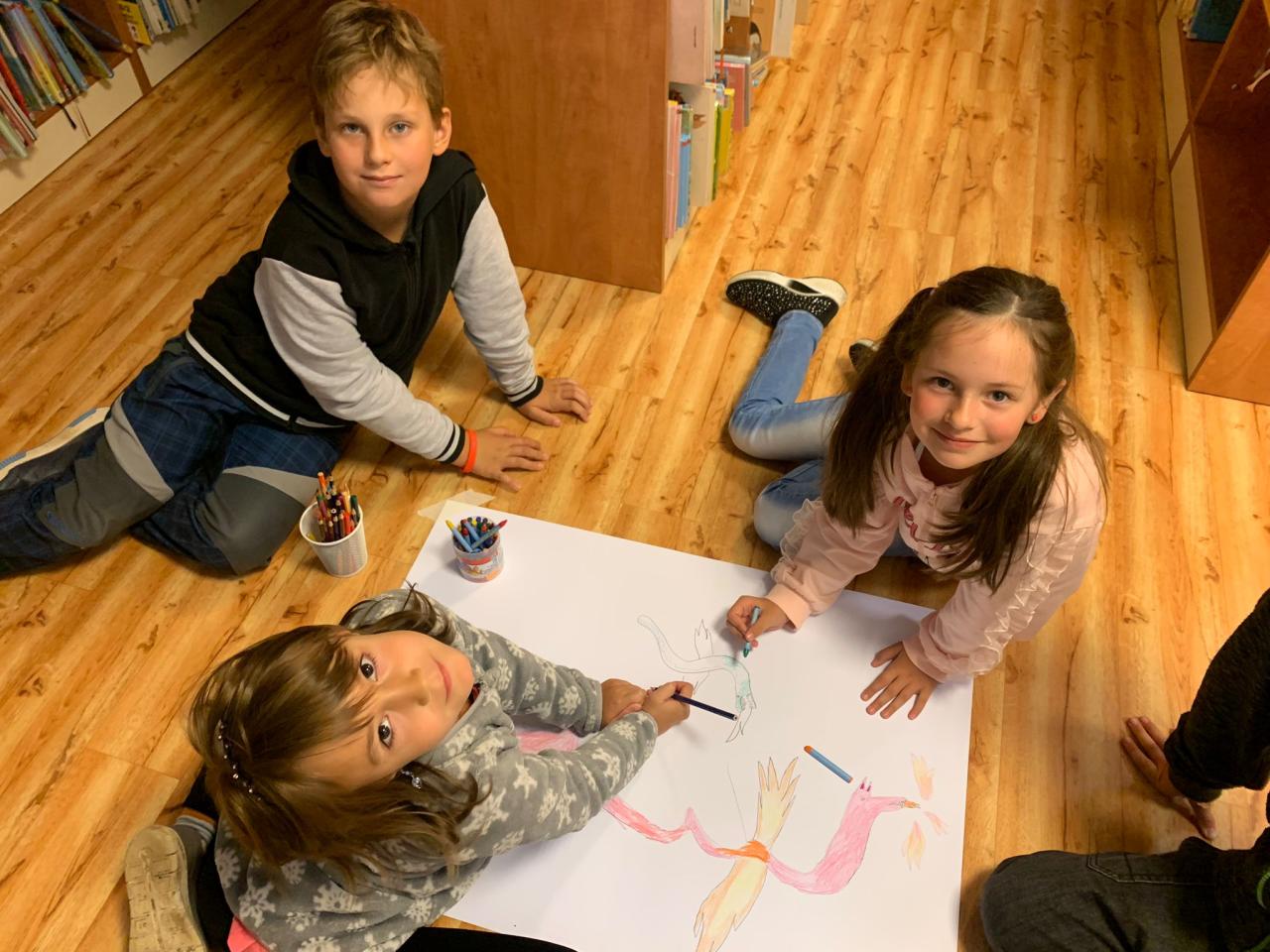 Svačina mezi regály s knihami nám chutnala a poté jsme se na vlastní přání pustili do kreslení – hádejte čeho? Draků. A to se nám povedlo. Na velké formáty a ve skupinkách jsme vytvořili pěkné příšerky, o jejichž podobách jsme si pak povídali.