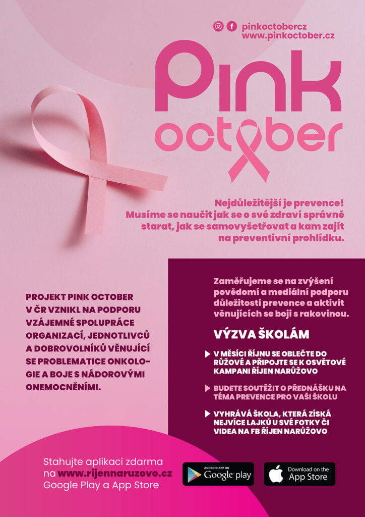 Naše škola opět přijímá výzvu a zúčastní se akce Pink October, tedy Říjen narůžovo, která má všem připomenout, jak moc jsou důležité preventivní prohlídky v souvislosti s nádorovým onemocněním.