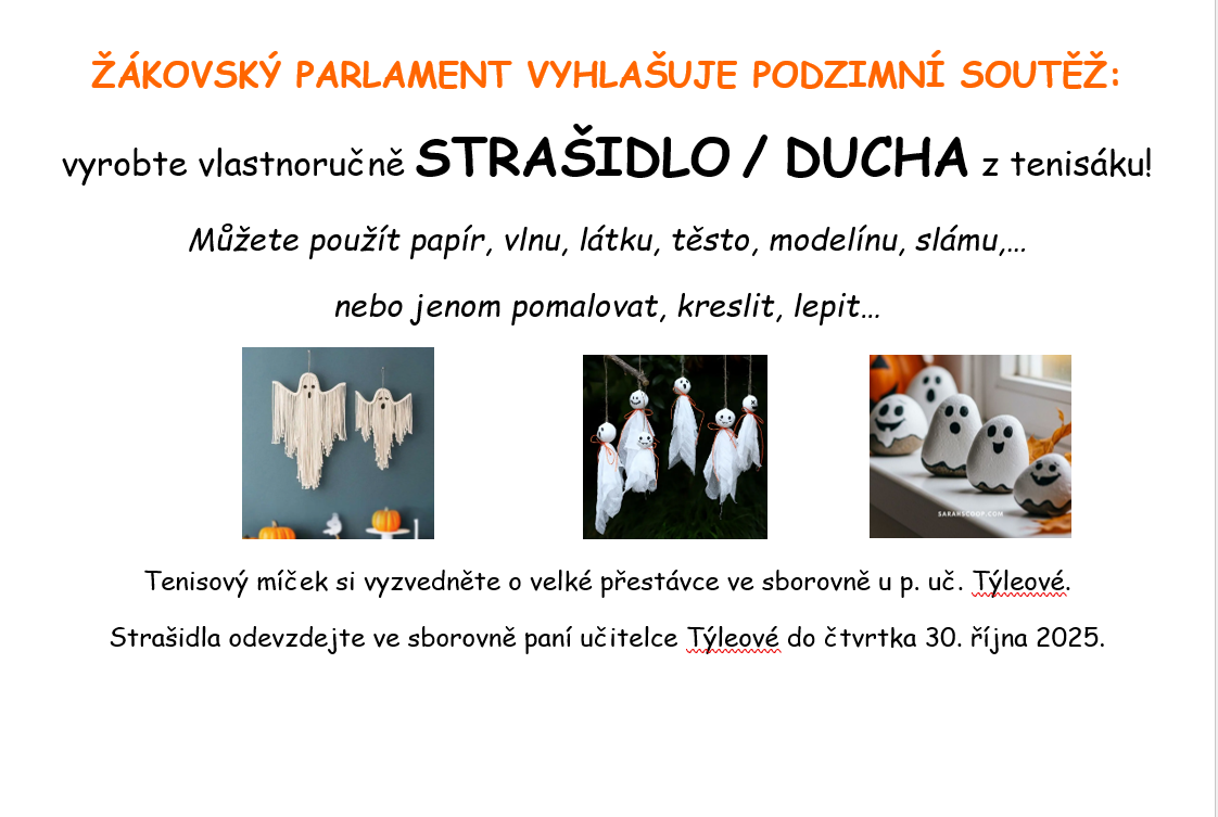 Zveme všechny žáky k účasti na školní soutěži o nejhezčí strašidýlko.