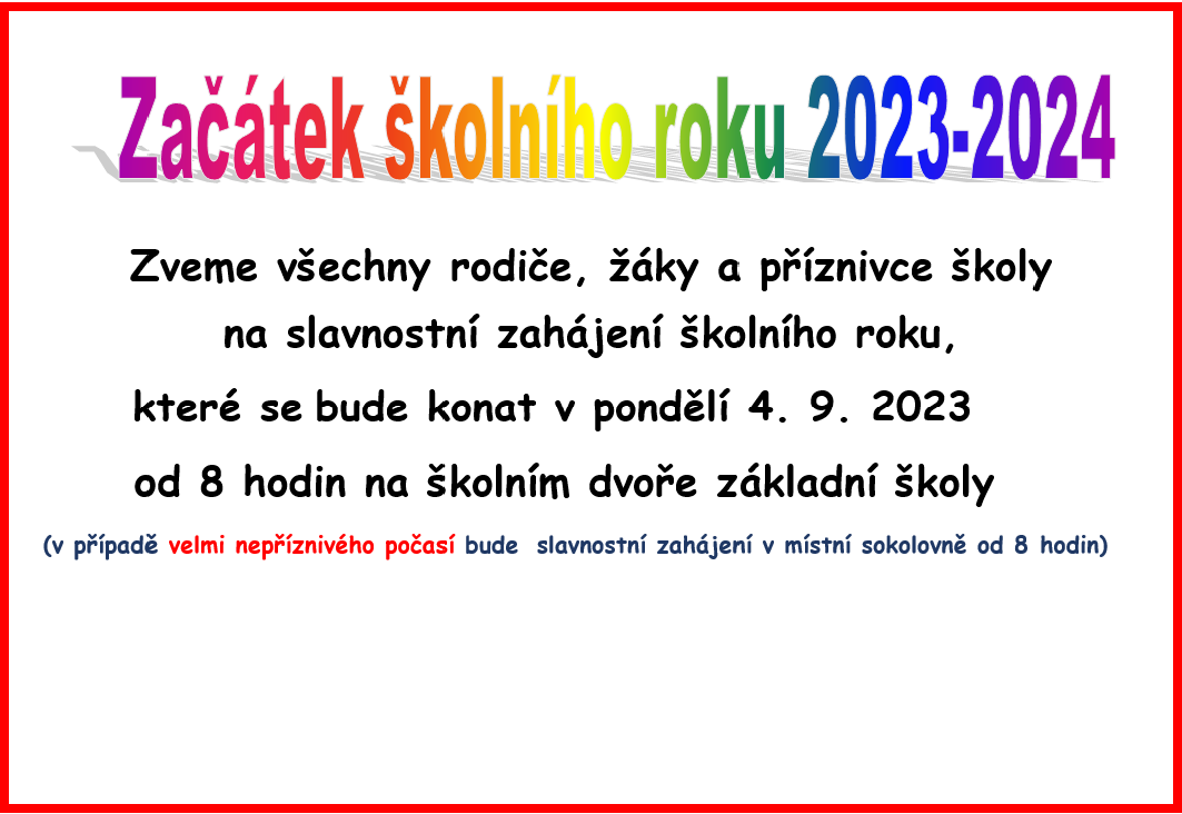 Srdečně zveme všechny rodiče, prarodiče, příznivce a samozřejmě i žáky na slavnostní zahájení školního roku 2023/24.