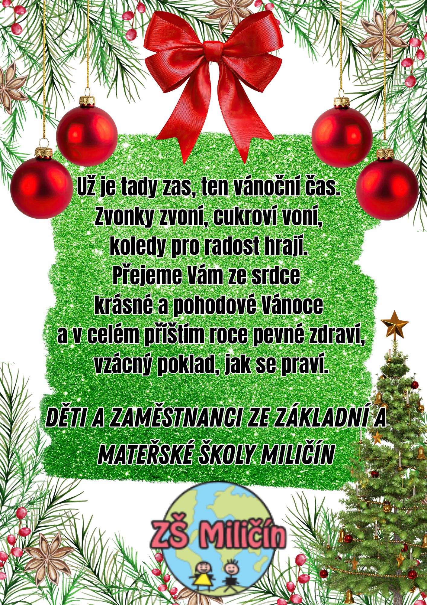 dovolte nám, abychom Vám jménem všech zaměstnanců Základní školy a Mateřské školy Miličín popřáli klidné a radostné vánoční svátky plné pohody, zdraví a krásných společných chvil s Vašimi blízkými.