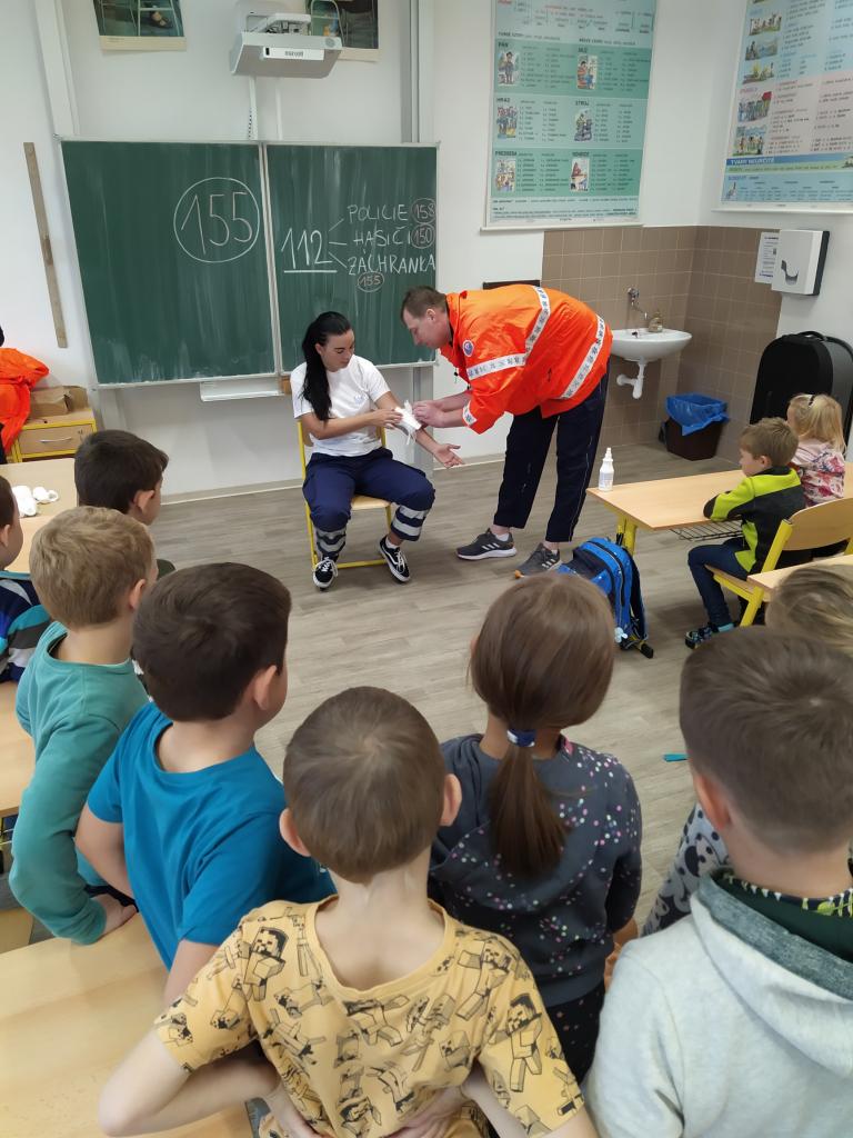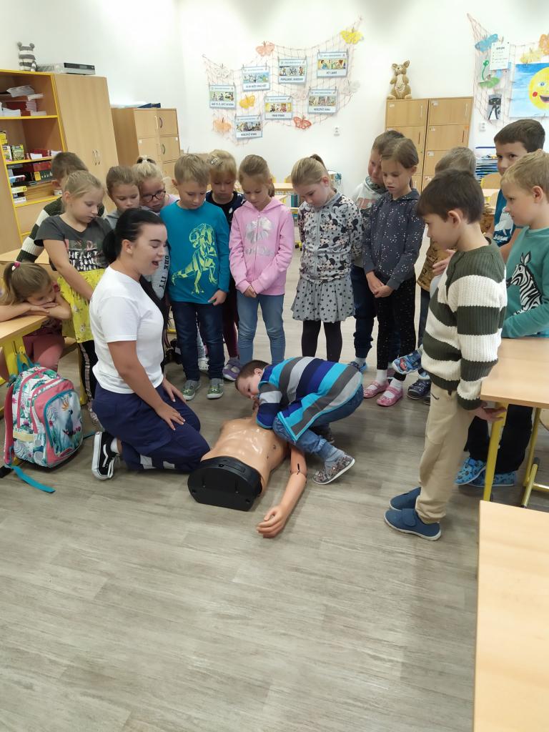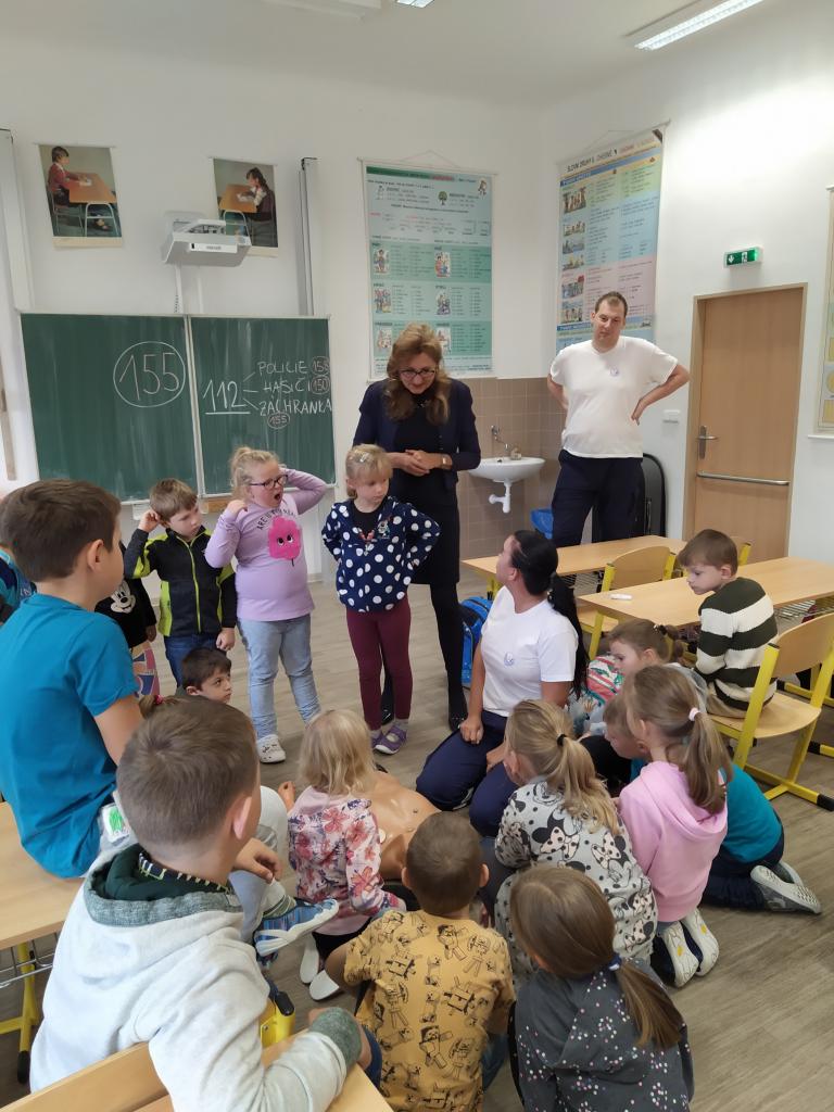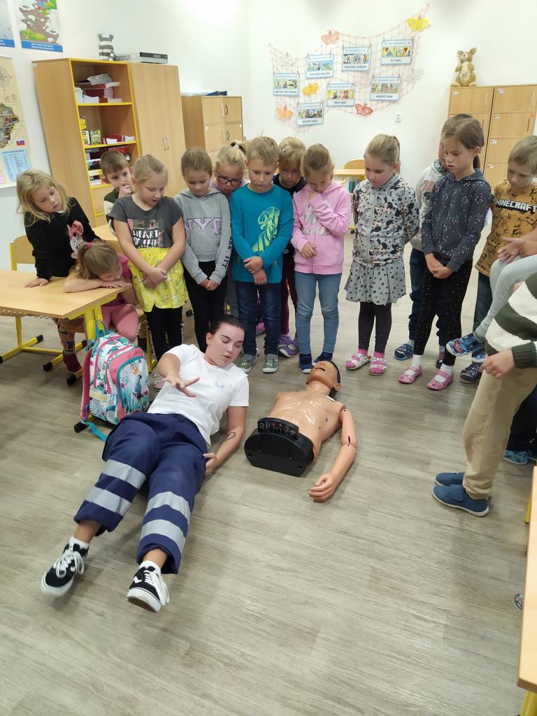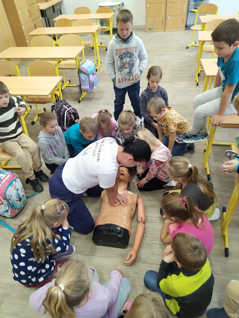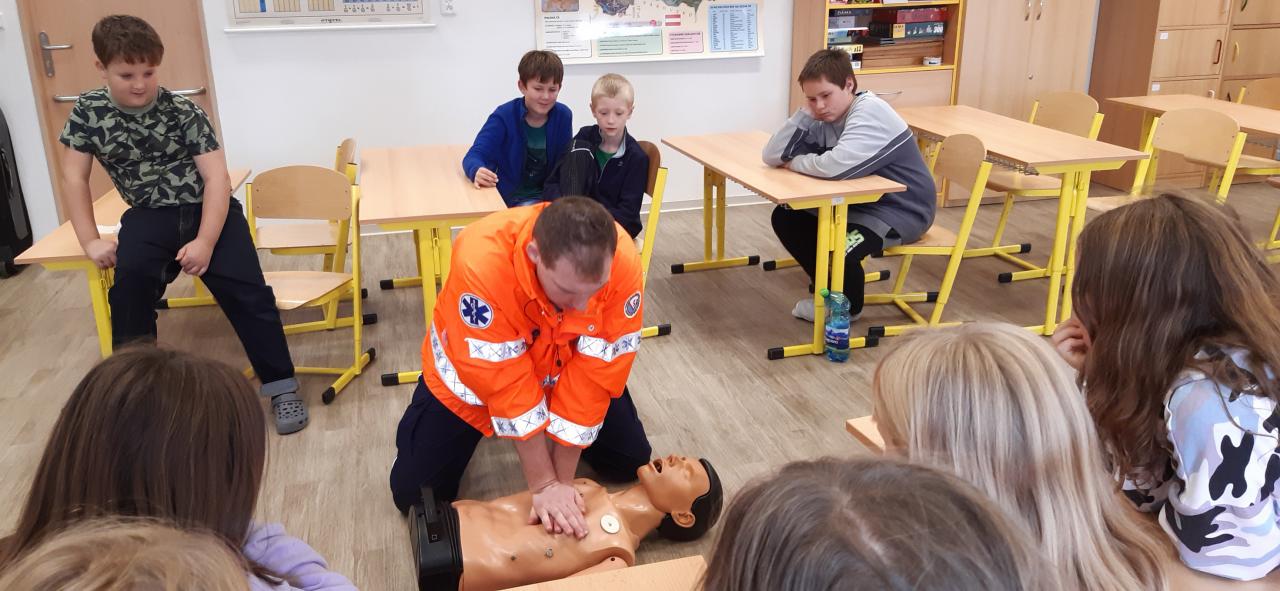 V pátek 30. září 2022 navštívila základní školu paní docentka Lidmila Hamplová z Vysoké školy zdravotnické v Praze. Přijeli s ní i dva záchranáři – studentka a student, aby seznámili žáky s pravidly poskytování 1. pomoci. Postupně se věnovali všem třídám od první až po devátou, informovali o integrovaném záchranném systému, telefonních číslech, různých úrazech a poskytování první pomoci. Předvedli také postup při nepřímé masáži srdce (správně je pojem nepřímá zevní masáž) a zodpověděli dotazy žáků. Někteří si masáž také vyzkoušeli. Akce se dětem líbila a určitě bude vhodné si nabyté vědomosti pravidelně opakovat. Poslední na řadu přišla devátá třída při odpoledním vyučování.