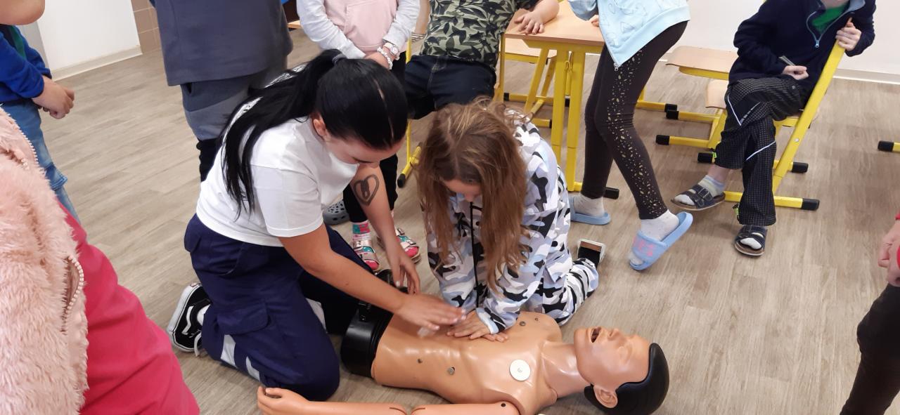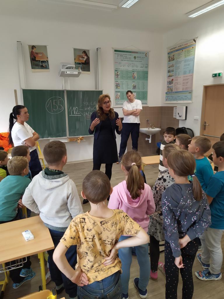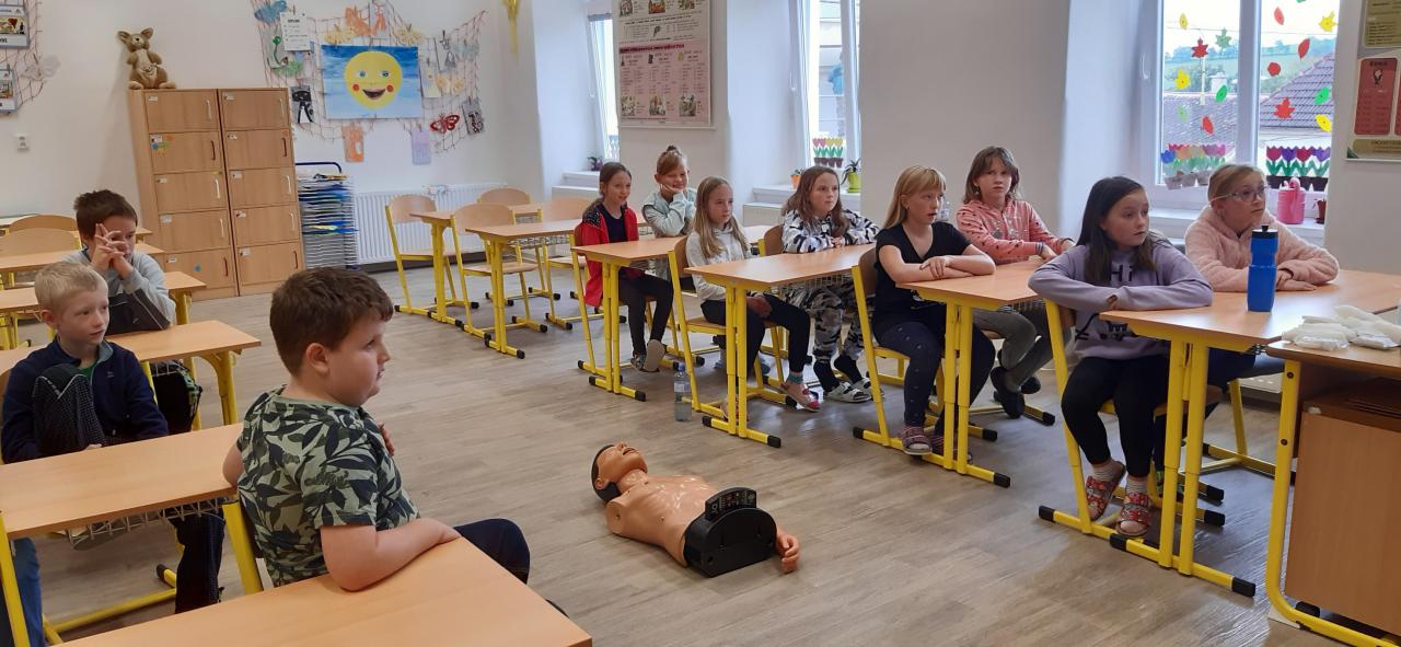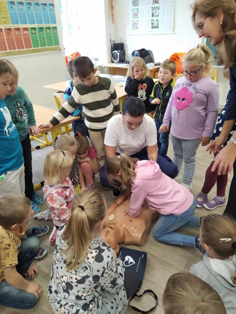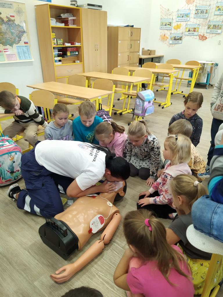 V pátek 30. září 2022 navštívila základní školu paní docentka Lidmila Hamplová z Vysoké školy zdravotnické v Praze. Přijeli s ní i dva záchranáři – studentka a student, aby seznámili žáky s pravidly poskytování 1. pomoci. Postupně se věnovali všem třídám od první až po devátou, informovali o integrovaném záchranném systému, telefonních číslech, různých úrazech a poskytování první pomoci. Předvedli také postup při nepřímé masáži srdce (správně je pojem nepřímá zevní masáž) a zodpověděli dotazy žáků. Někteří si masáž také vyzkoušeli. Akce se dětem líbila a určitě bude vhodné si nabyté vědomosti pravidelně opakovat. Poslední na řadu přišla devátá třída při odpoledním vyučování.