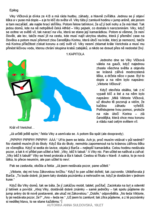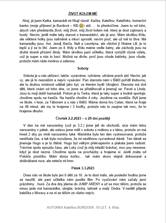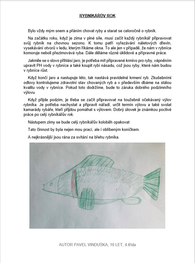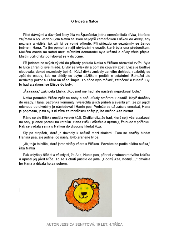 Studenti čtvrté třídy se společně s paní učitelkou Mgr. Janou Plačkovou a paní asistentkou Janou Novotnou zapojili do literární soutěže: Rosteme s knihou. Ta má za cíl rozvíjet čtenářskou gramotnost dětí, a to nejenom četbou, ale i aktivní tvorbou dle své fantazie, které se meze nekladou. Žáci vypracovali své vlastní příběhy, a ty nejzdařilejší byly vybrány k postupu do okresního kola. Jejich talent můžete posoudit sami v přílohách tohoto článku nebo i ve fotogalerii.