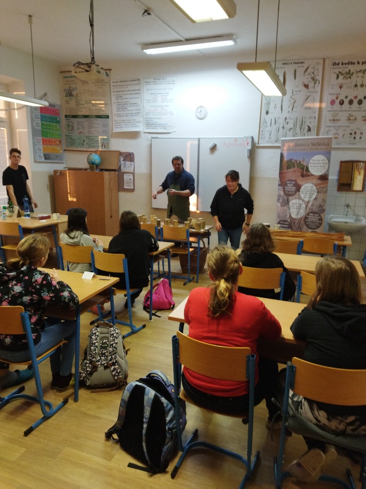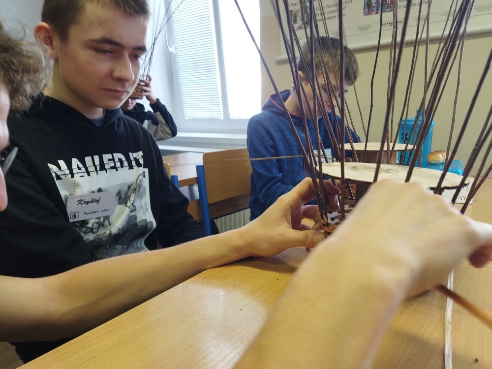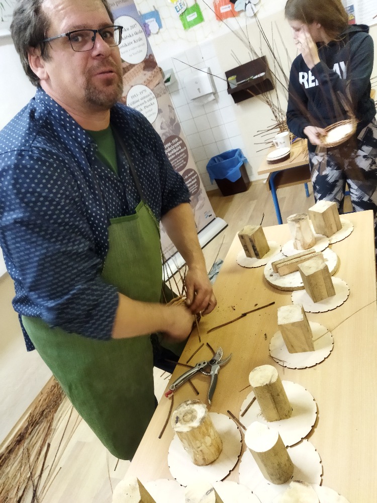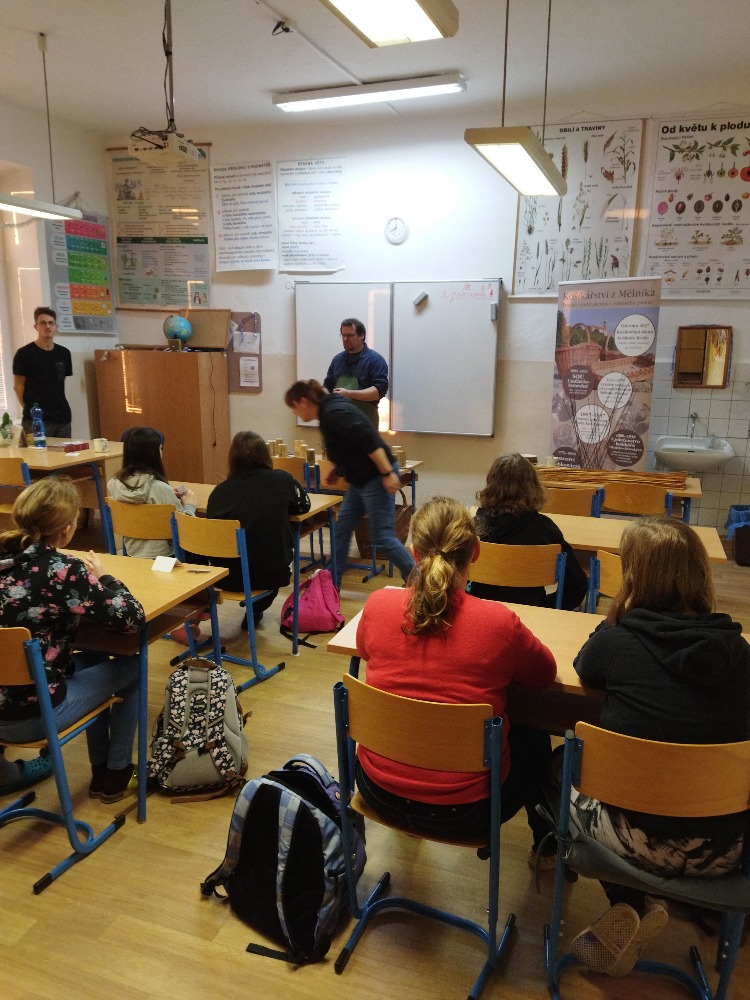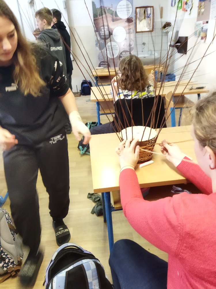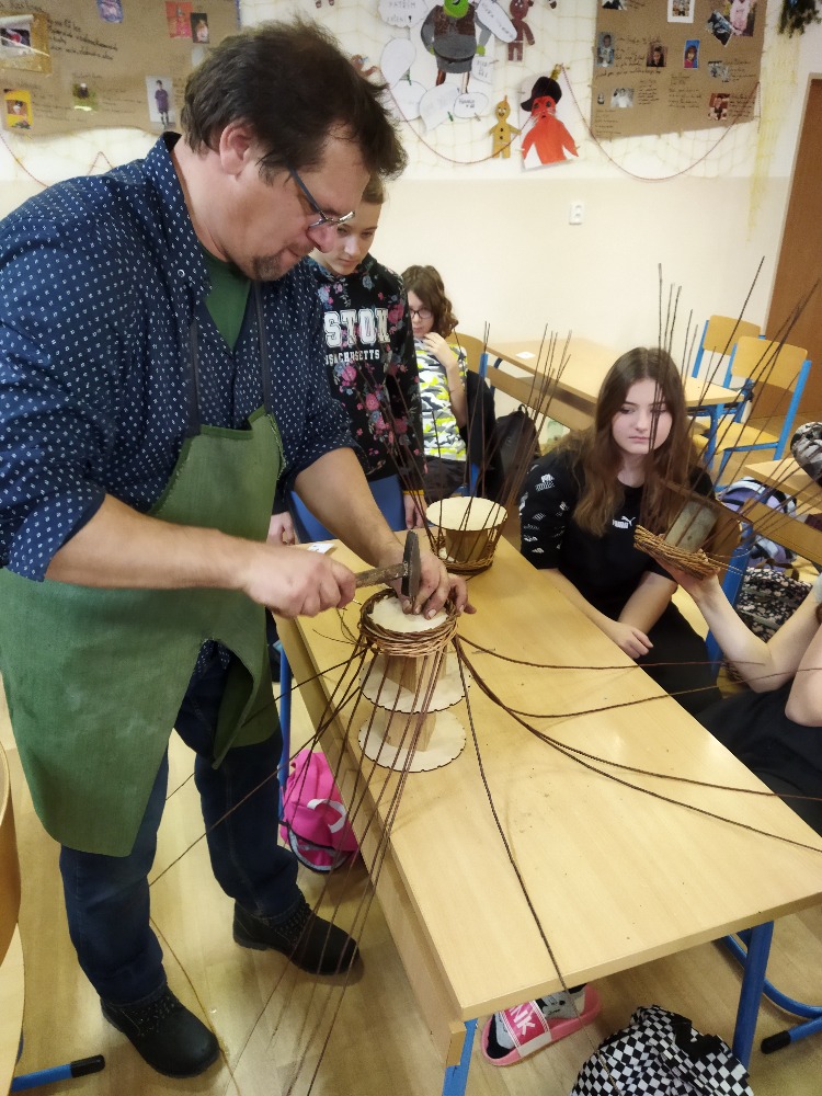 Pan Král je vyučený košíkář, jeden z posledních opravdu na škole vyučených, protože tento obor by dnes studenti hledali v nabídce středních škol marně. Po krátkém historickém exkurzu do košíkářství se šlo rovnou na věc a ambice p. Krále nebyla malá. Nám pedagogům i žákům se zdála jeho představa hotového košíku za 4 vyučovací hodiny nereálná.