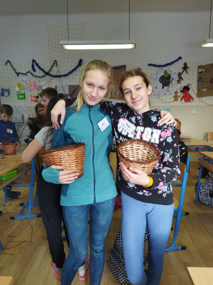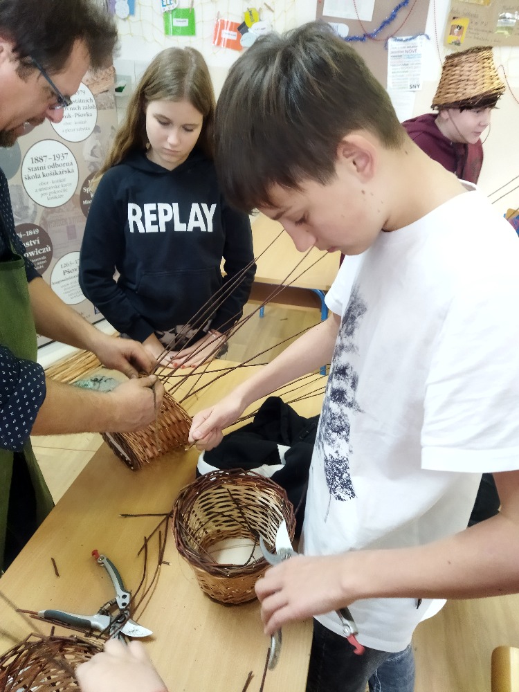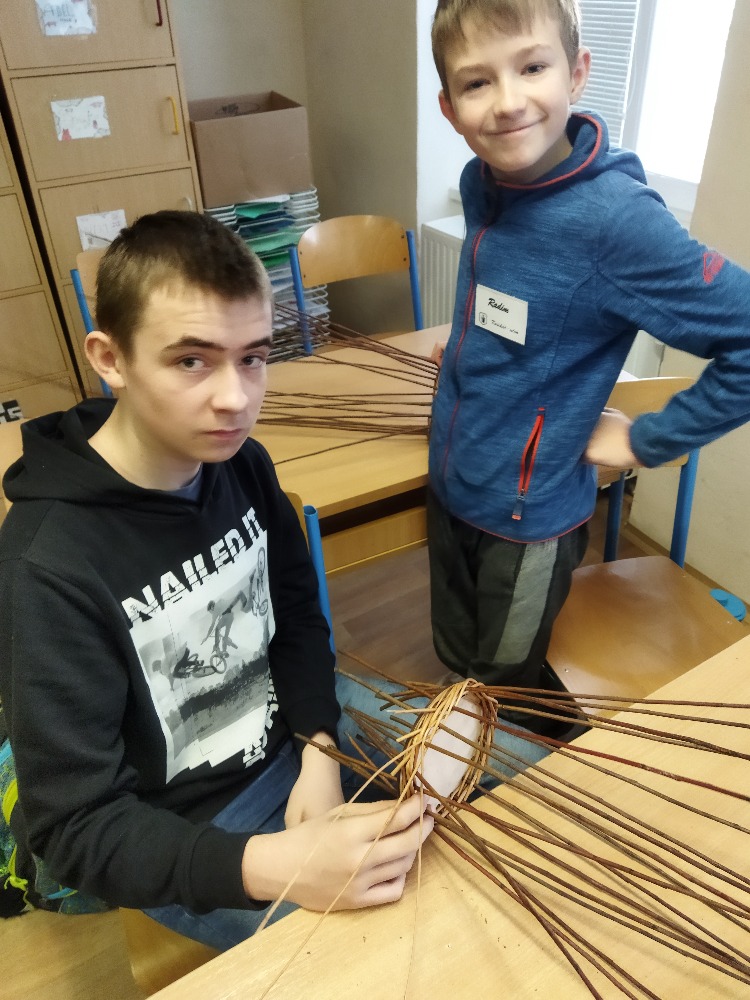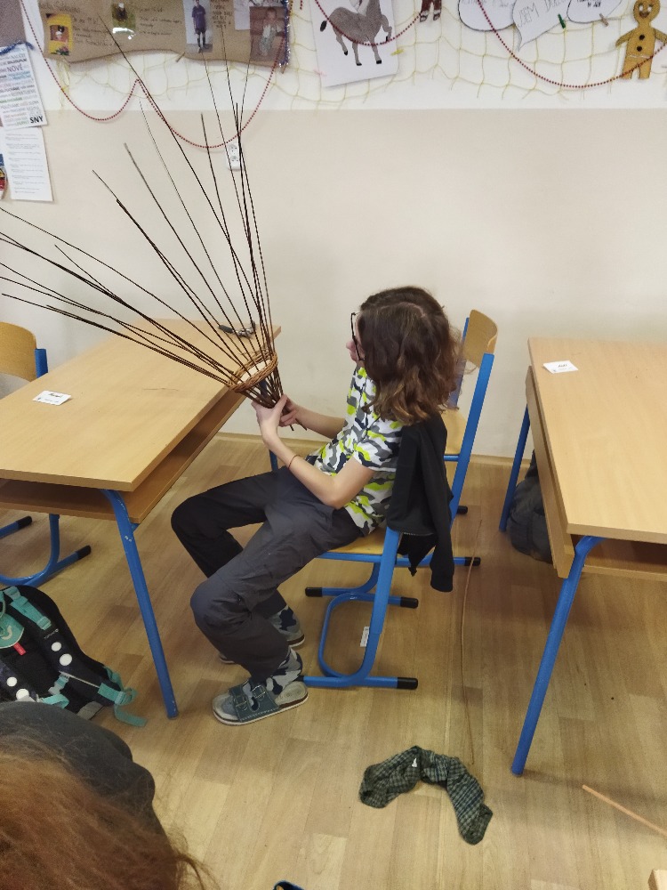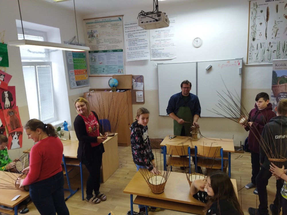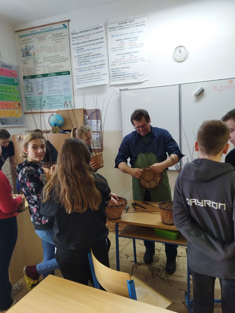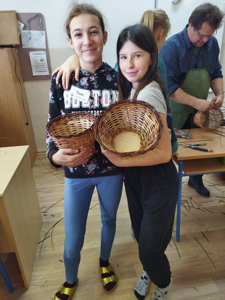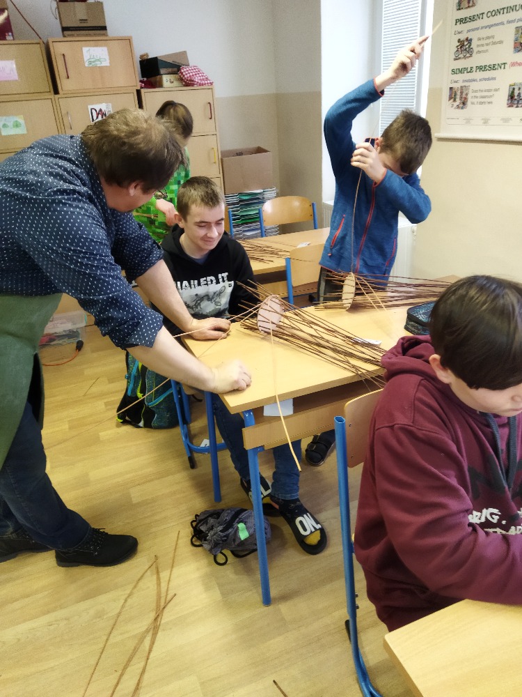 divadla…) i to, že zvládal plést a komunikovat se třídou, aniž by se musel koukat pod ruce. Čtyři hodiny utekly jako voda a hotové výrobky udělaly všem velkou radost. Žáci i učitelé obdrželi „výuční“ listy o absolvování kurzu, ale hlavně jsme si všichni odnesli kromě mnoha informací a zajímavostí o tomto řemeslu i vlastnoručně vyrobený košík.