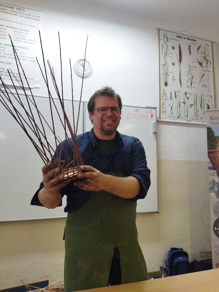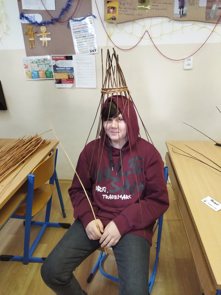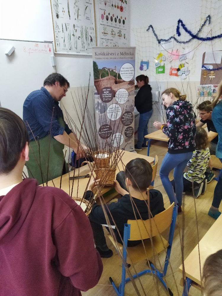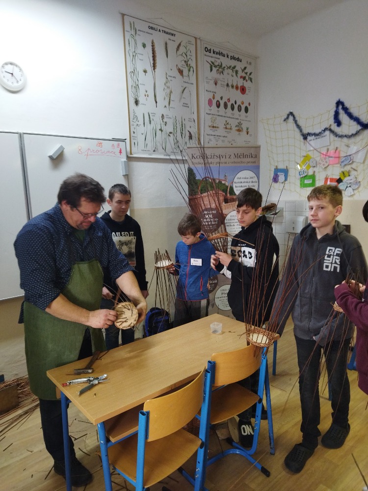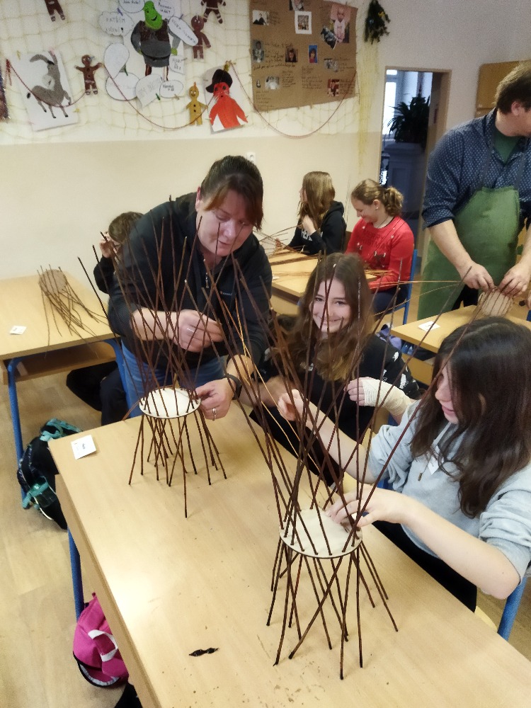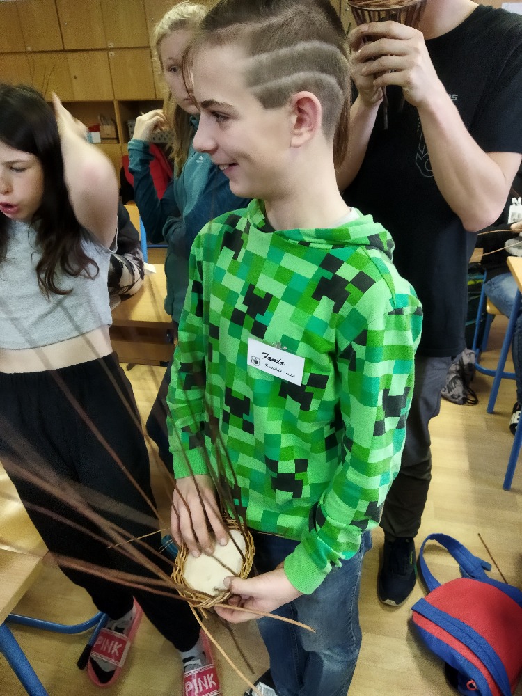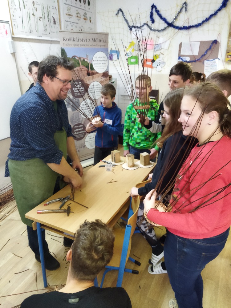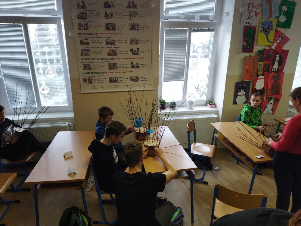 divadla…) i to, že zvládal plést a komunikovat se třídou, aniž by se musel koukat pod ruce. Čtyři hodiny utekly jako voda a hotové výrobky udělaly všem velkou radost. Žáci i učitelé obdrželi „výuční“ listy o absolvování kurzu, ale hlavně jsme si všichni odnesli kromě mnoha informací a zajímavostí o tomto řemeslu i vlastnoručně vyrobený košík.
