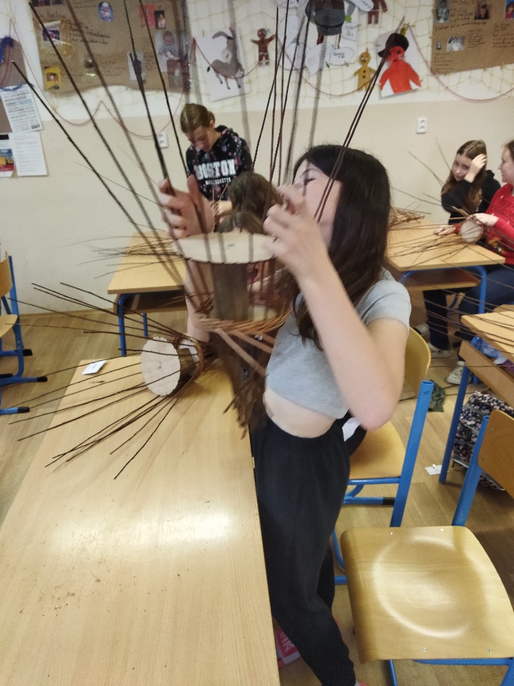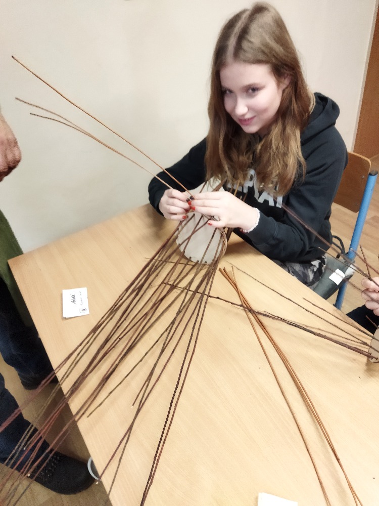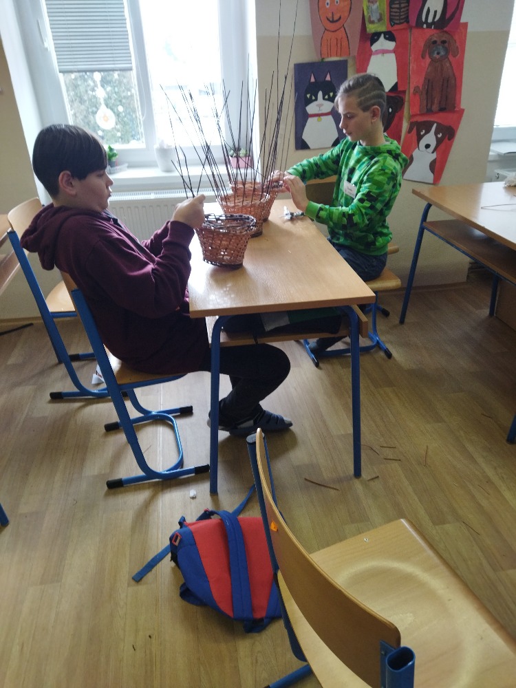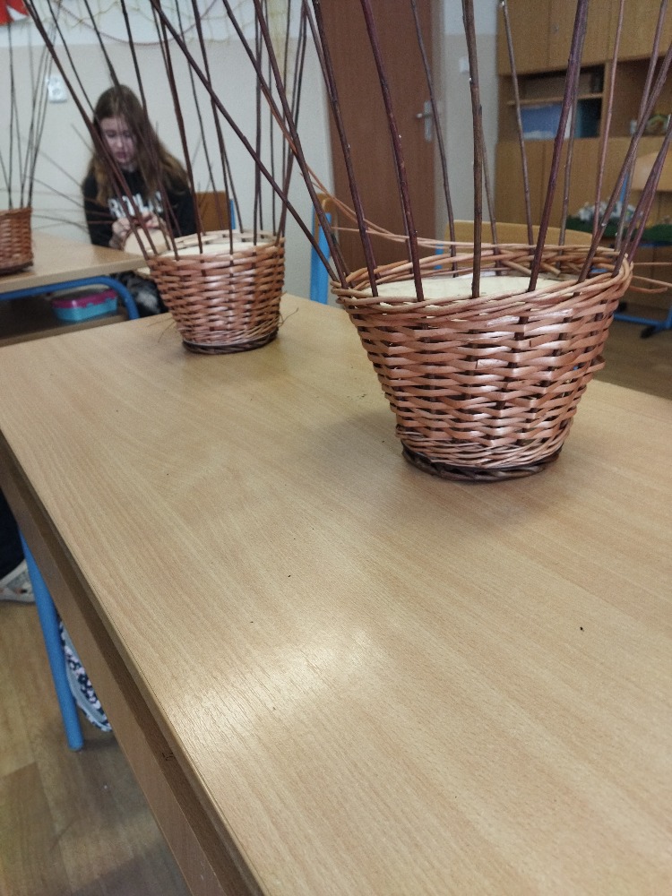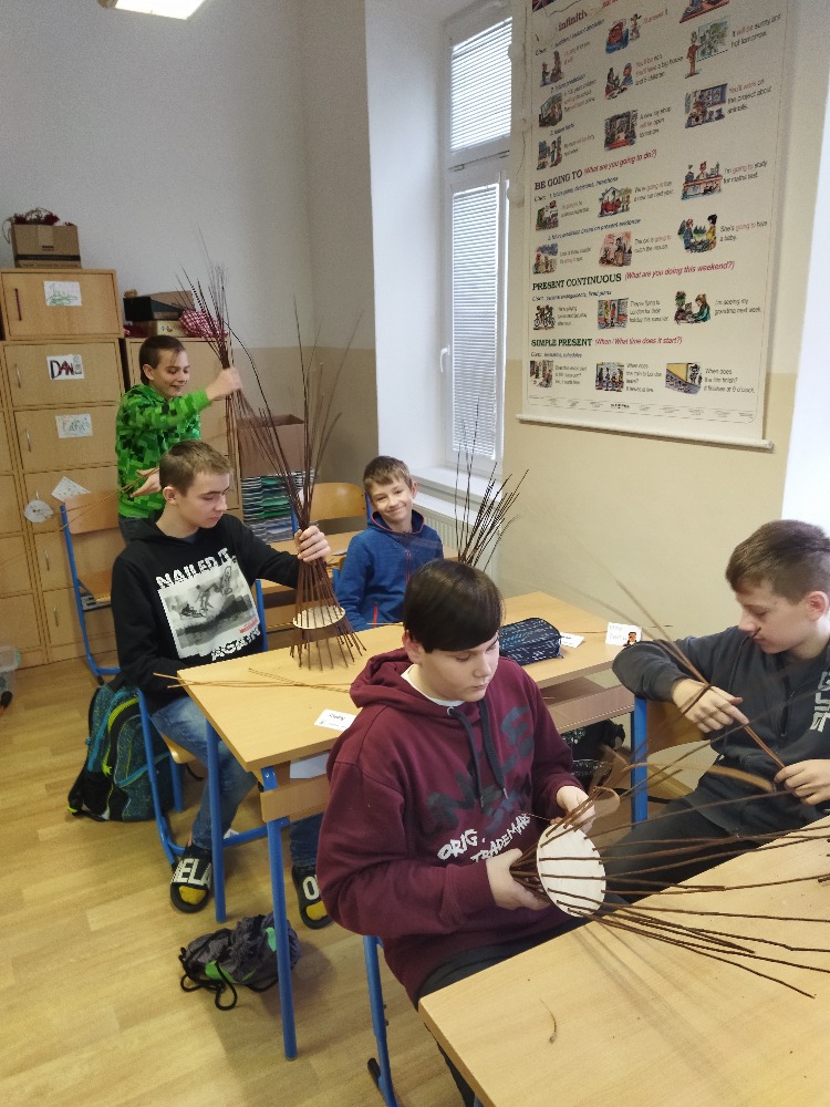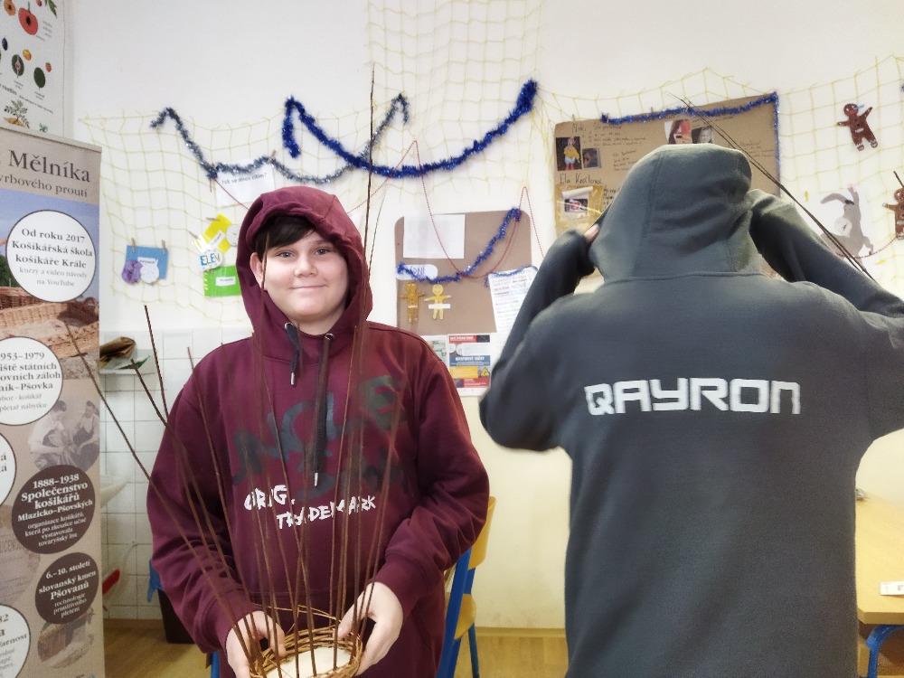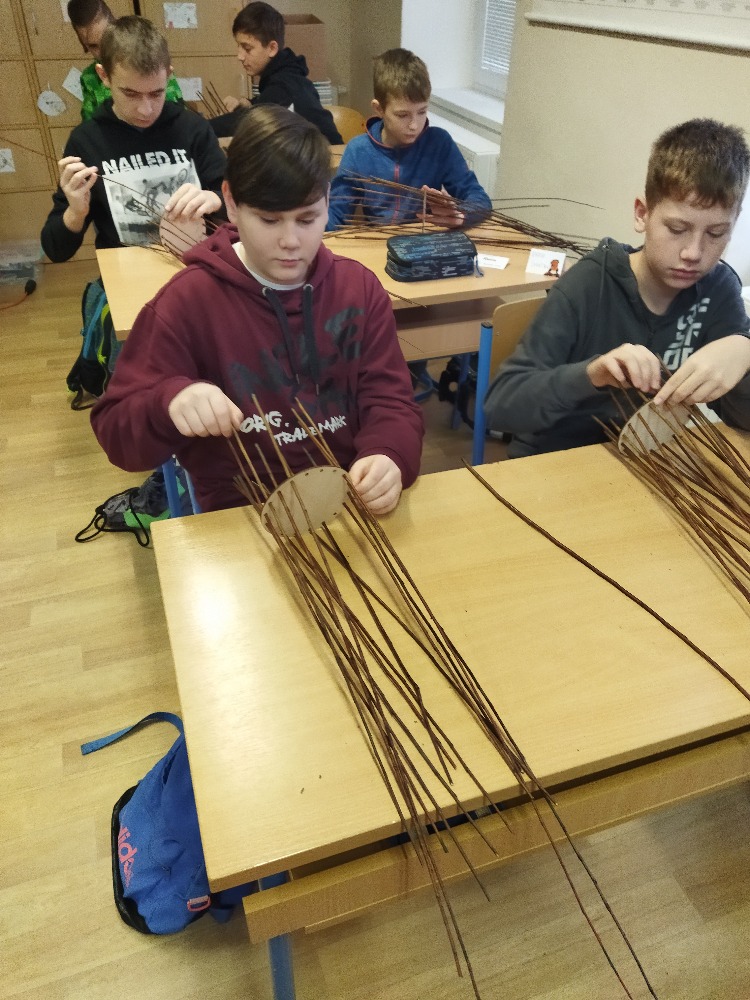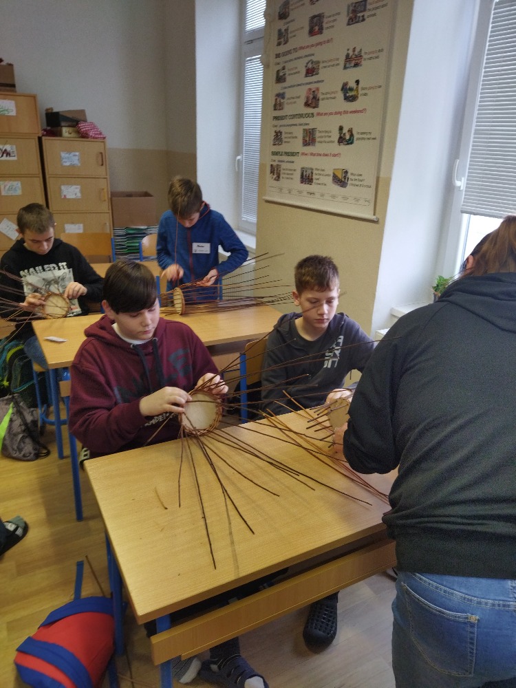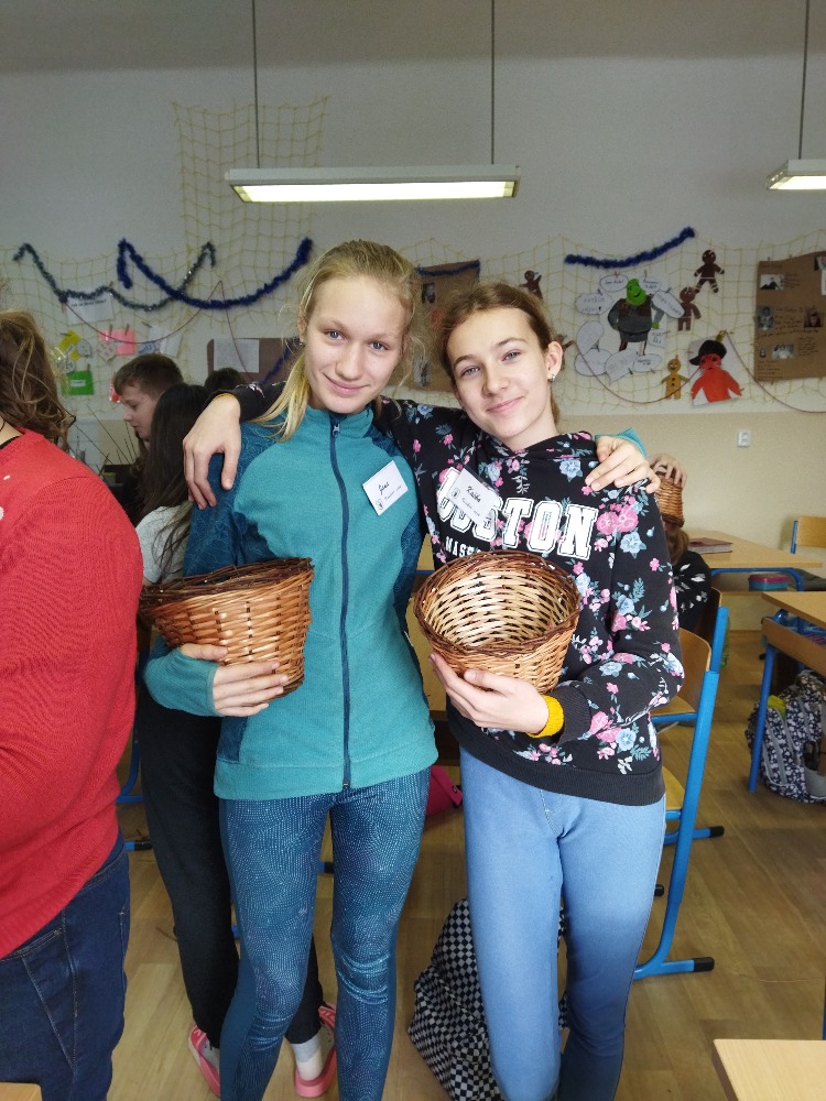 divadla…) i to, že zvládal plést a komunikovat se třídou, aniž by se musel koukat pod ruce. Čtyři hodiny utekly jako voda a hotové výrobky udělaly všem velkou radost. Žáci i učitelé obdrželi „výuční“ listy o absolvování kurzu, ale hlavně jsme si všichni odnesli kromě mnoha informací a zajímavostí o tomto řemeslu i vlastnoručně vyrobený košík.
