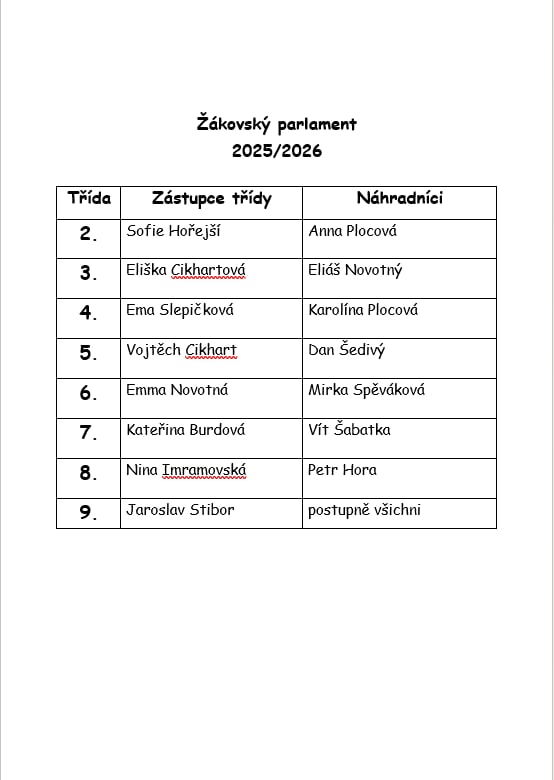 Jako již tradičně, i letos funguje školský parlament složený ze zvolených žáků 2. - 9. ročníku.