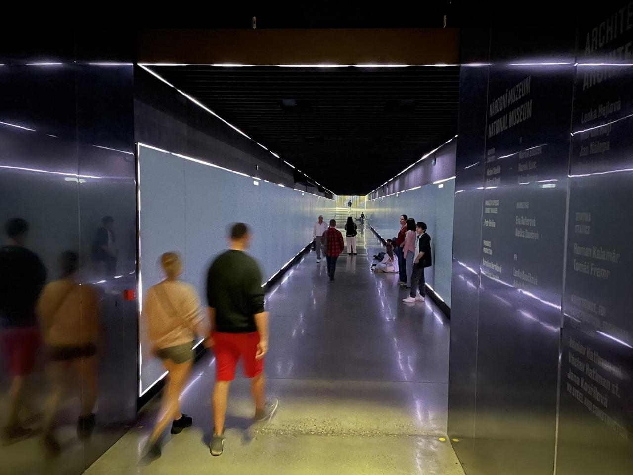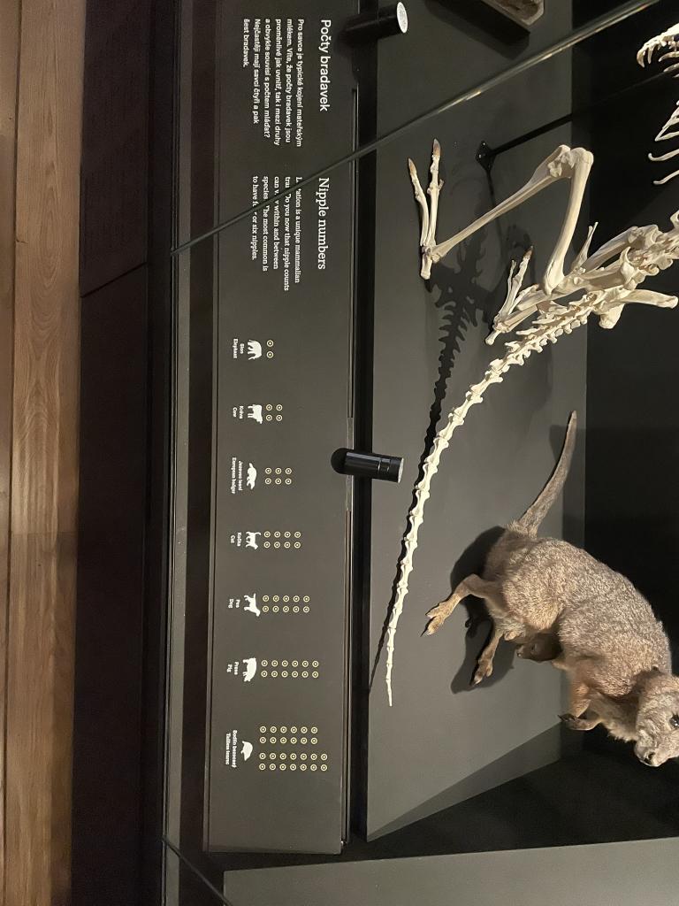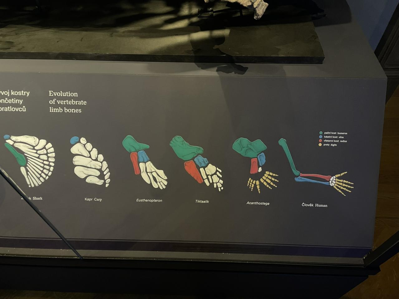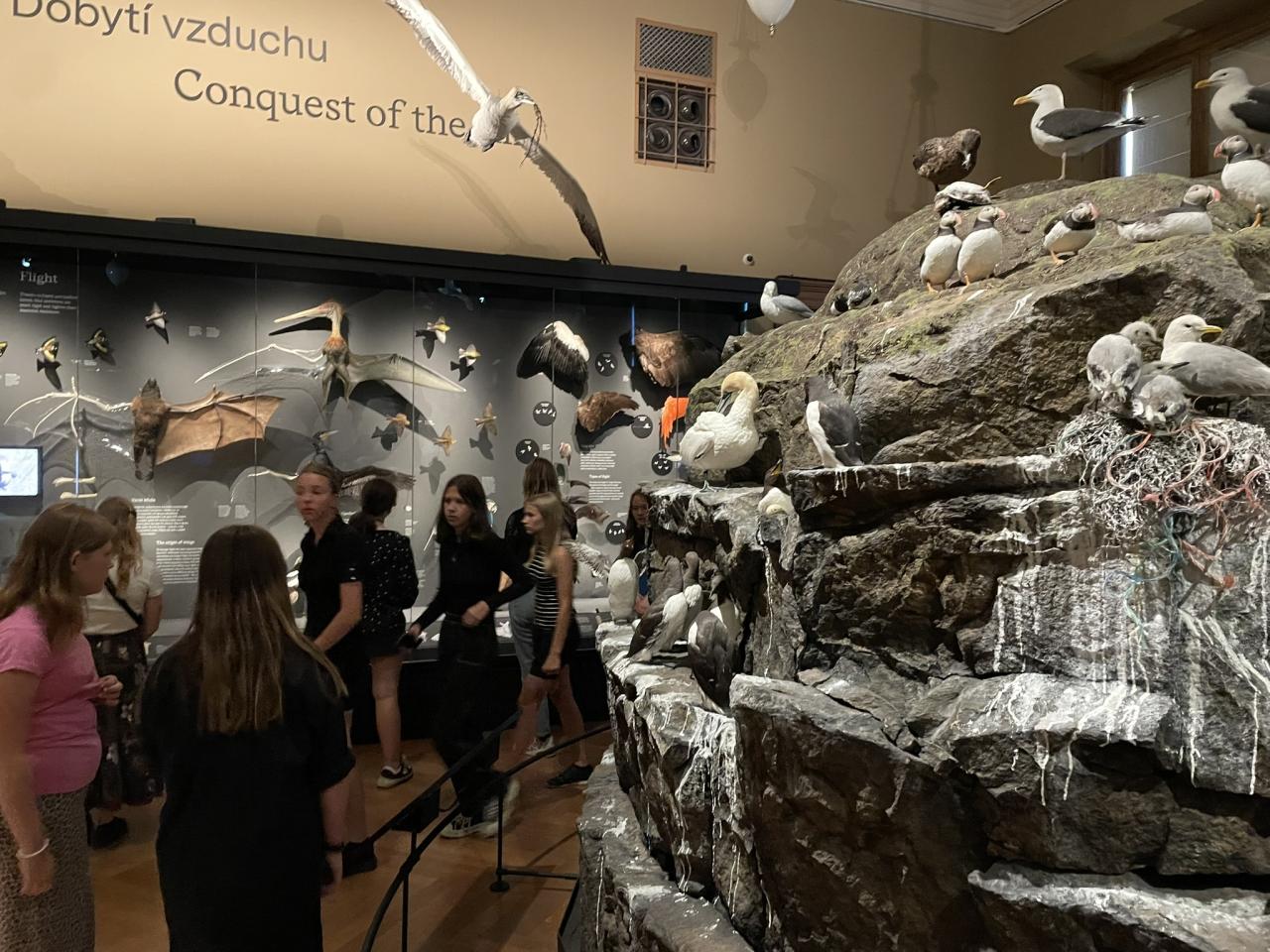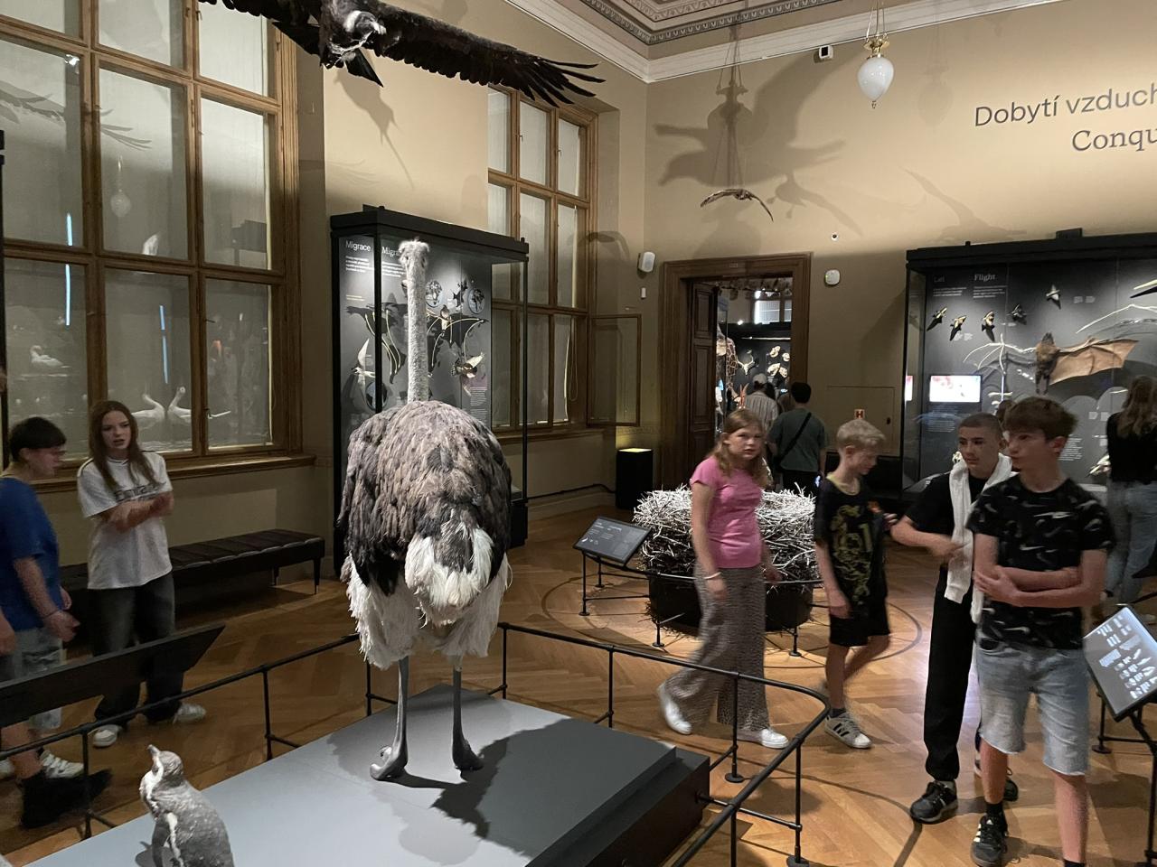 Po náročné cestě po ucpaných silnicích jsme se v úterý 9. 9. ocitli v muzeu, které už bylo plné převážně zahraničních návštěvníků. To byl jasný důkaz, jak mimořádná výstava je. Vstupenky jsme měli rezervované na konkrétní čas, přesto jsme si vystáli dlouhou frontu, která se naštěstí pohybovala celkem rychle. Vedla do sálu, kde jsme viděli fosilie – několik miliónů let staré kosterní pozůstatky našich předků. V tichosti a v přítmí jsme si prohlédli opravdové kosti, obratle, části lebky a čelisti se zuby. Větší kostra patřila ženě či dívce Lucy, menší byla pozůstatkem dvouleté holčičky Salem; ta byla objevena teprve před 25 lety. Ze země nálezu Etiopie putovaly vůbec poprvé do Evropy, a to rovnou k nám do Prahy. Muzeum bylo střežené po zuby ozbrojenými hlídkami, mezi lidmi se potom pohybovalo mnoho dalších hlídačů. Po zhlédnutí fosilií následovala prohlídka nové expozice Lidé a jejich předci. Potom už si žáci mohli vybrat podle svého zájmu, čemu budou věnovat pozornost.