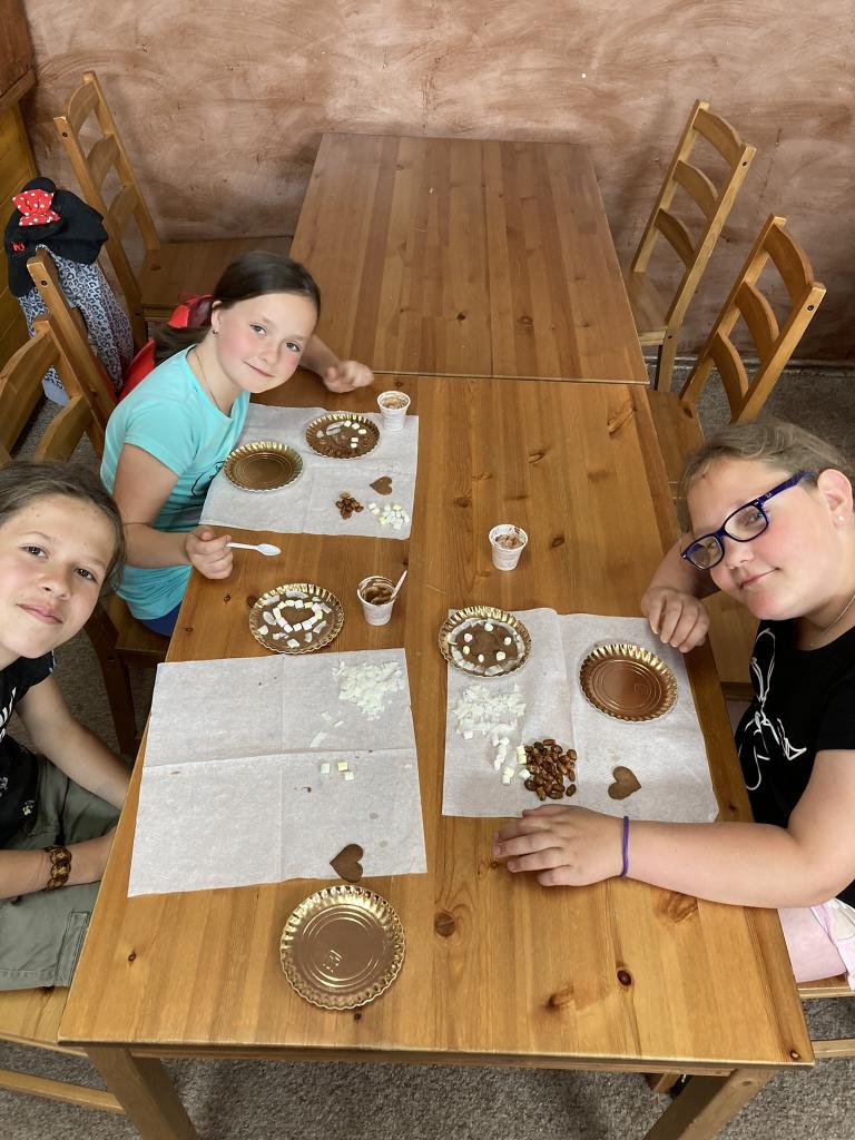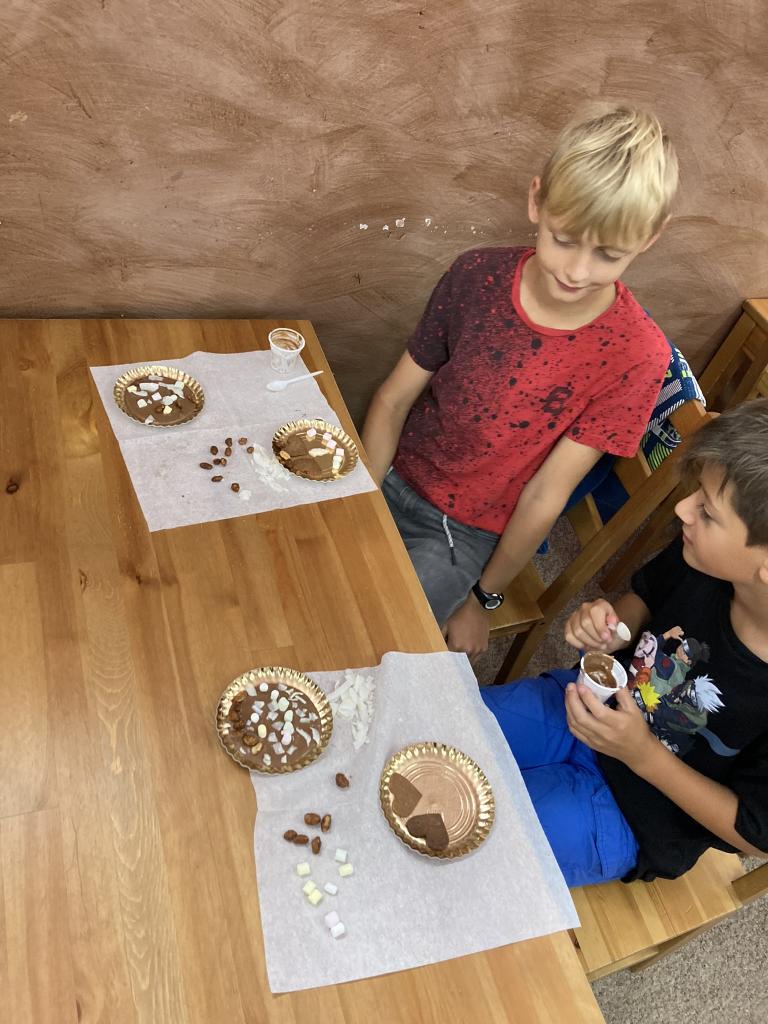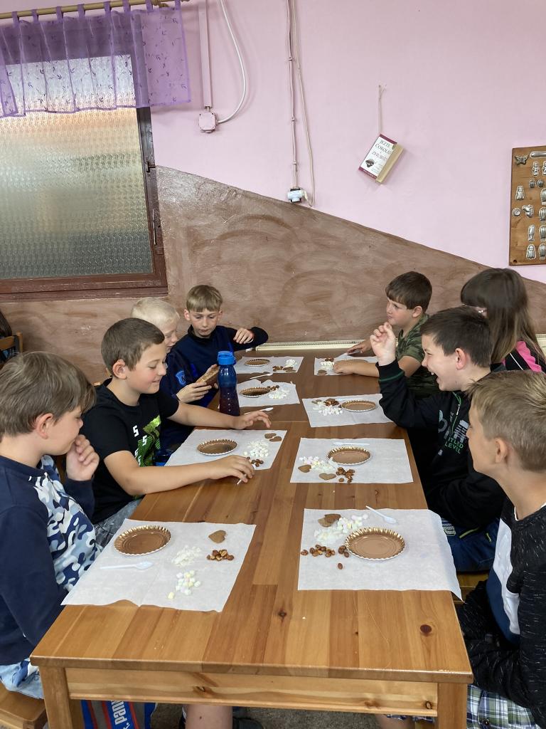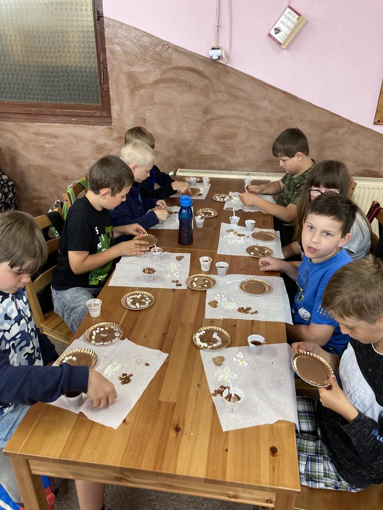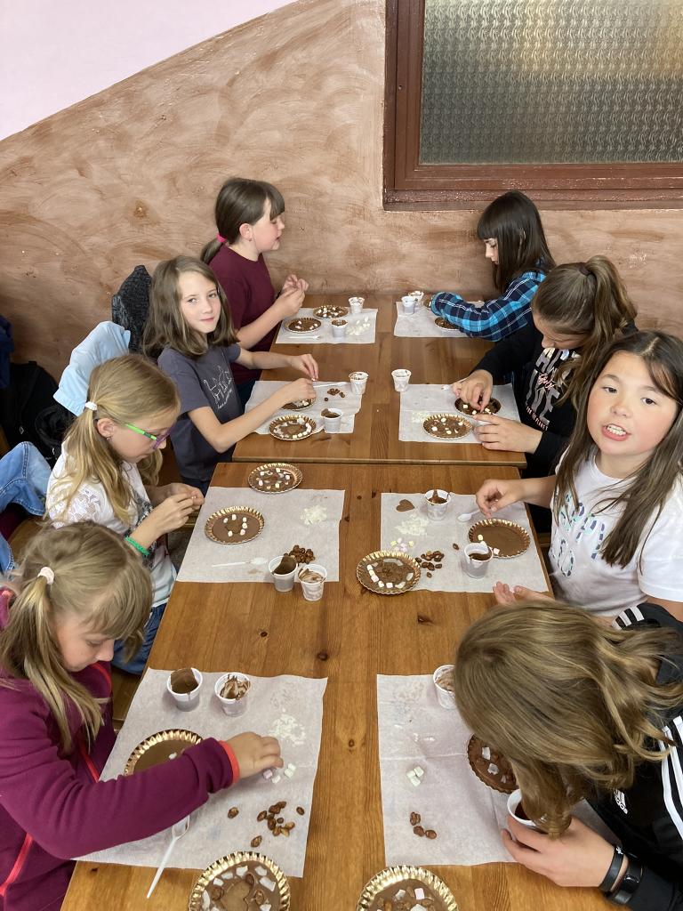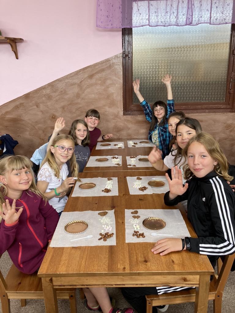 Velmi zajímavé bylo zhlédnutí videa o sklizni kakaových bobů až po výrobu čokolády. Děti si odlily 2 kusy čokolády, samy si je nazdobily oříšky, kokosem a možná také samy snědly, protože chutnaly znamenitě. Kdo dovezl kousek čokolády na ochutnání domů, je hrdina.
