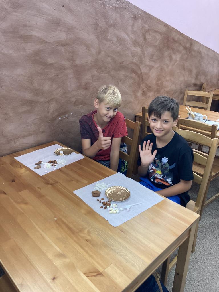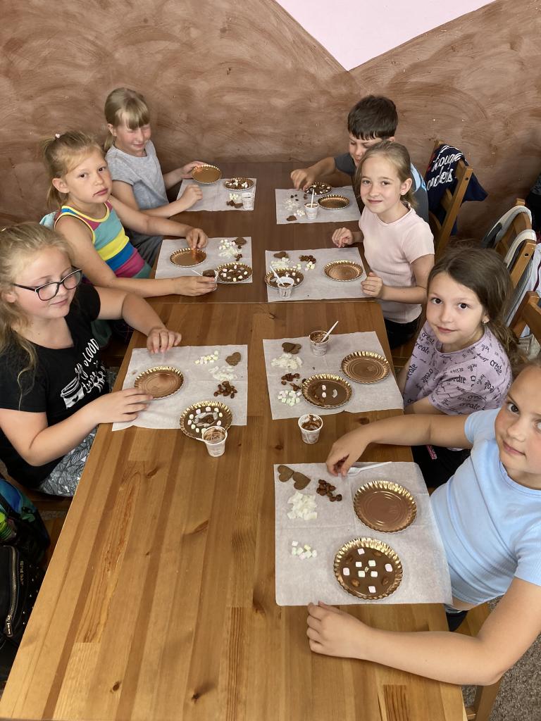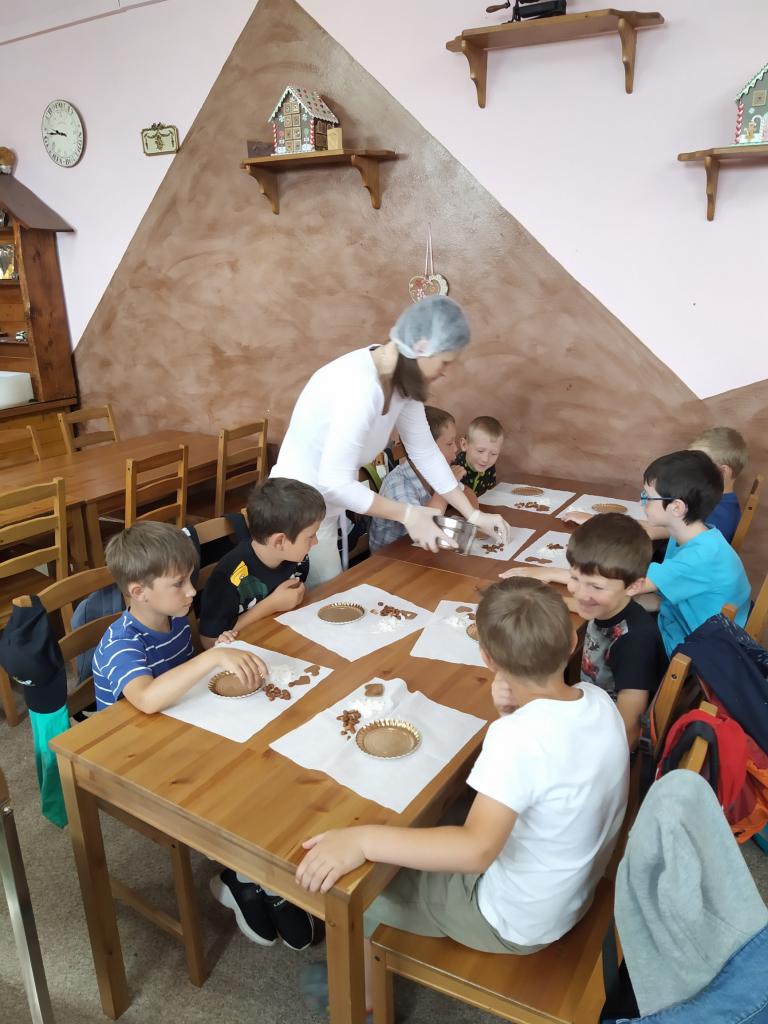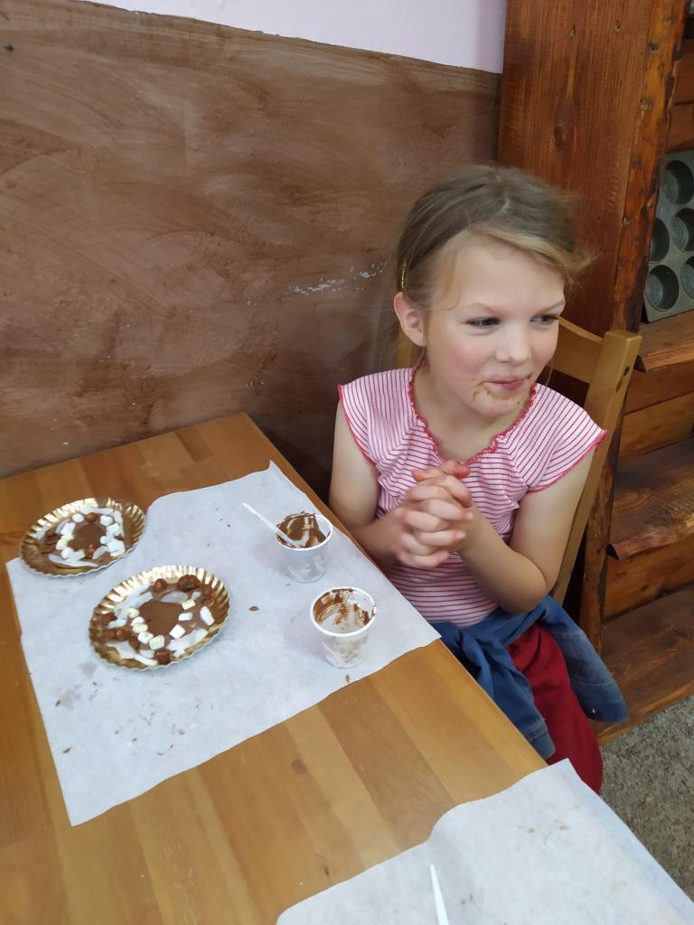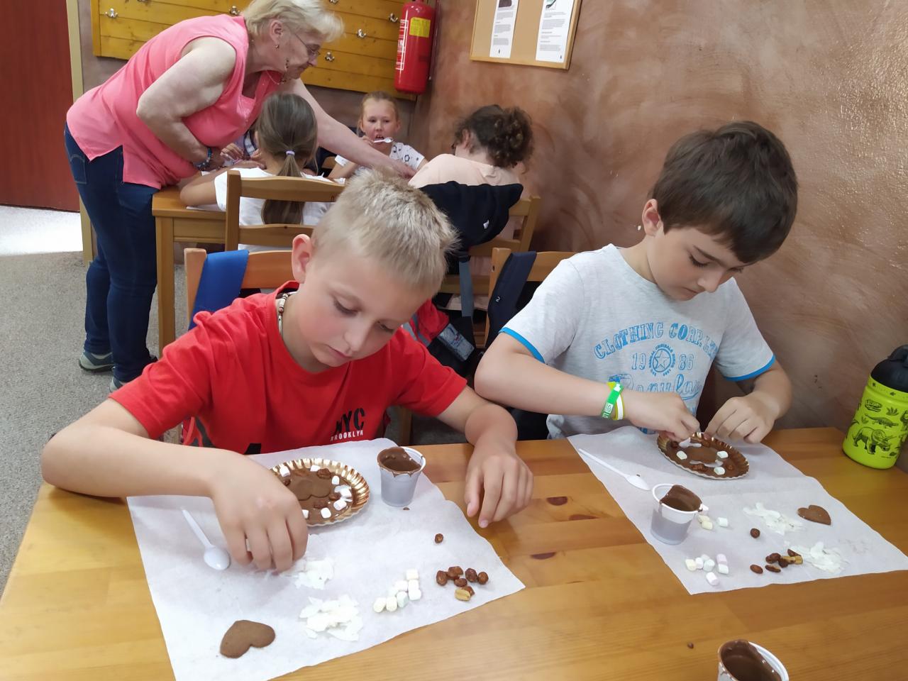 Velmi zajímavé bylo zhlédnutí videa o sklizni kakaových bobů až po výrobu čokolády. Děti si odlily 2 kusy čokolády, samy si je nazdobily oříšky, kokosem a možná také samy snědly, protože chutnaly znamenitě. Kdo dovezl kousek čokolády na ochutnání domů, je hrdina.
