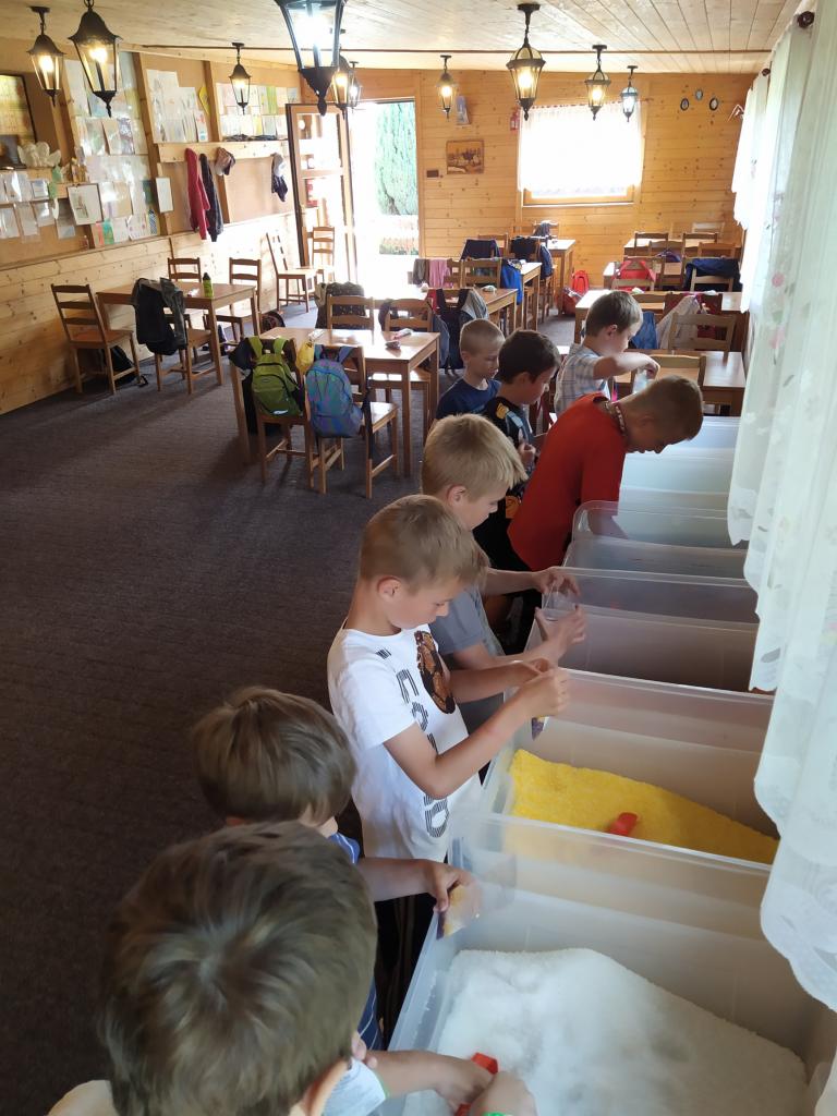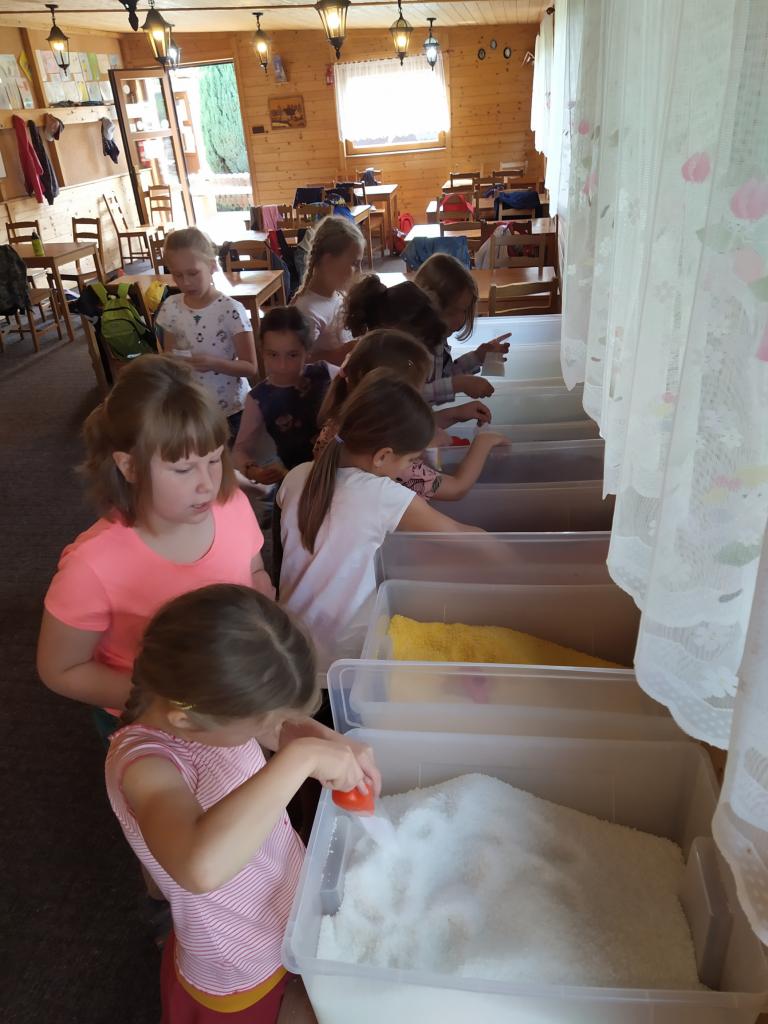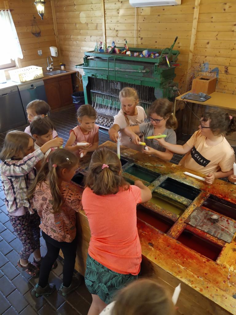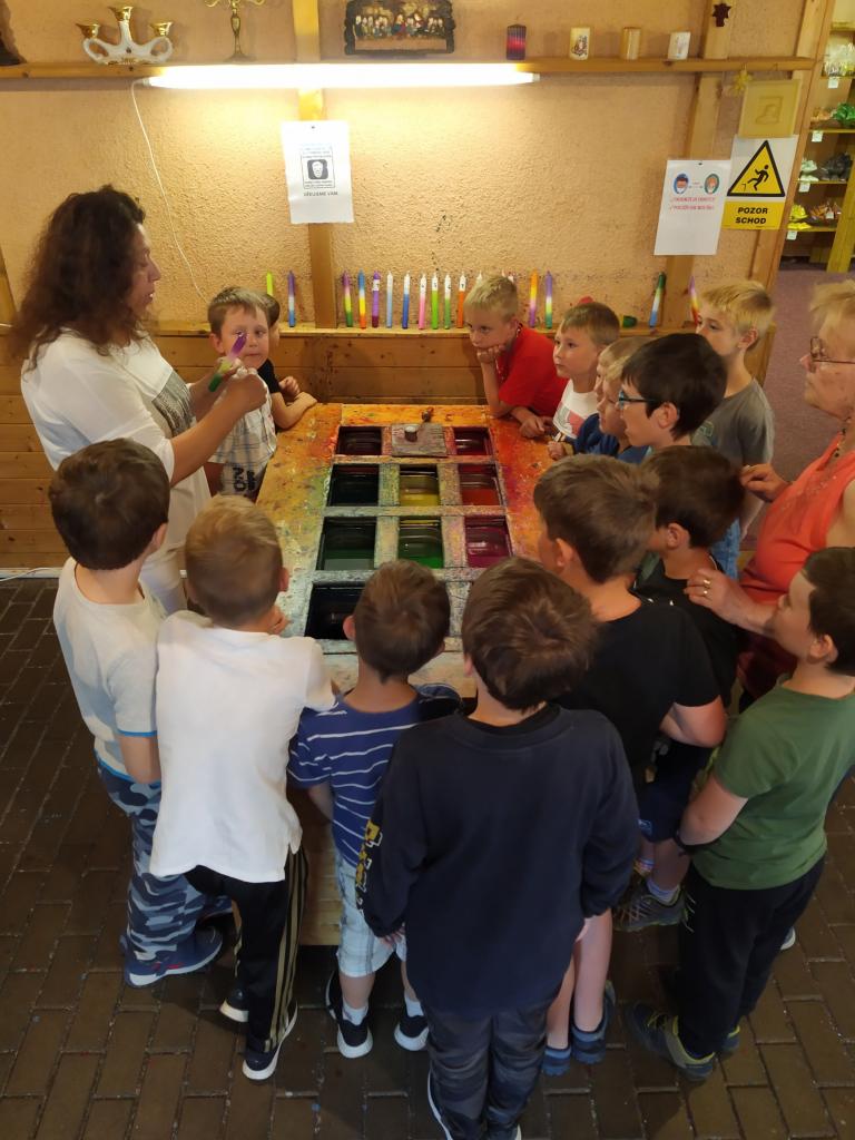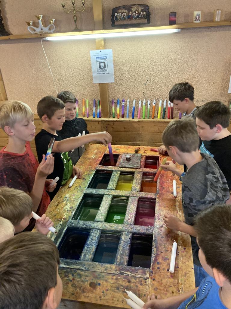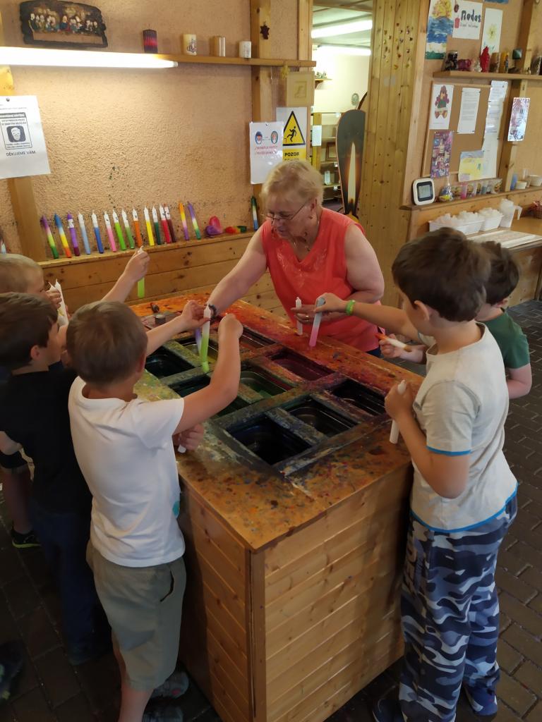 V areálu Rodas Šestajovice jsme se rozdělili na dvě skupiny a šlo se vyrábět. Ne, ne, málem bych zapomněla na důležitou věc – svačinu. Vždyť všechno jde lépe s plným bříškem! Po jídle se děti věnovaly vyrábění. Zhotovily si svíčky, které si zdobily v barevných voskových politurách. Žádná svíčka nebyla stejná. Pak si děti vykrajovaly glycerinová mýdla, plnily si sáčky koupelovou solí. Na výběr měly 7 druhů koupelových solí s přírodními silicemi z bylin.