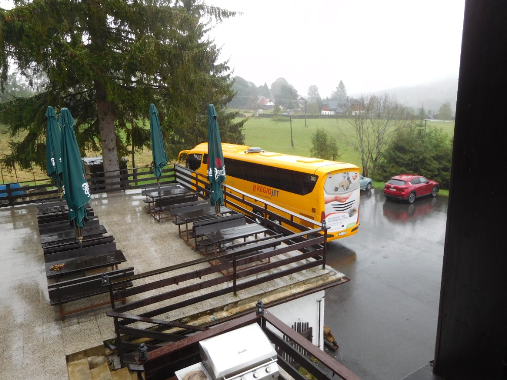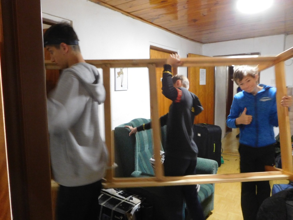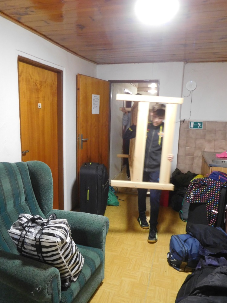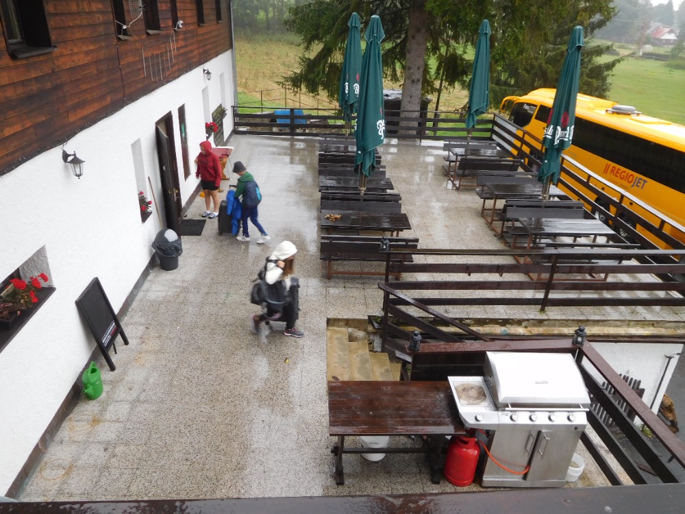Včerejší diskotéka skončila v devět večer, ve 21:30 byla večerka a ve 22:05 už byl úplný klid, přesto se ráno špatně vstávalo s deštěm a zimou za okny. Venku bylo necelých 5 stupňů. Při snídani došly čokokuličky, mléko, tavený sýr a šunka, ale paní učitelka Kocourková to tak nenechala a statečně zajistila u provozního doplnění, takže na všechny se dostalo. Potom jsme si dobalili a trochu po sobě uklidili, k dispozici jsme měli jedno koště pro celou chatu. Některé děti aktivně vynosily svoje zavazadla do úzké chodbičky, takže při přesunu postelí na původní místa se stěhováci osmák Marek a deváťáci Kuba K. a Radim dost nadřeli, ale poradili si a pomohli si i drsnými, zde nepublikovatelnými výrazy.