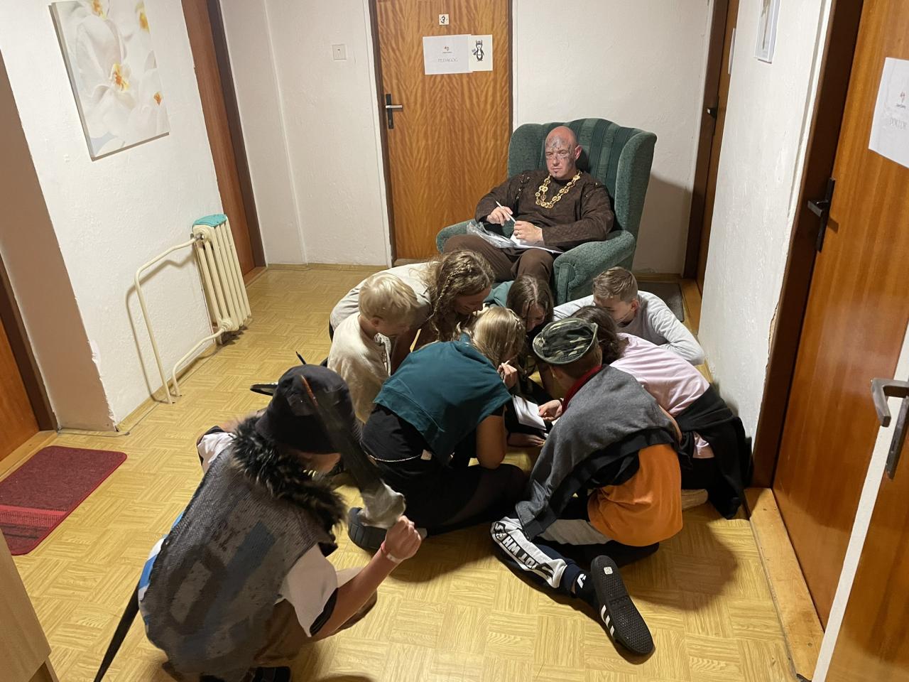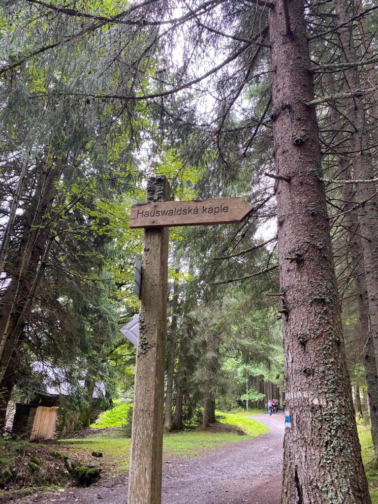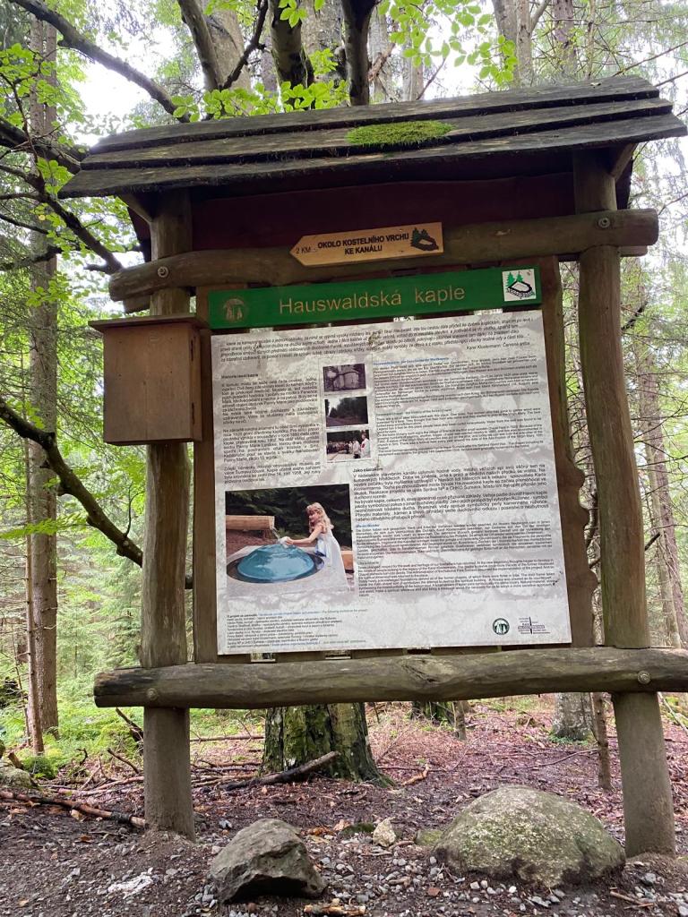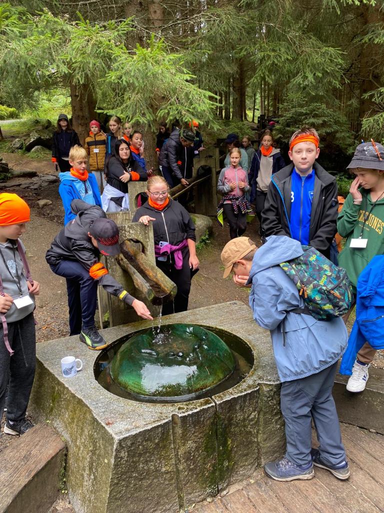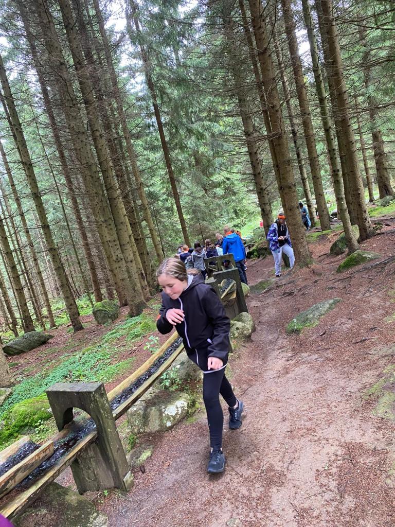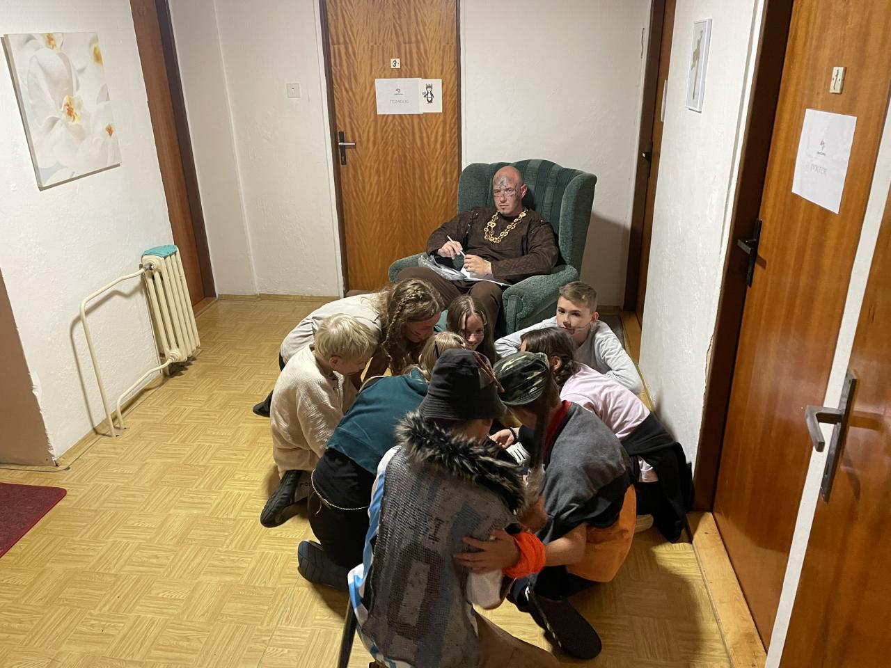 Během rána a dopoledne několikrát pršelo. Zůstali jsme v jídelně a každý si vyrobil ze samotvrdnoucí hmoty přívěsek s runou, což je vikinské písmo. K němu jsme si upletli z vlny šňůrku jako copánek. Nezvládl to úplně každý, ale díky pomoci spolužaček a paní učitelek ji budou mít nakonec všichni. Vyčasilo se, takže paní ředitelka zavelela ke krátkému výšlapu, cílem byla Hauswaldská kaple. Šli jsme kolem Vchynicko-tetovského kanálu s průzračnou vodou a pstruhy, lesem úplně zarostlým mechem, potkali jsme spoustu turistů a cyklistů, obdivovali (a někteří kalili) vodu tekoucí od pramene dřevěnými žlaby až ke krásnému pítku, to vše za slunečného počasí. Vrátili jsme se za pět minut dvanáct rovnou k obědu. Odpoledne se děti věnovaly aktivitám připraveným agenturou, hrály hry, soutěžily, plavily se na včera vyrobených lodích, fotily scénky ze života vikinského lidu.