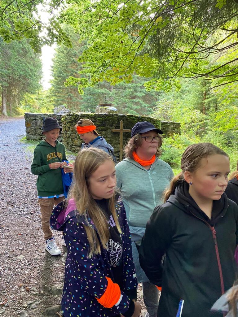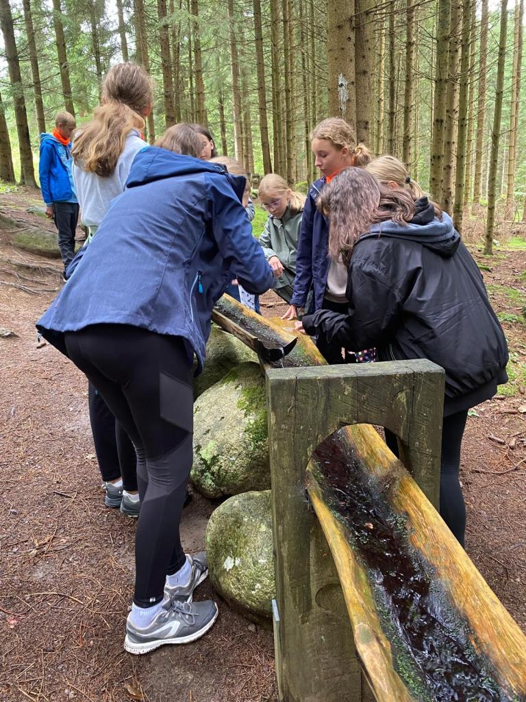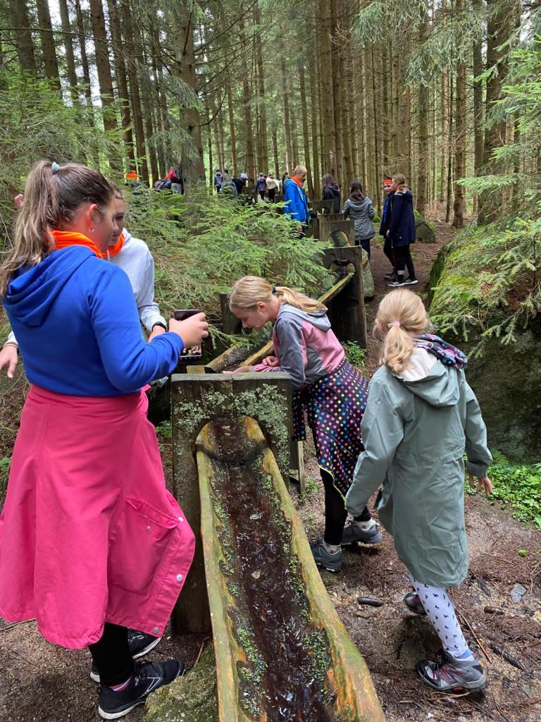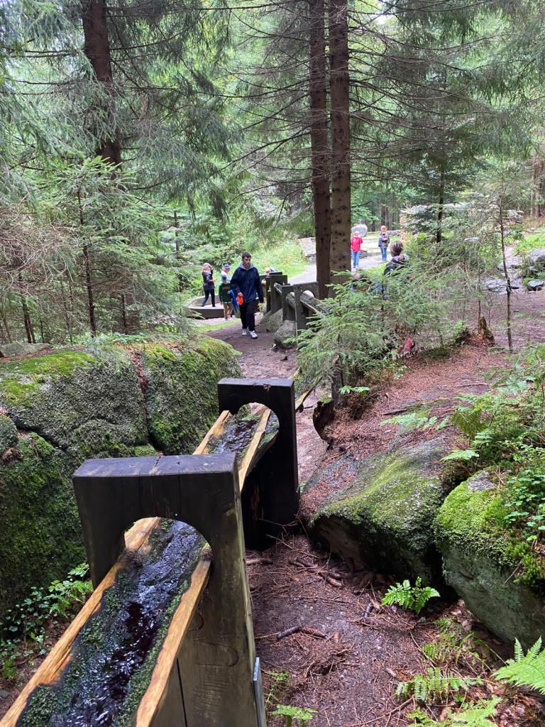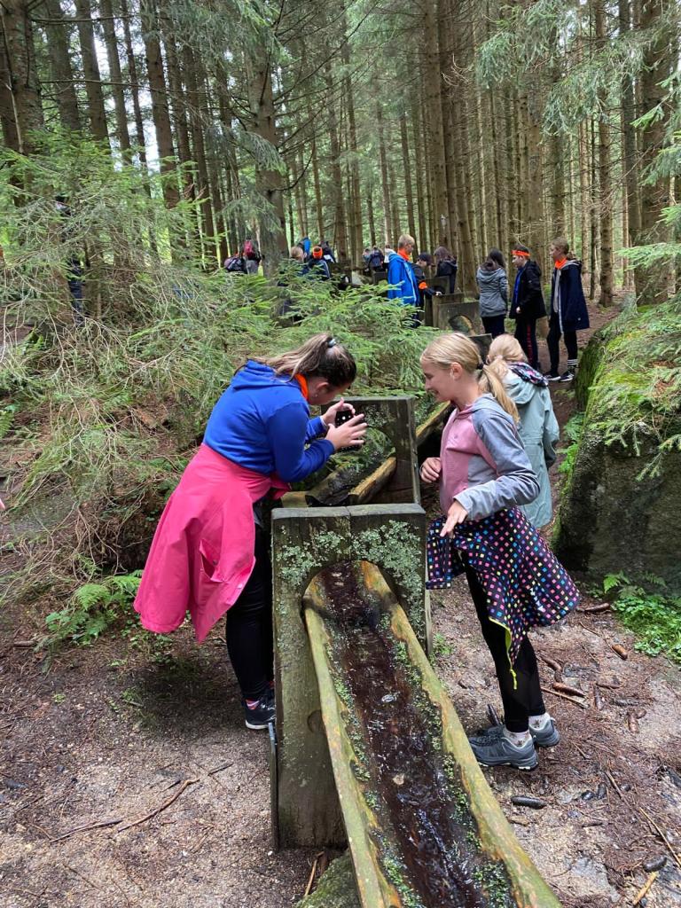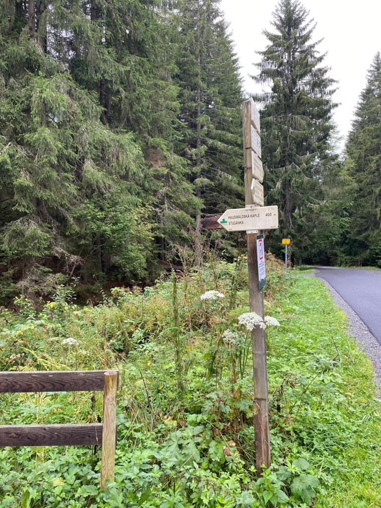 Během rána a dopoledne několikrát pršelo. Zůstali jsme v jídelně a každý si vyrobil ze samotvrdnoucí hmoty přívěsek s runou, což je vikinské písmo. K němu jsme si upletli z vlny šňůrku jako copánek. Nezvládl to úplně každý, ale díky pomoci spolužaček a paní učitelek ji budou mít nakonec všichni. Vyčasilo se, takže paní ředitelka zavelela ke krátkému výšlapu, cílem byla Hauswaldská kaple. Šli jsme kolem Vchynicko-tetovského kanálu s průzračnou vodou a pstruhy, lesem úplně zarostlým mechem, potkali jsme spoustu turistů a cyklistů, obdivovali (a někteří kalili) vodu tekoucí od pramene dřevěnými žlaby až ke krásnému pítku, to vše za slunečného počasí. Vrátili jsme se za pět minut dvanáct rovnou k obědu. Odpoledne se děti věnovaly aktivitám připraveným agenturou, hrály hry, soutěžily, plavily se na včera vyrobených lodích, fotily scénky ze života vikinského lidu.