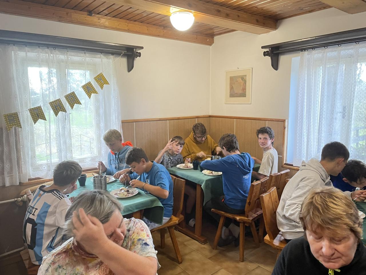 Dnes ráno a dopoledne pršelo, tak jsme zůstali v jídelně. Potom jsme šli ven. Odpoledne jsme byli jenom venku, bylo krásně. K večeři byly borůvkové knedlíky. Máme se dobře.