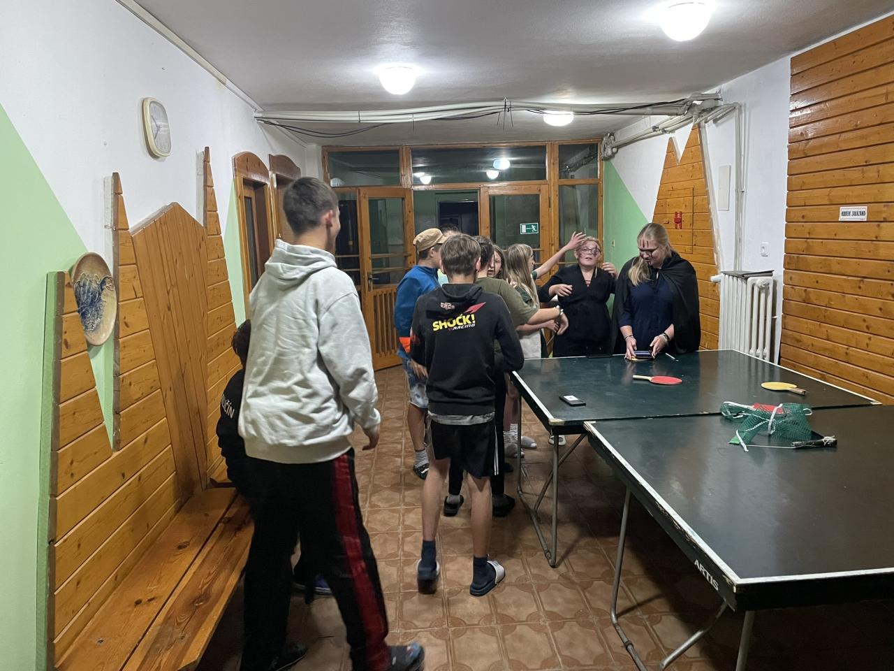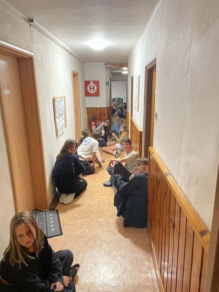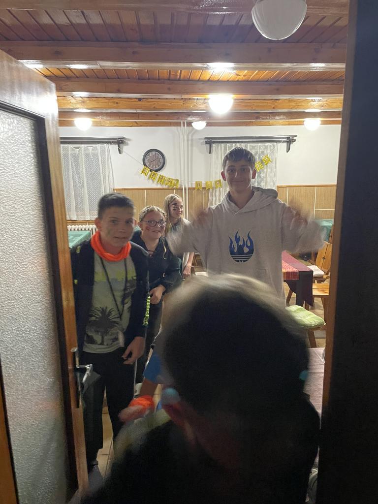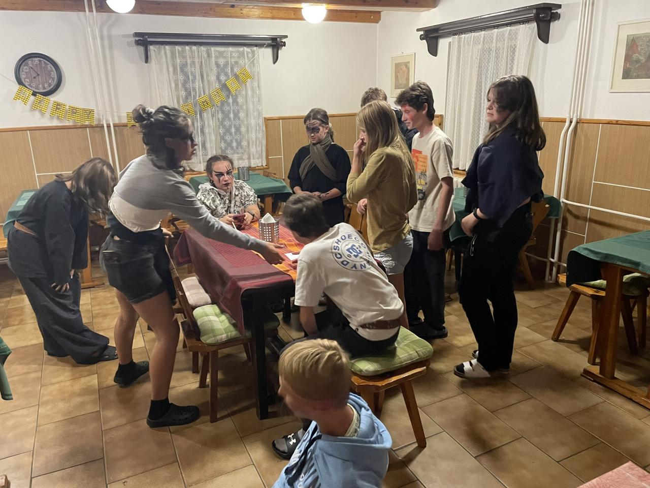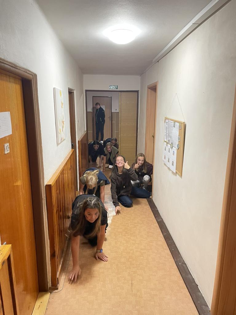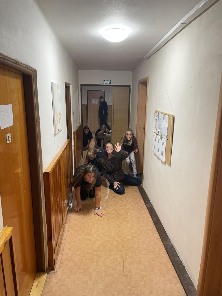 Po večeři se soutěžilo ve čtyřech skupinách v prostorách chaty od sklepa až po půdu. Kvůli nebezpečnému hlídači bylo nejvýhodnější lézt po čtyřech nebo se plazit. Úplně všechny úkoly splnila pouze jedna skupina, takže si mohla jako první vybrat nové barevné batůžky; ostatní přišli na řadu až podle dalšího umístění. Všichni se musí dobře vyspat na zítřejší túru, ale zejména hoši jsou na tom s usínáním hůř než včera. Snad si přesto na zítřek řádně odpočinou.