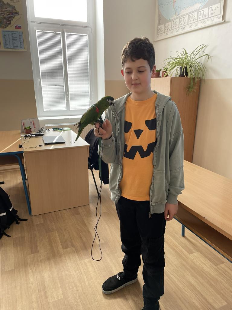 V pondělí 10.2. jsme uskutečnili netradiční třídnickou hodinu. Ta začala již v hodině přírodopisu, kdy jsme si po prázdninách sdělili naše dojmy a zážitky a sdíleli je v komunitním kruhu. Poté jsme si udělali dotazník spokojenosti dětí ve třídě a poté již čekal děti tematický blok k výuce ptáků, které aktuálně probíráme. Prezentace se ujmul J. Homola, který nám nejprve teoreticky představil chov papouška Ary červenoramenné včetně toho, jak ji naučit mluvit nebo provádět různé triky na pokyn. Poté již následoval pomyslný zlatý hřeb, kdy ve spolupráci s rodiči „přilétla“ Ara i k nám do třídy. Touto cestou děkuji za realizaci této netradiční akce. Hlas papouška byl slyšet už při příchodu do školy, což některé žáky z jiných tříd rozrušilo, protože o návštěvě Ary neměli ponětí. Papoušek naštěstí neměl ostych před tak širokým publikem, takže nám ukázal, co všechno umí, včetně slušného „Nazdar“ při příchodu dveřmi. Někteří využili i možnost si jej pohladit, dát na ruku, či si s ním popovídat. Čas rychle utekl a plní nových informací a dojmů jsme vyrazili do hodiny výtvarné výchovy.